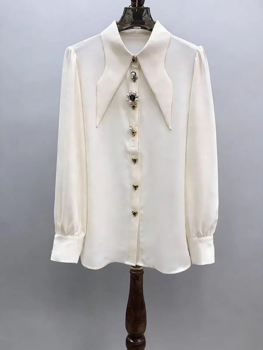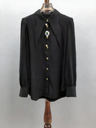 Refined elegance meets timeless sophistication in the Trend4us Elegant Jewel-Button Pointed Collar Long-Sleeve Blouse. Designed with a graceful drape and a polished silhouette, this blouse features a sharp pointed collar that frames the neckline with tailored precision. The statement jewel buttons—adorned with lustrous pearls and crystal accents—add a couture-inspired touch, elevating this classic piece into a true luxury essential.