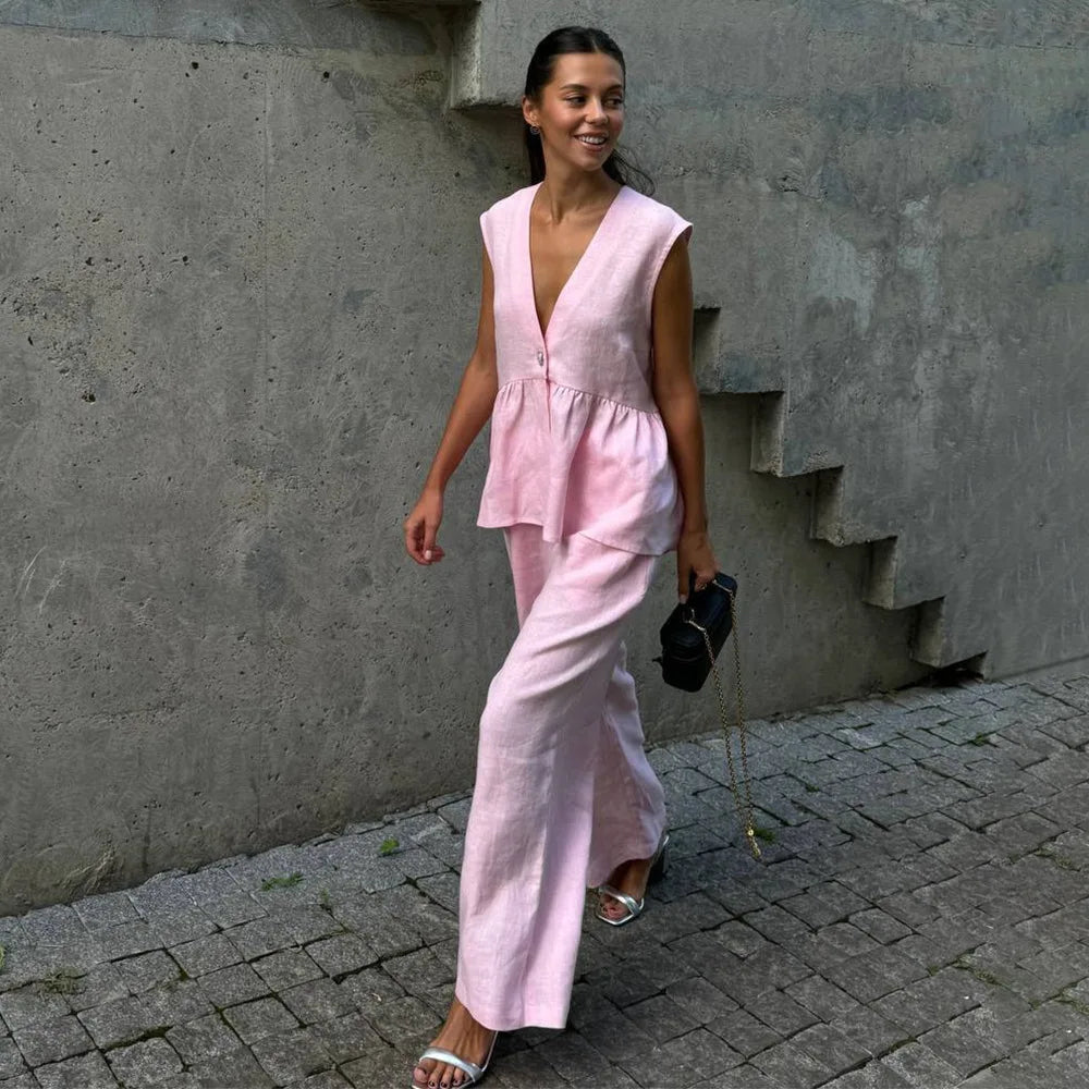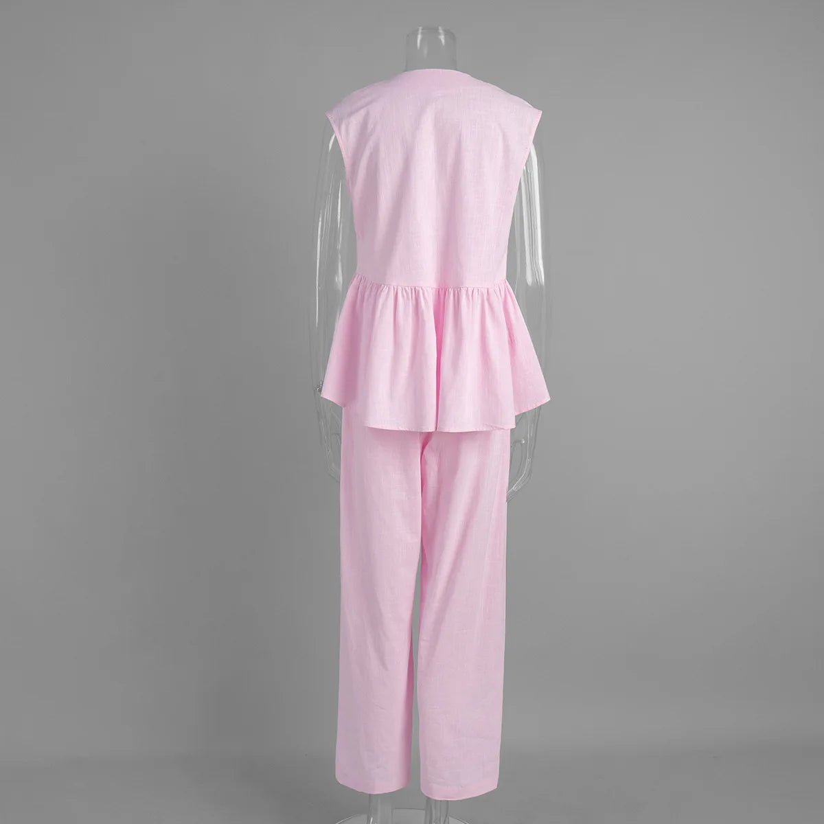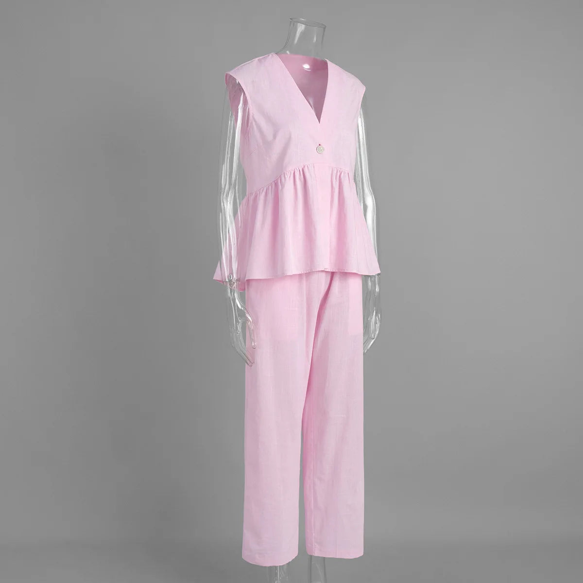 Picture yourself walking into a room wearing this stunning set—the peplum top gracefully highlighting your waist while the wide-leg pants flow with every step, creating an effortlessly chic silhouette. Whether you're heading to a business meeting, brunch with friends, or a special occasion, this set ensures you look polished and feel confident. The breathable cotton fabric keeps you comfortable all day, while the thoughtful design flatters every body type, making this piece your go-to for years to come.