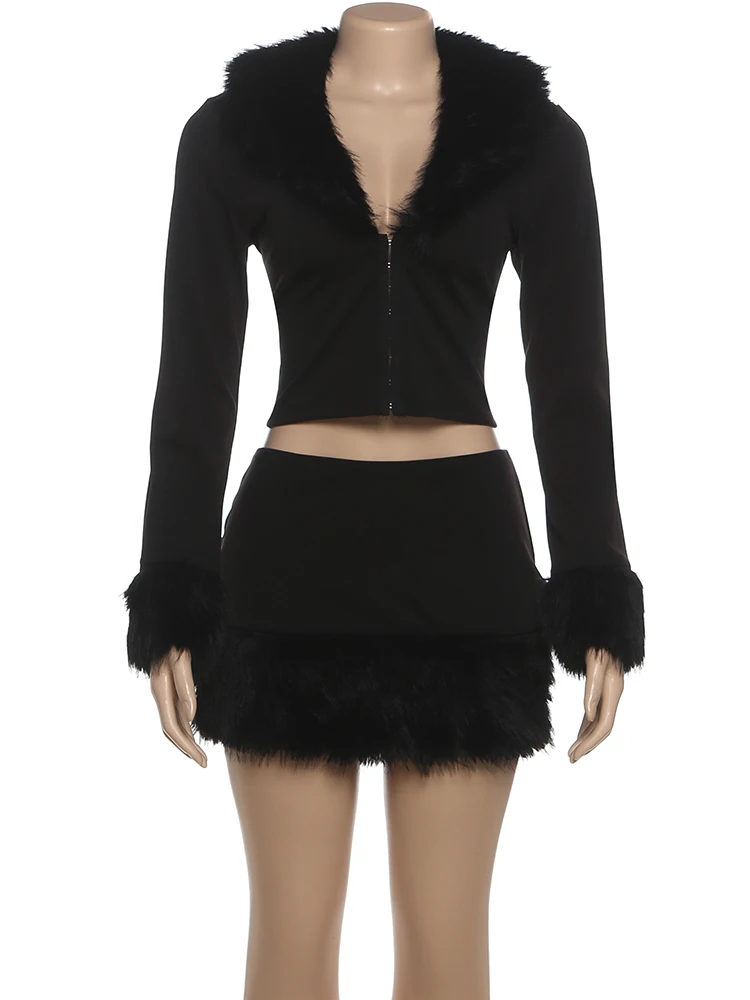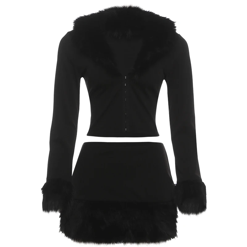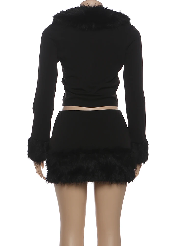 Trend4us Faux Fur Trim Zip-Up Crop Jacket & Mini Skirt Set