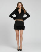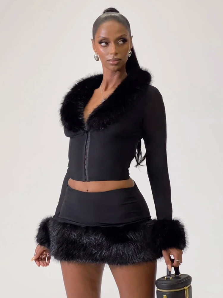 Turn heads in unapologetic glam with the Trend4us Faux Fur Trim Zip-Up Crop Jacket & Mini Skirt Set — a bold, statement-making two-piece designed for nights that demand attention. This sleek set features a fitted zip-up cropped jacket trimmed with plush faux fur along the neckline and cuffs, paired with a matching high-waisted mini skirt finished with a soft faux fur hem for elevated drama.