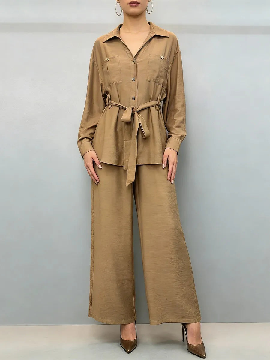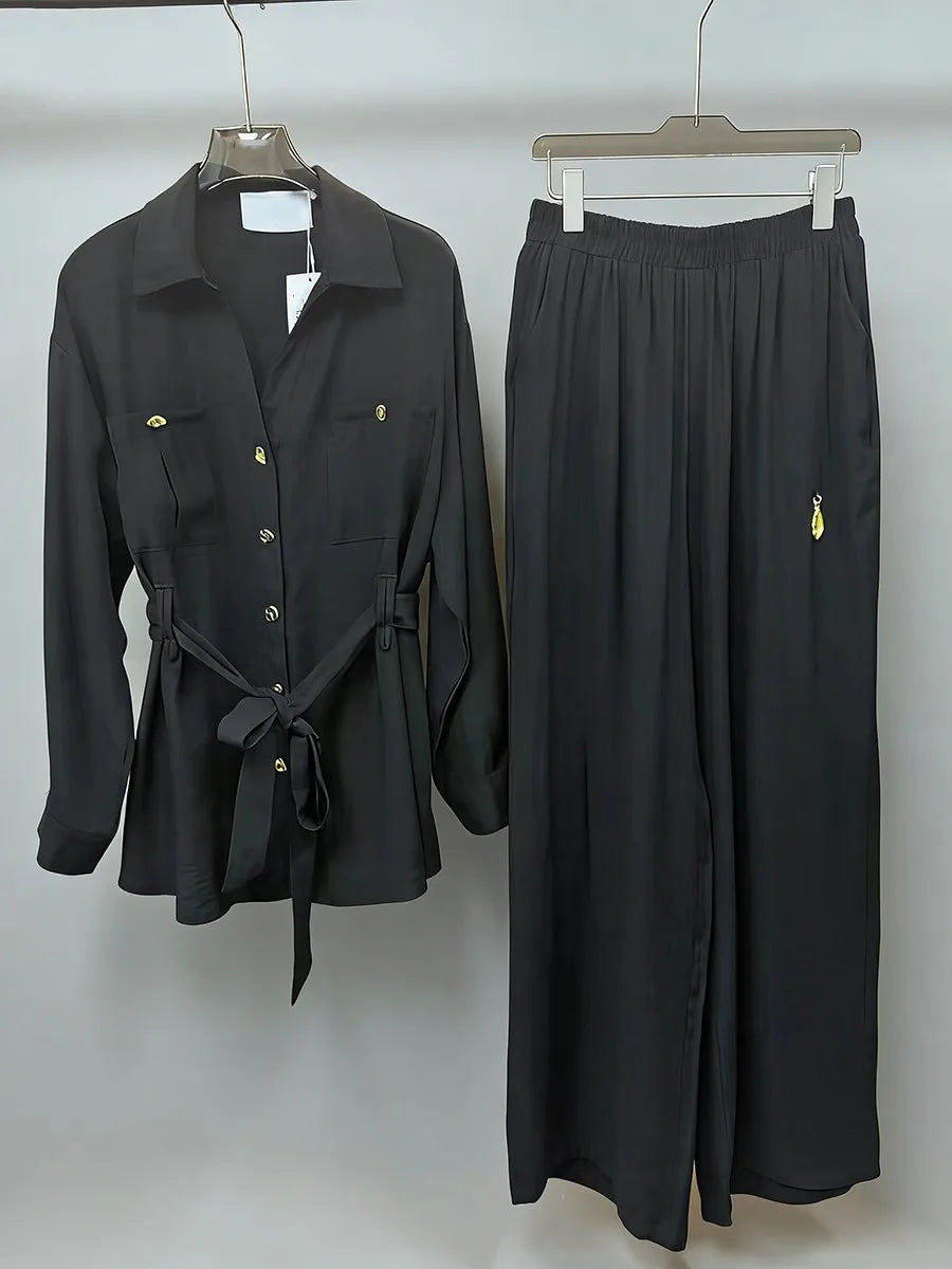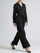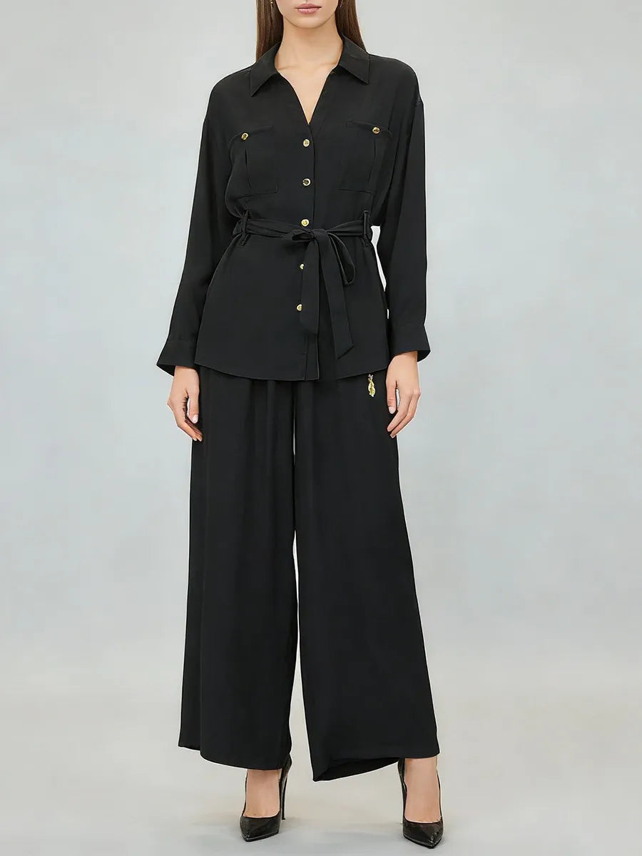 The button-front blouse features a classic collar, gold-tone buttons, and a removable self-tie belt that cinches the waist for a flattering, tailored silhouette. Paired with high-waisted wide-leg pants, the look elongates the legs and moves gracefully with every step. Subtle utility-inspired pocket detailing adds a contemporary edge, making this set equally suited for professional settings and elevated evenings.
