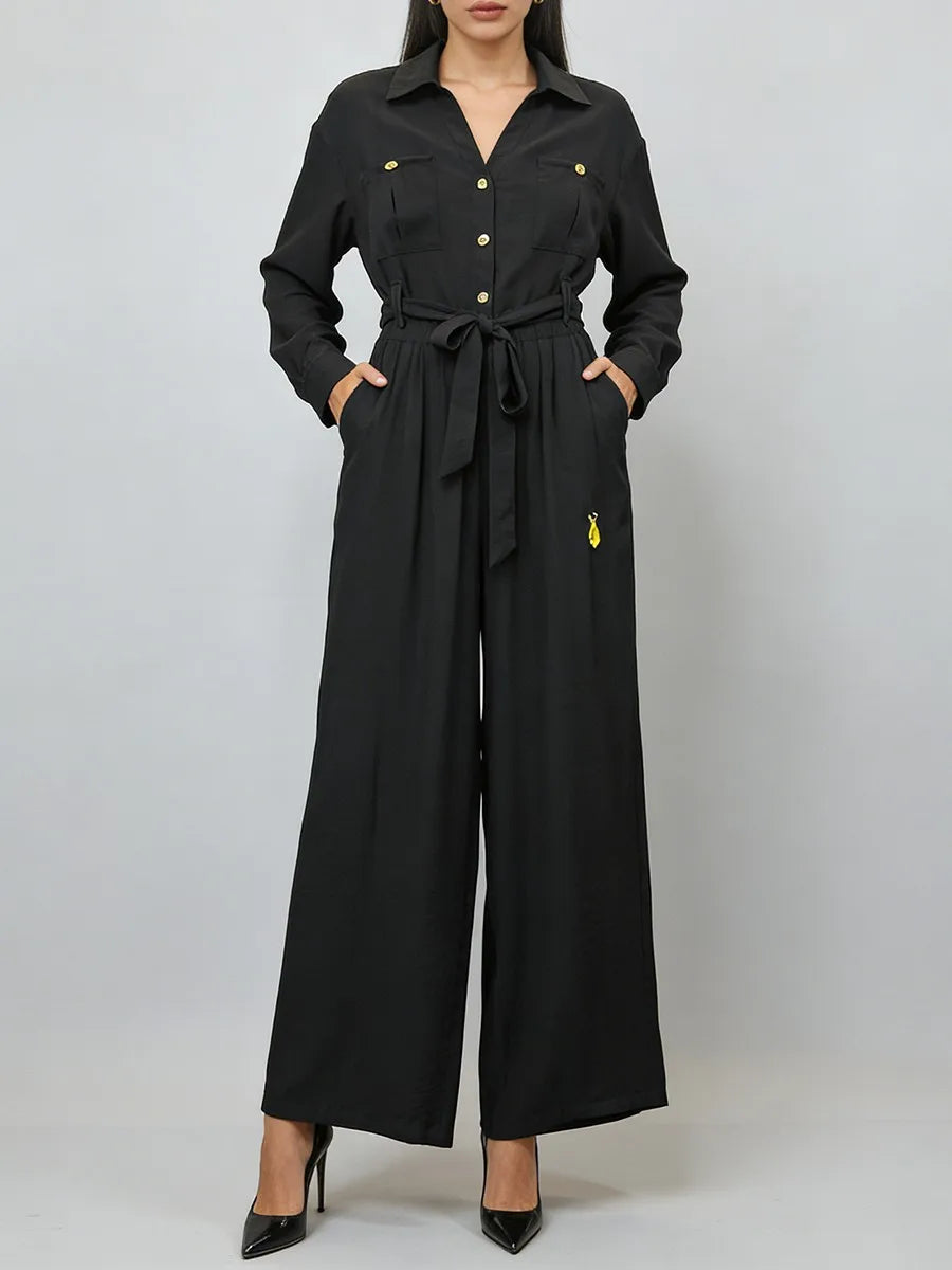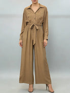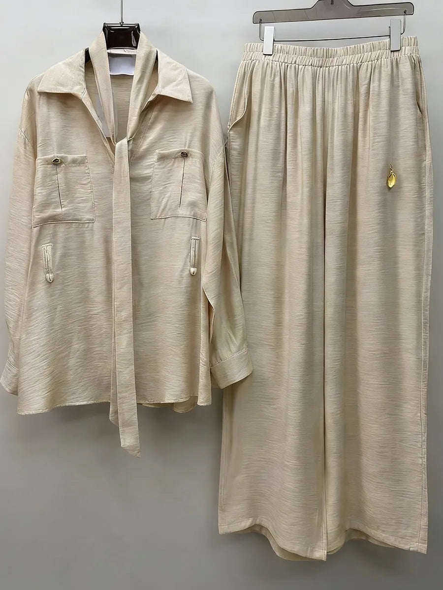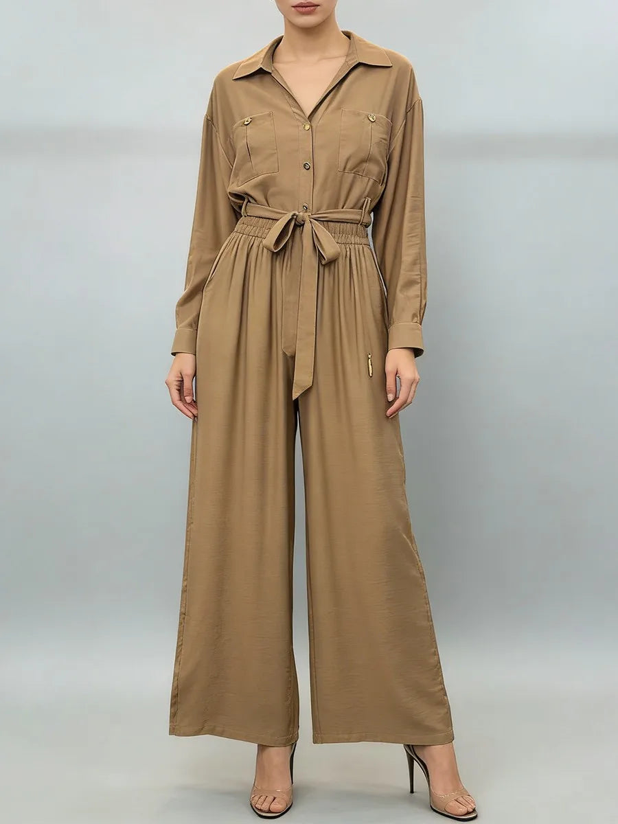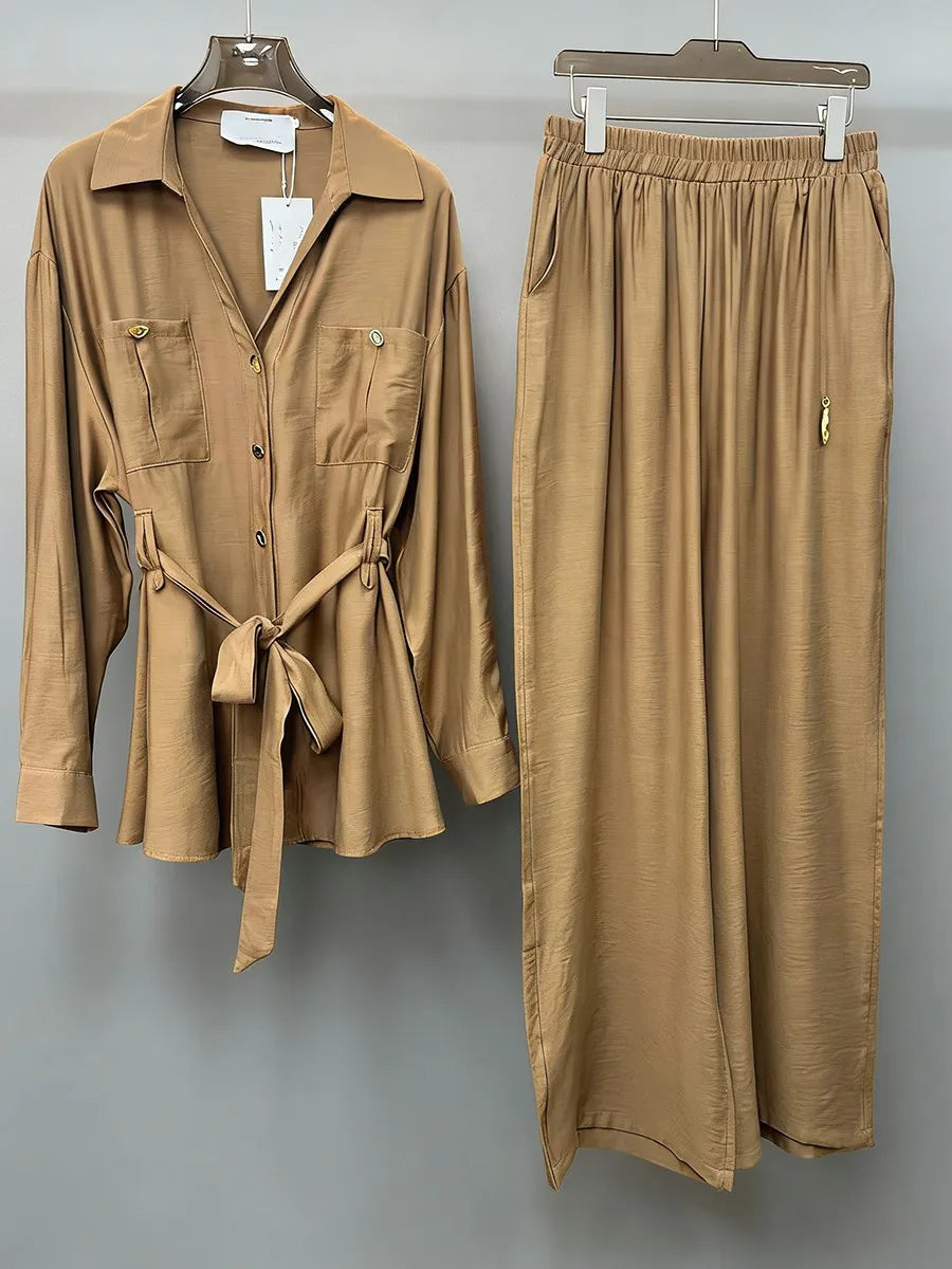 The button-front blouse features a classic collar, gold-tone buttons, and a removable self-tie belt that cinches the waist for a flattering, tailored silhouette. Paired with high-waisted wide-leg pants, the look elongates the legs and moves gracefully with every step. Subtle utility-inspired pocket detailing adds a contemporary edge, making this set equally suited for professional settings and elevated evenings.