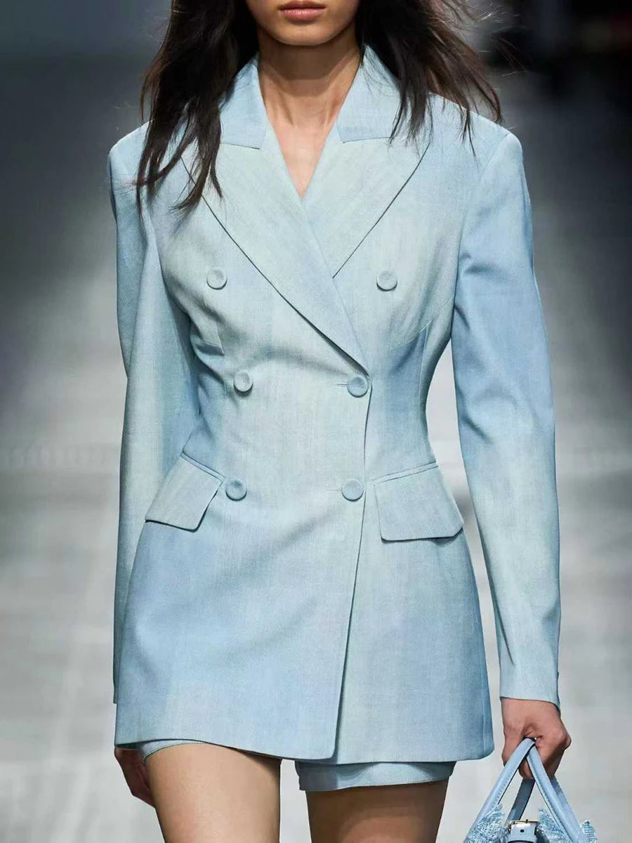 The double-breasted blazer features a refined lapel collar, sculpted waist shaping, and covered buttons that deliver a clean, couture-inspired finish. Paired with matching high-waisted tailored shorts, the look feels confident yet playful—perfect for warm-weather styling without sacrificing polish.