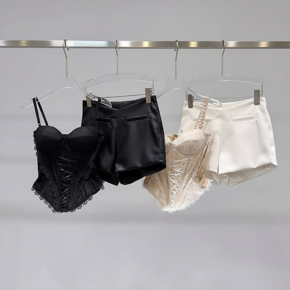 Bold romance meets modern edge in the Trend4us Luxe Lace Corset & Leather Shorts Set. This striking two-piece pairs a delicately structured lace corset with sleek leather-look shorts for a high-impact silhouette that’s equal parts sensual and empowered.