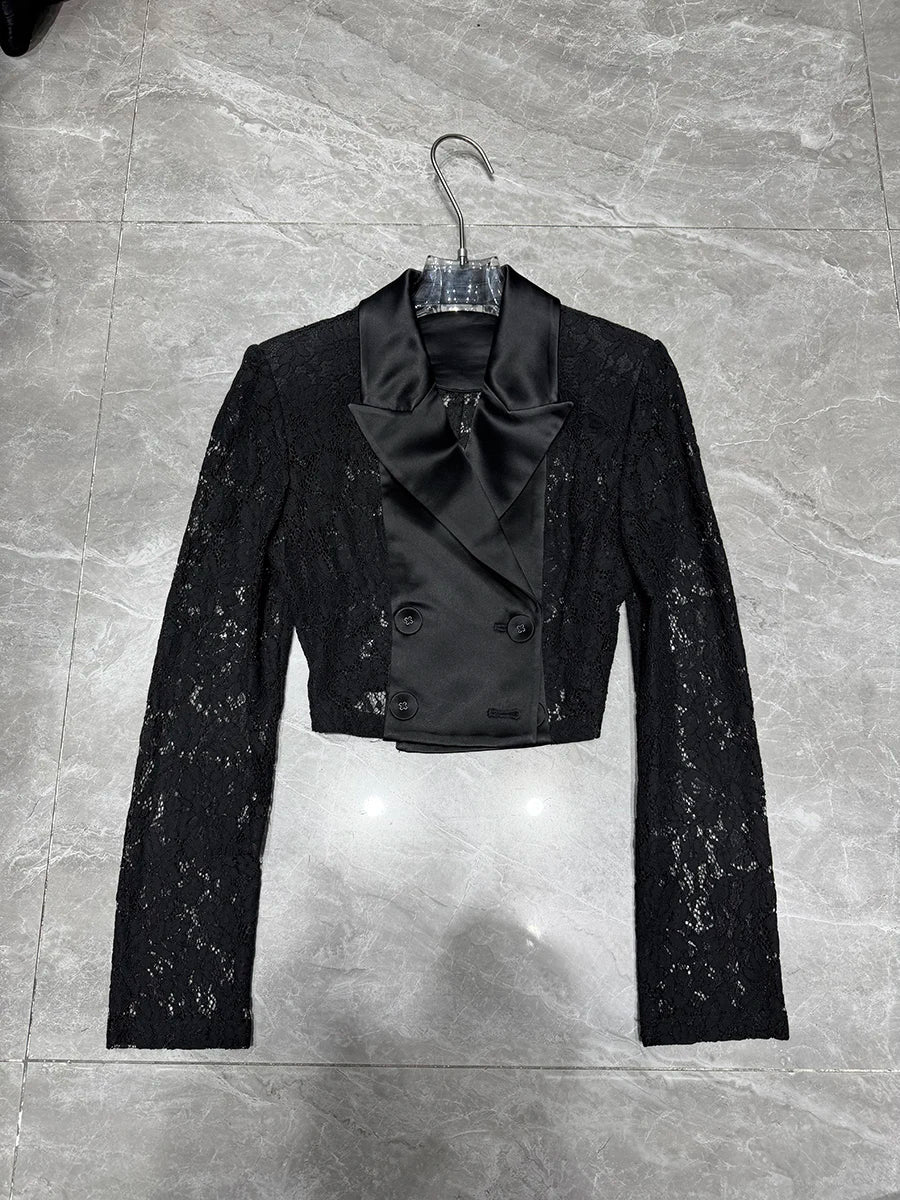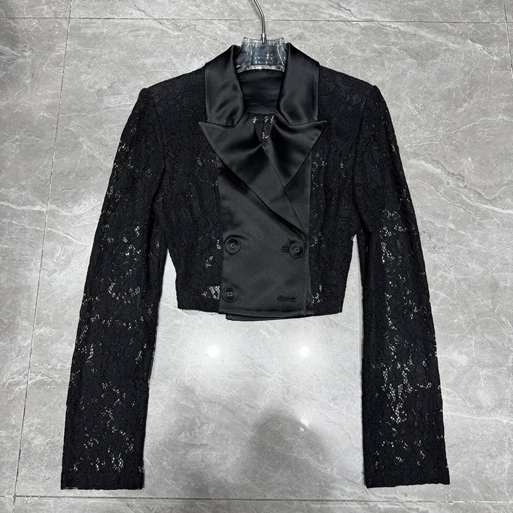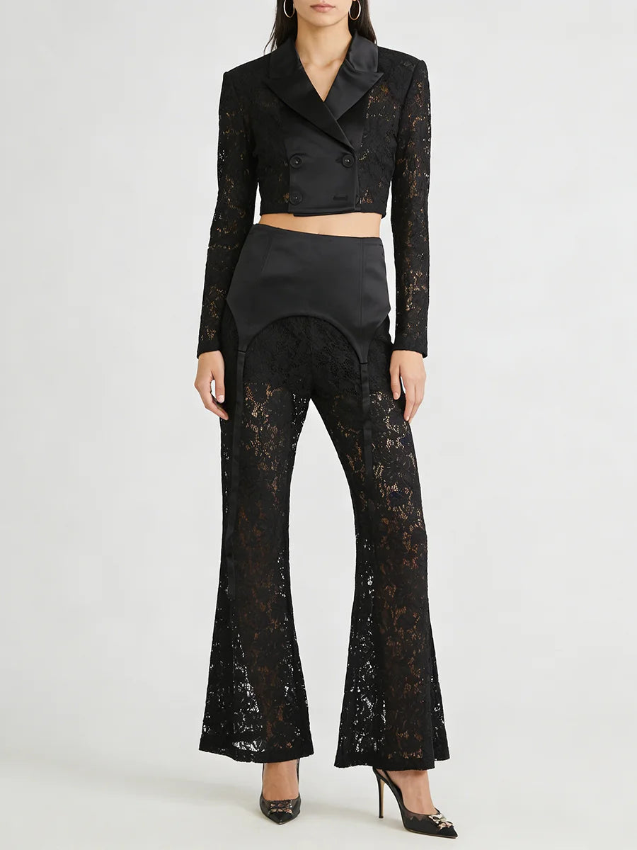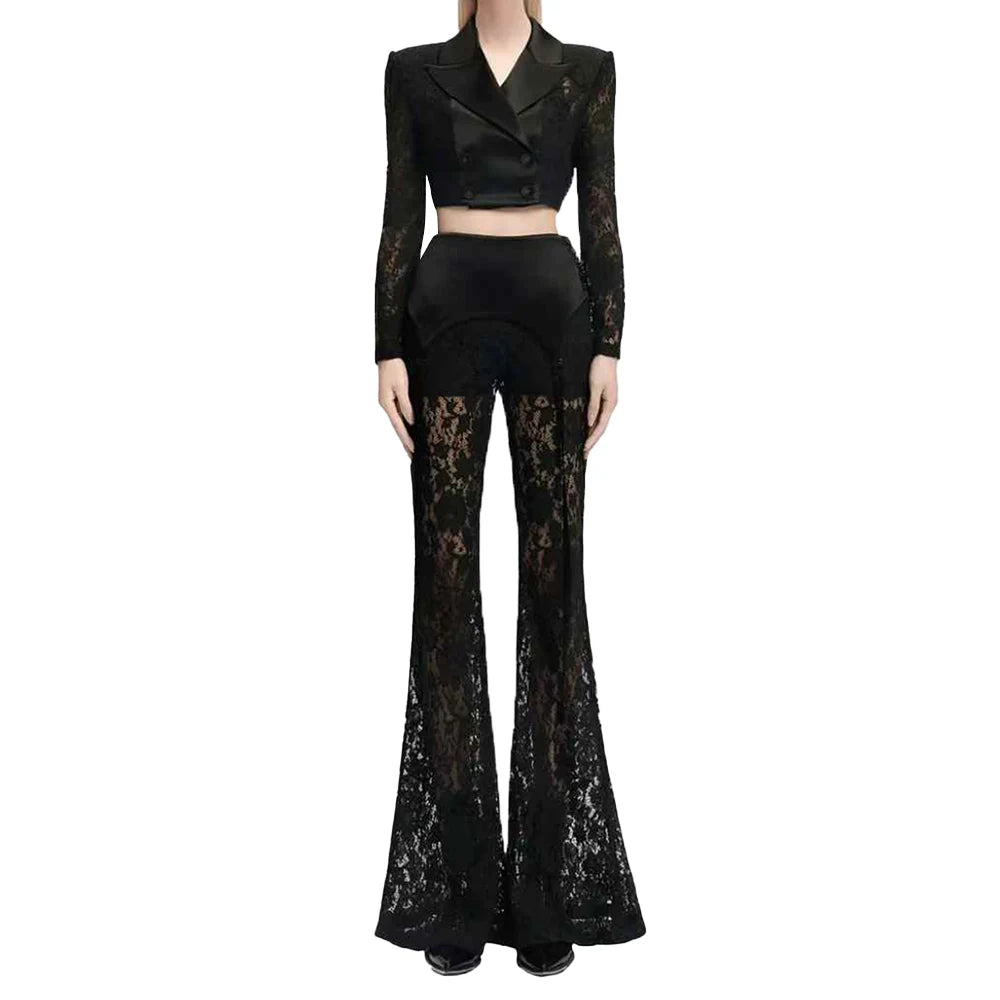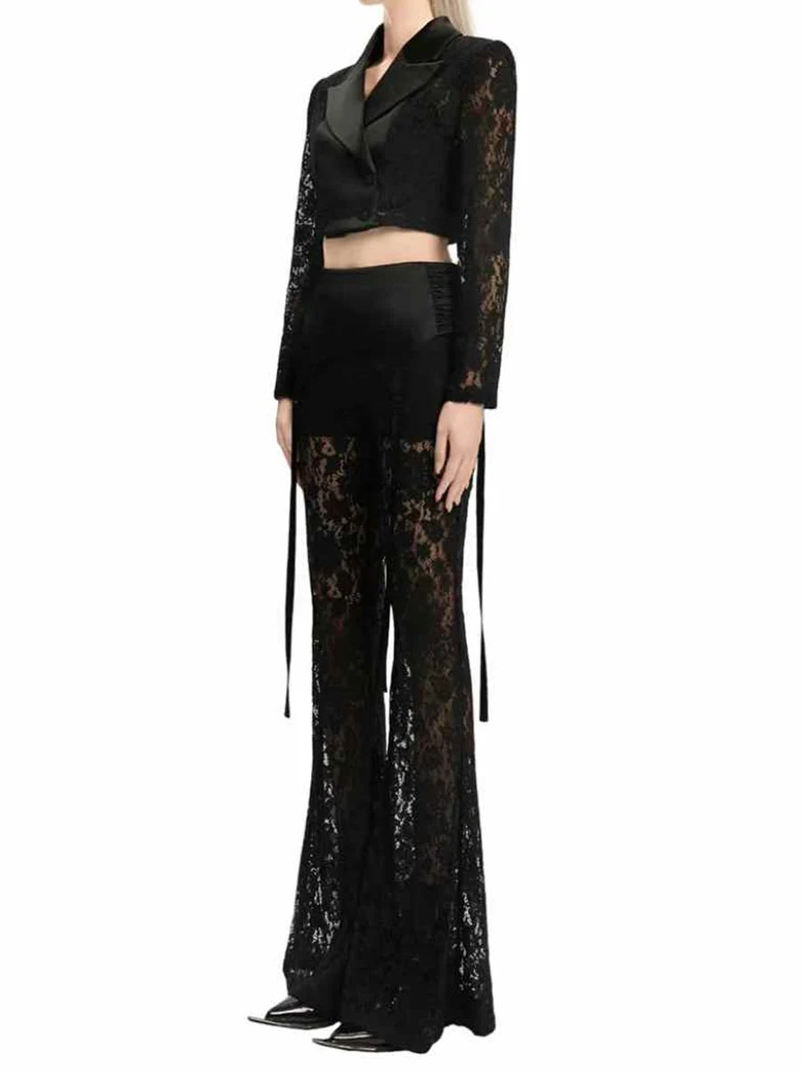 Crafted from premium polyester with refined tailoring, this set transitions seamlessly from boardroom to evening events. The blazer's cropped length creates a modern proportion, while the flare pants elongate the legs with their dramatic wide-leg cut. Intricate lace accents add a touch of romance to the powerful suiting aesthetic, making this the perfect choice for the woman who refuses to choose between strength and femininity.