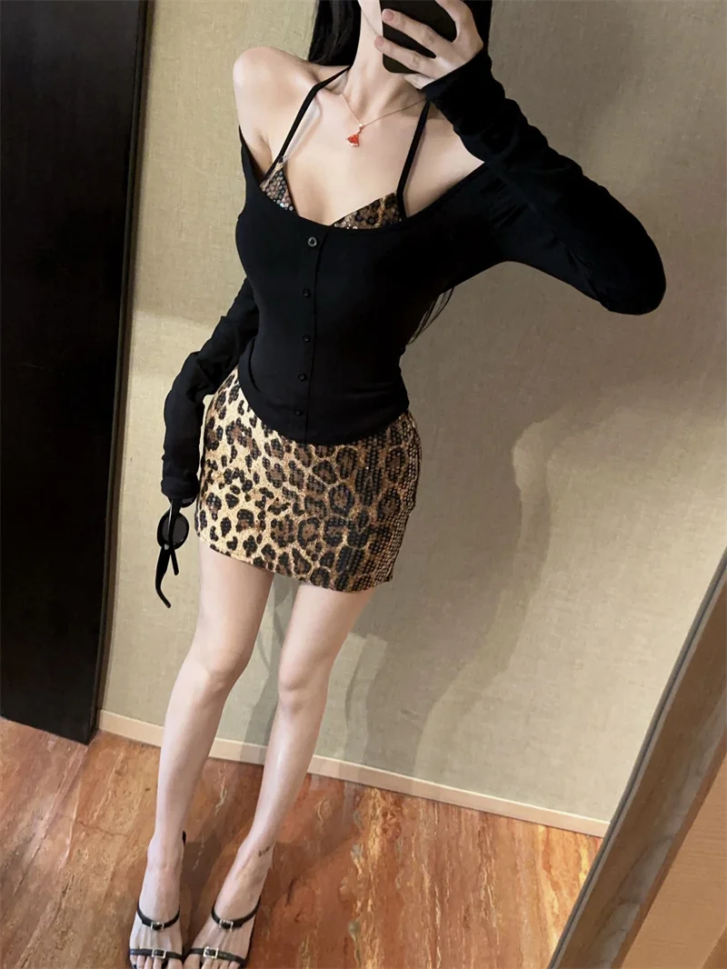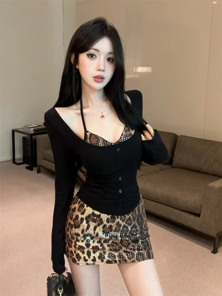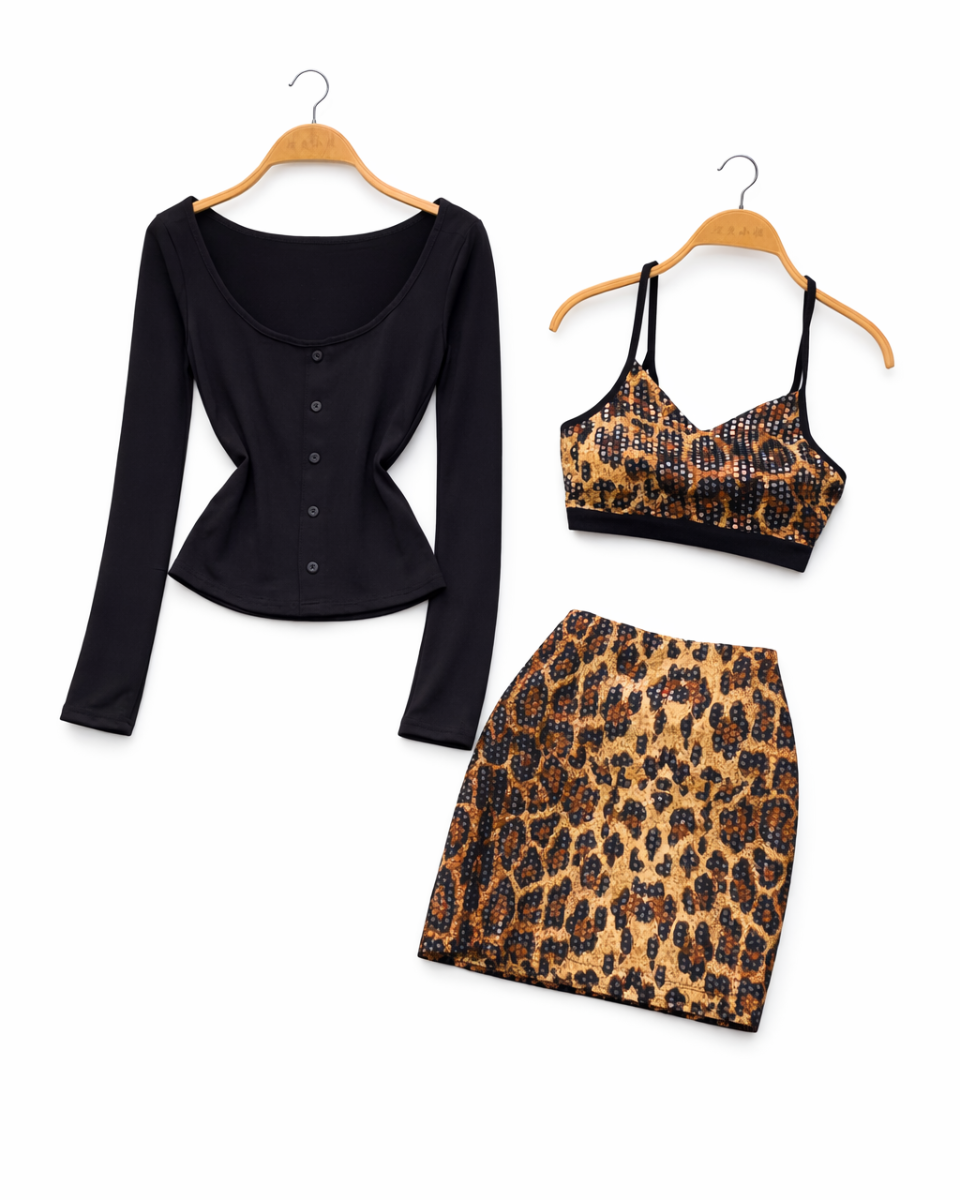 Turn heads and own the spotlight in the Trend4us Luxe Leopard Sequin Bralette & Mini Skirt Three-Piece Set — a bold, high-glam ensemble designed for unforgettable nights. This statement set pairs a sleek long-sleeve fitted top with a shimmering leopard sequin bralette and a matching high-waisted mini skirt, creating the perfect balance of elegance and edge.