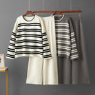 Elevate your cozy-season wardrobe with this luxe striped knit set, featuring a relaxed-fit sweater and matching wide-leg pants. Crafted from a soft, breathable blend for all-day comfort, this ensemble blends timeless stripes with effortless sophistication — perfect for lounging in style or stepping out in modern minimalism.
