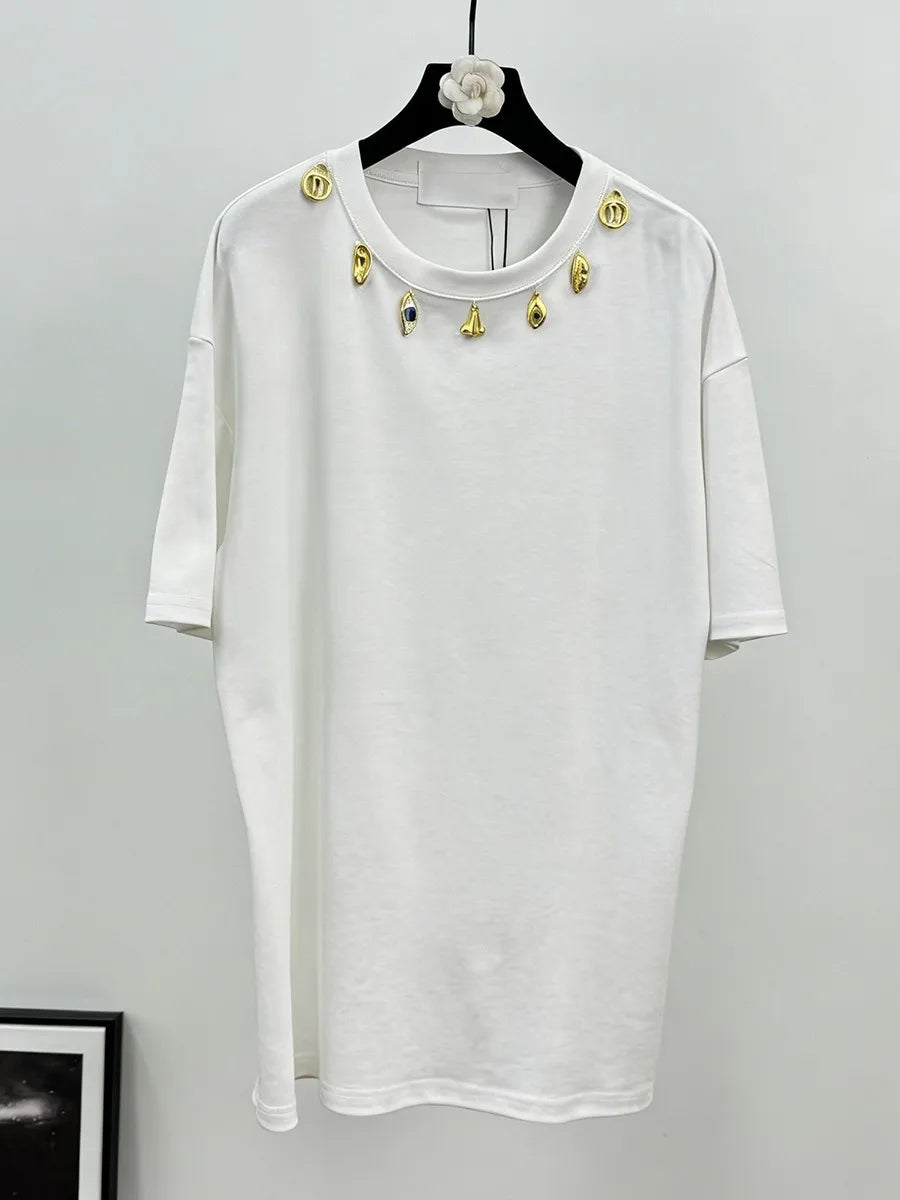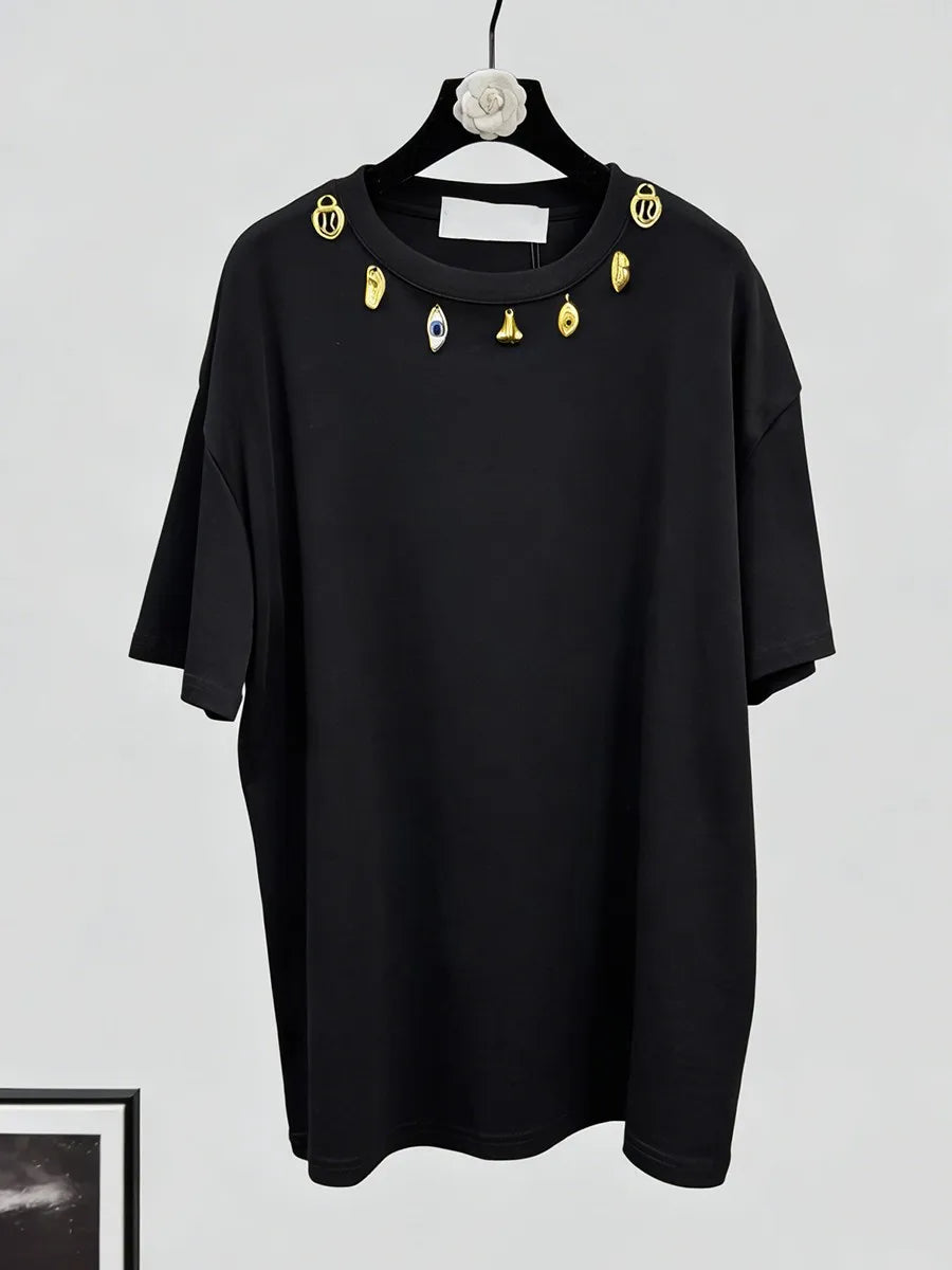 The Trend4us Modern Gold Embellished Oversized Short-Sleeve Tee brings refined luxury to everyday streetwear. Designed with a relaxed oversized silhouette, this elevated tee features modern gold-tone embellishments delicately placed along the neckline, creating a jewelry-inspired statement that instantly upgrades a casual look.