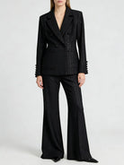 The blazer is expertly cut to sculpt the waist and enhance the silhouette, while classic lapels and refined button details deliver a timeless tailored finish. The matching wide-leg trousers elongate the legs and offer effortless sophistication, making this suit perfect for evening events, formal occasions, parties, and elevated business or fashion-forward styling.
