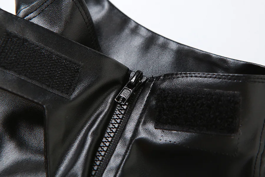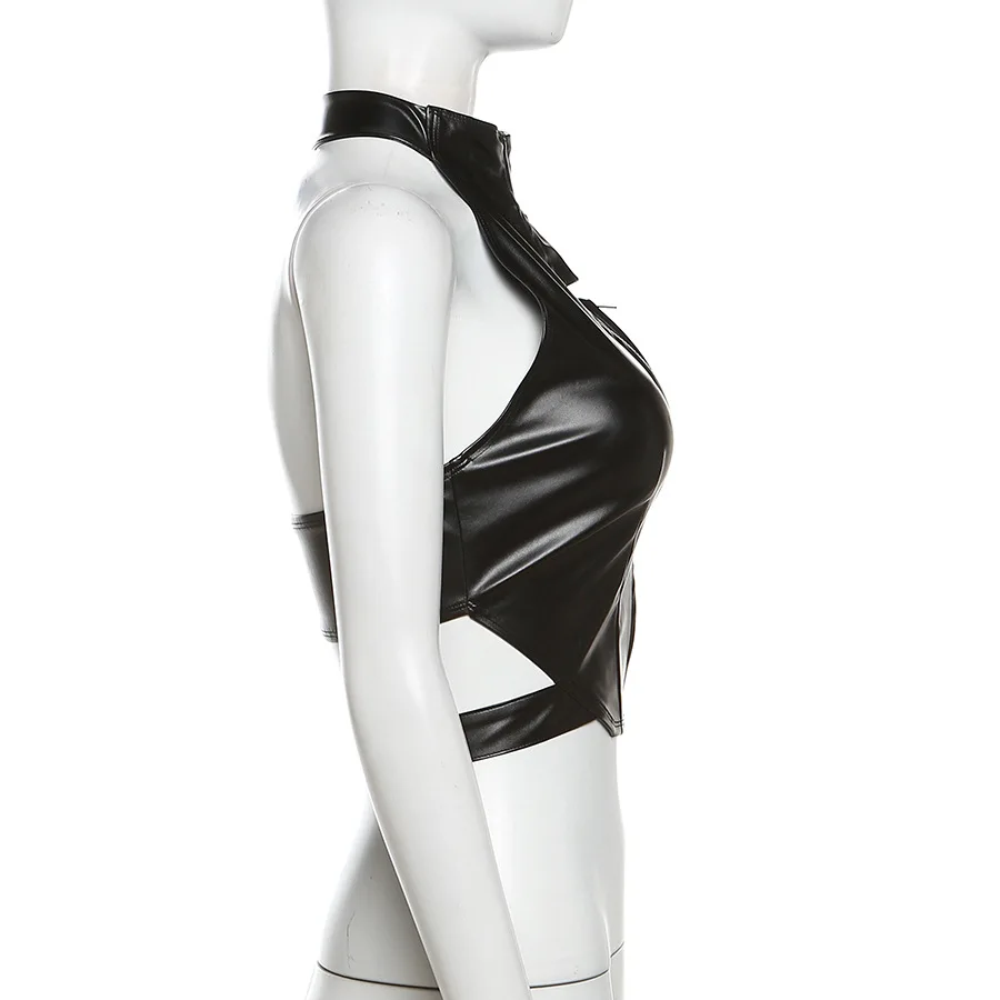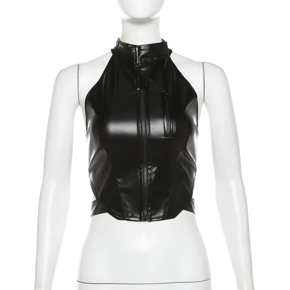 Trend4us Sleek Zip-Front Faux Leather Halter Crop Top