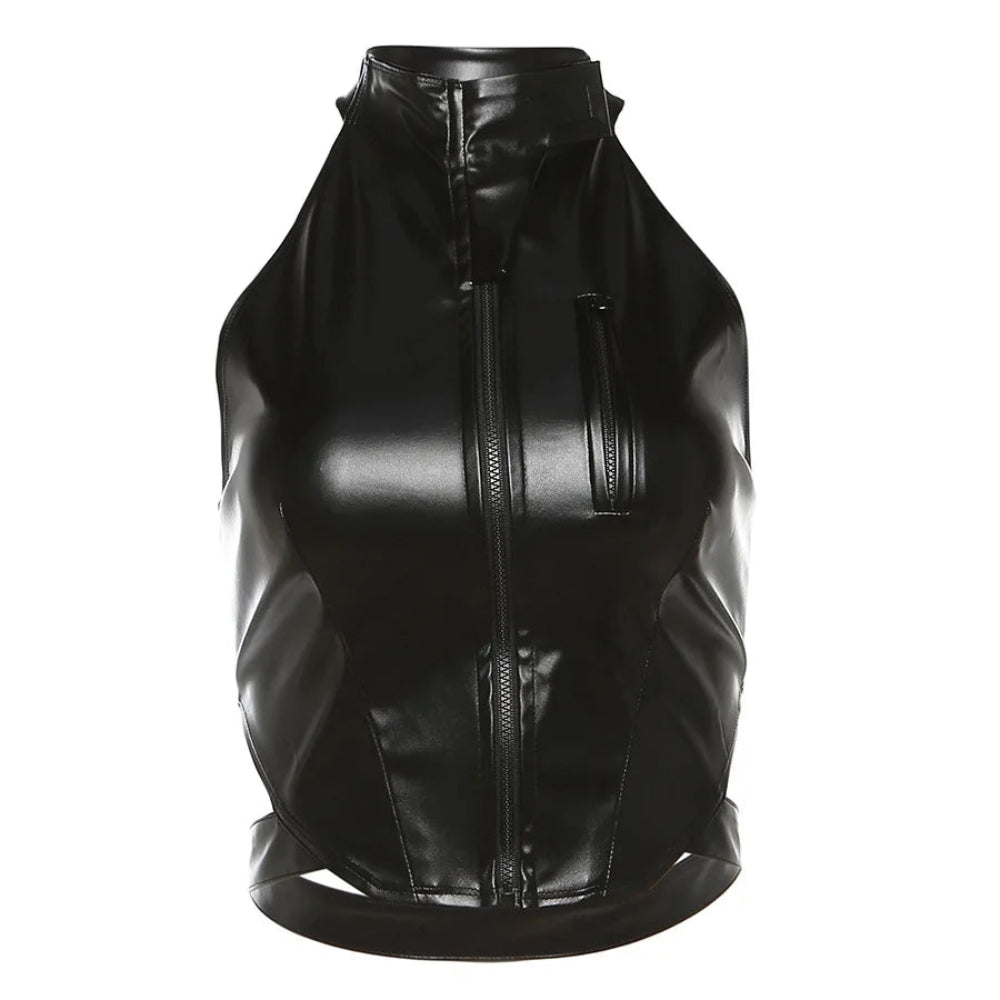 Turn up the edge with the Trend4us Sleek Zip-Front Faux Leather Halter Crop Top — a bold statement piece designed for modern, confident styling. Crafted from smooth, high-shine faux leather, this crop top features a structured halter neckline and a sleek zip-front closure that adds both attitude and versatility.
