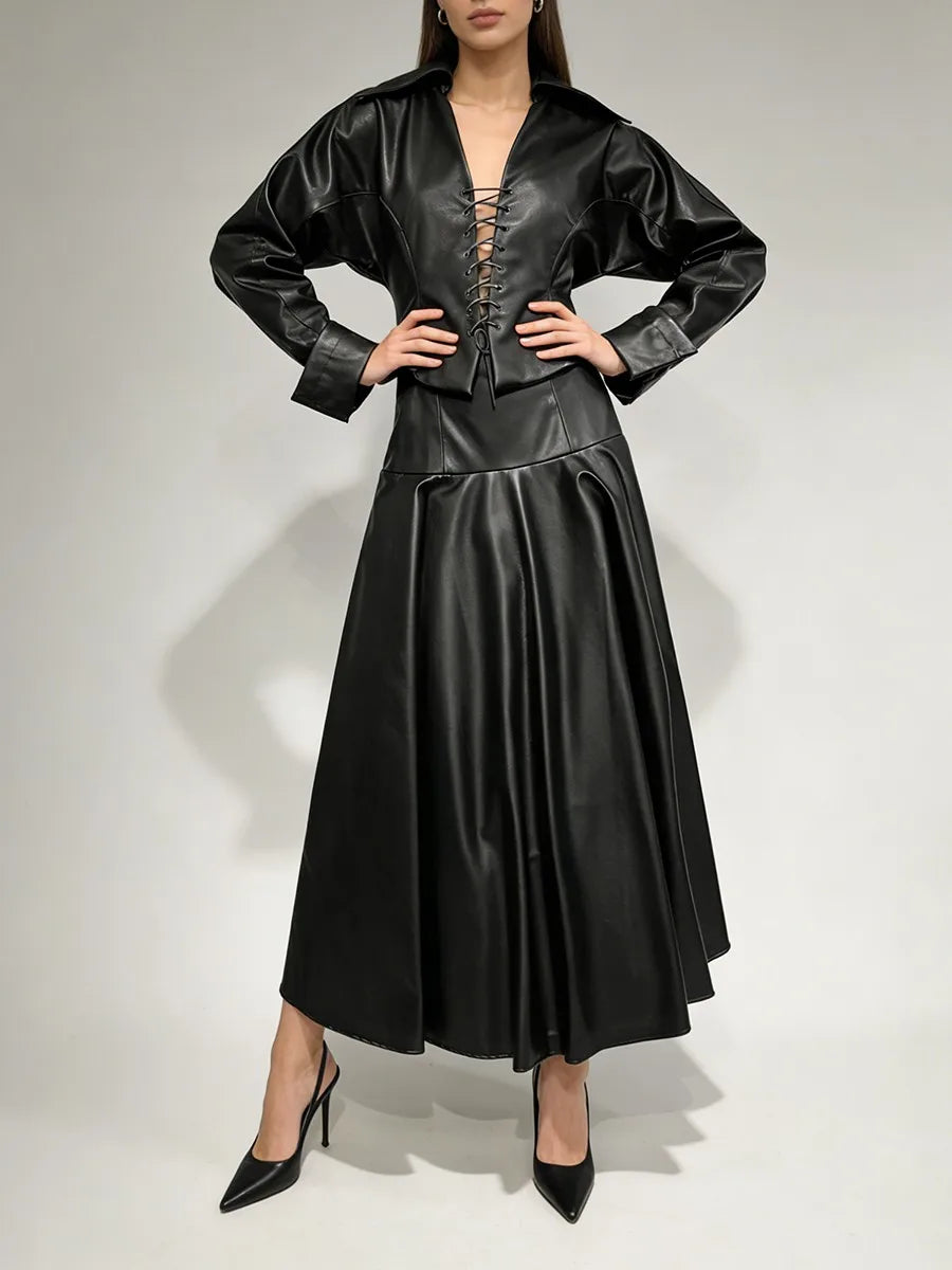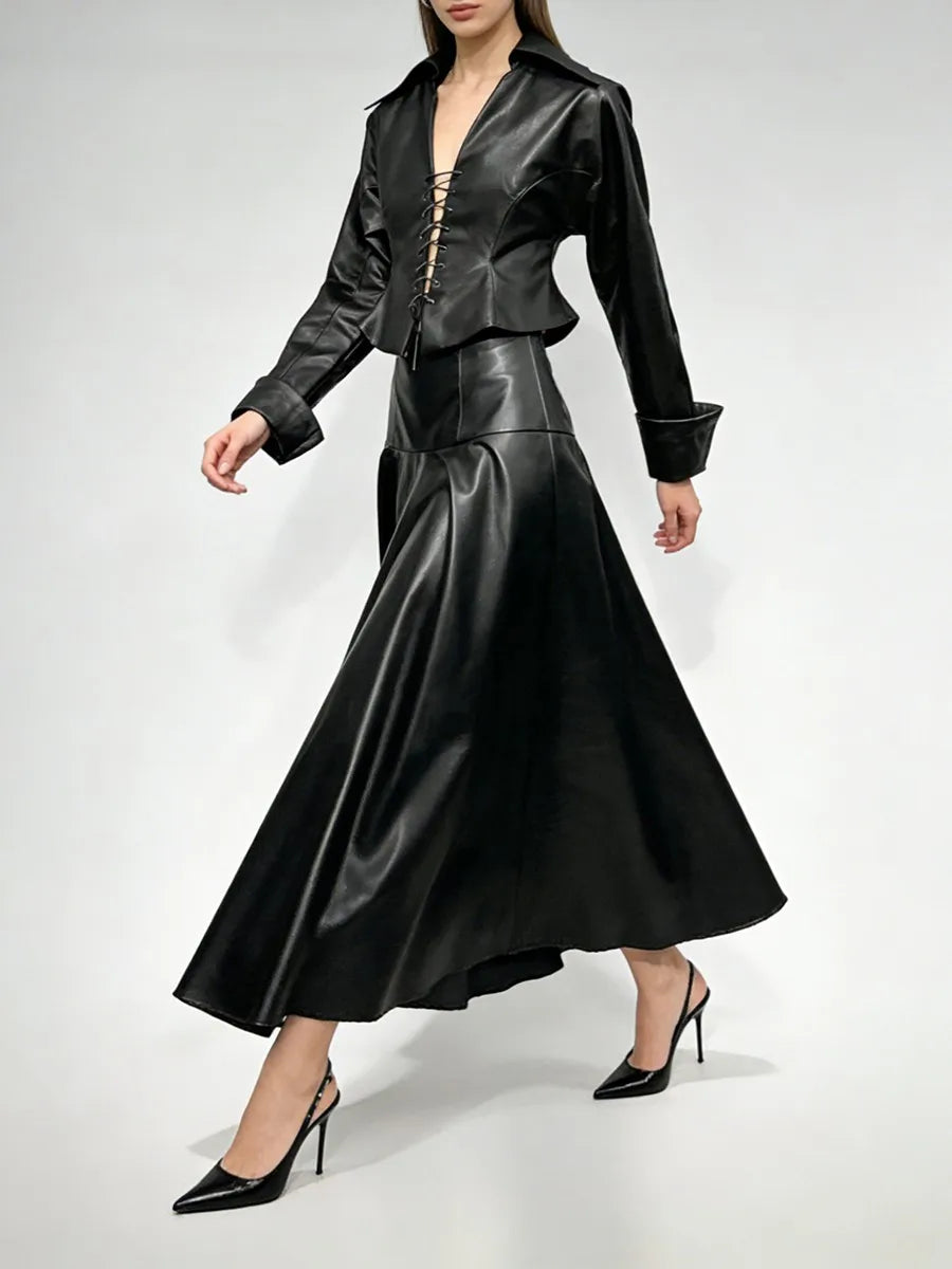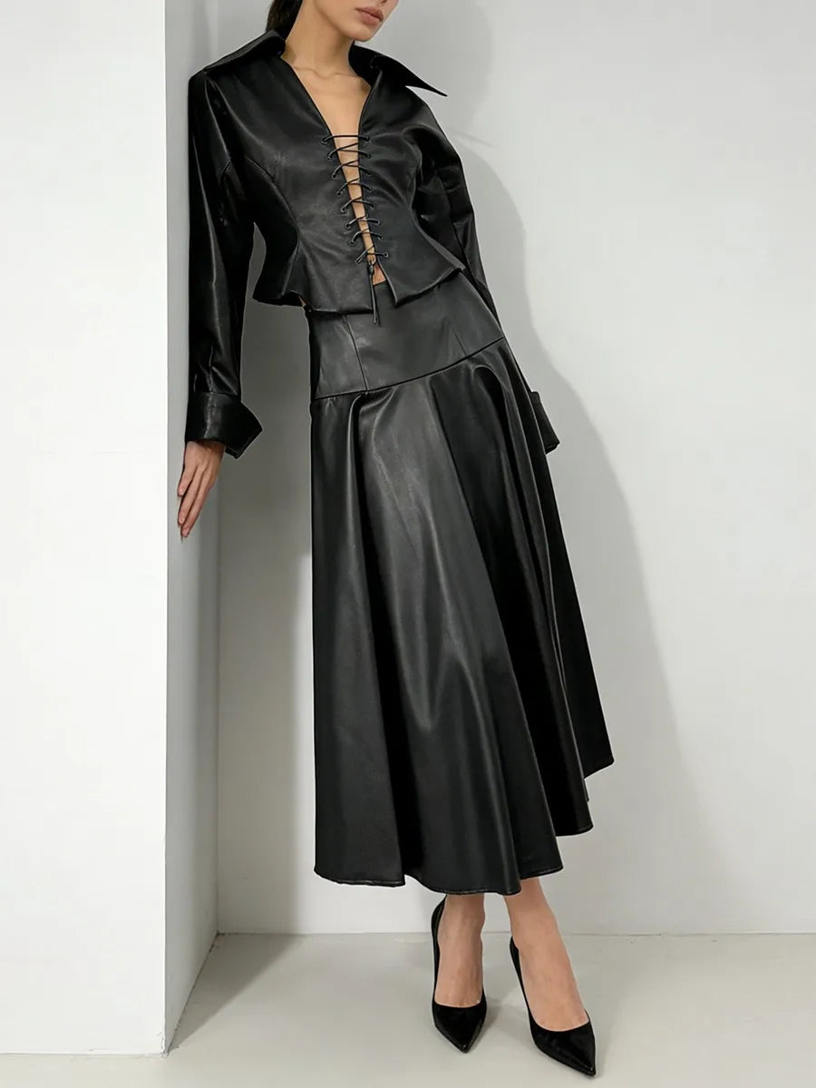 Trend4us Luxe Faux Leather Lace-Up Blazer & Midi Skirt Set