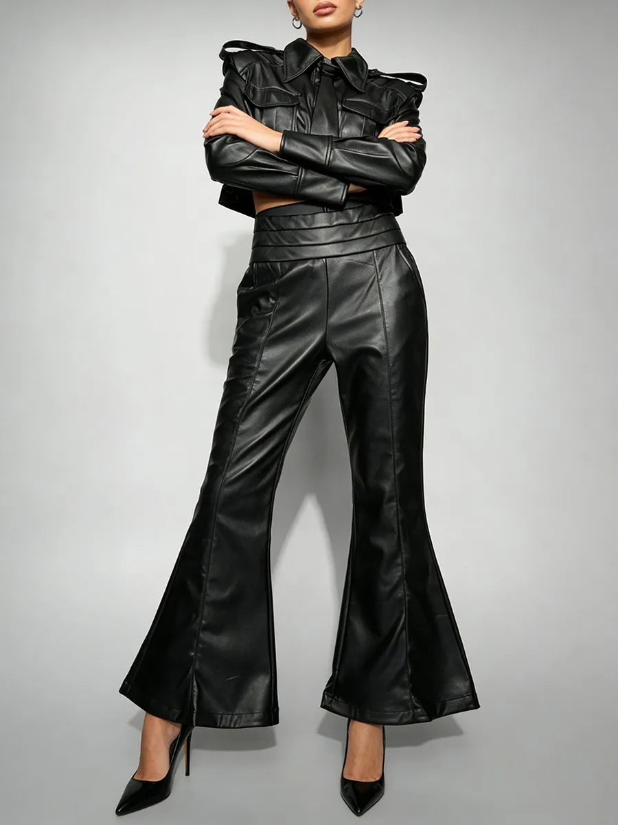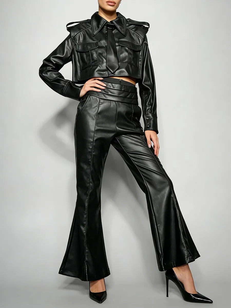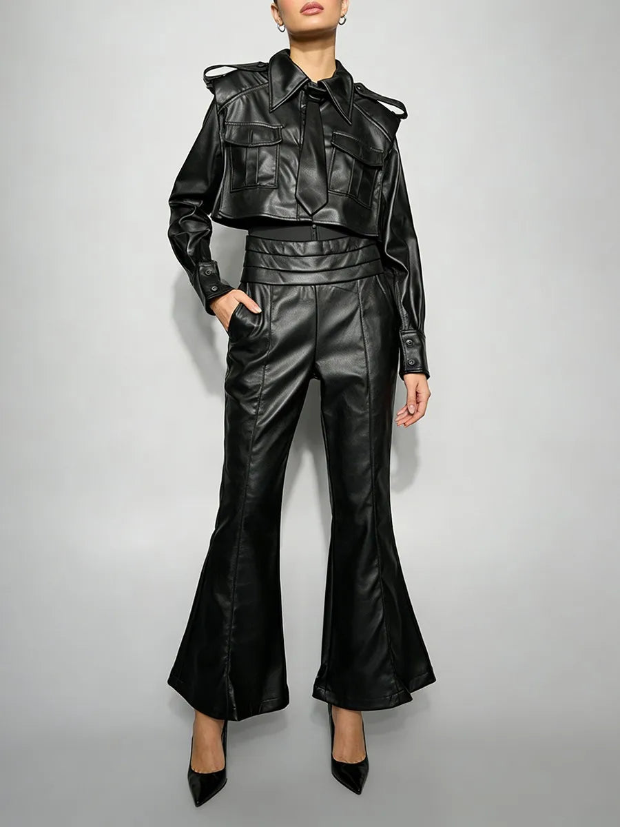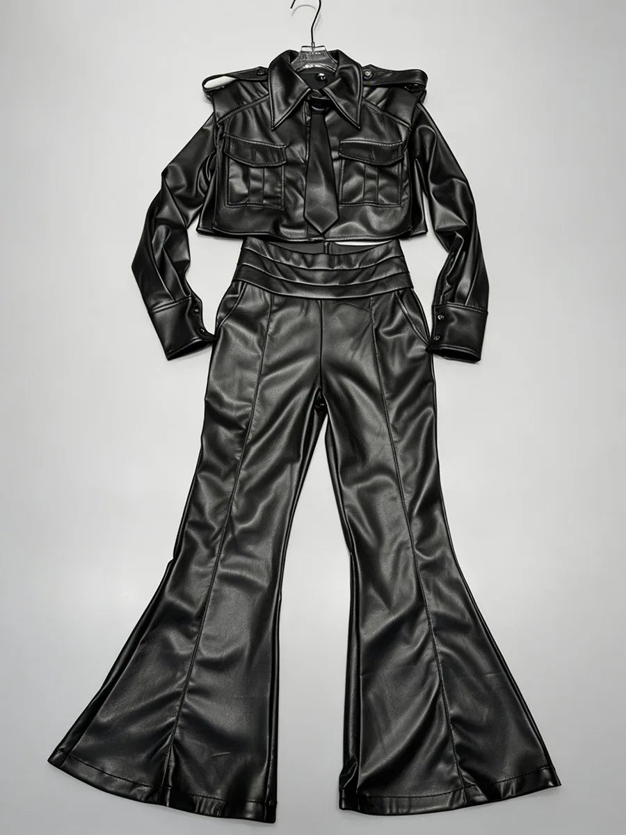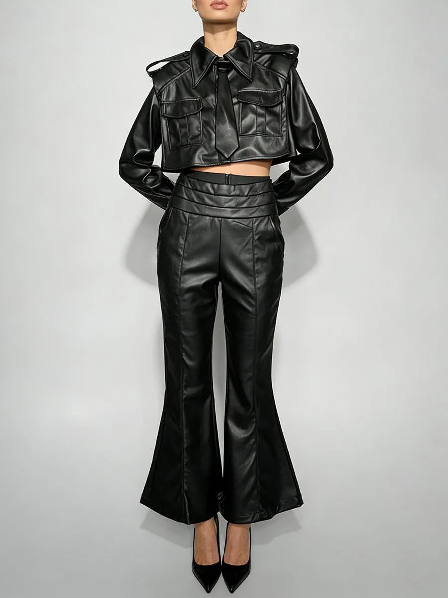 Trend4us Leather Cropped Blazer & Flare Pants Set