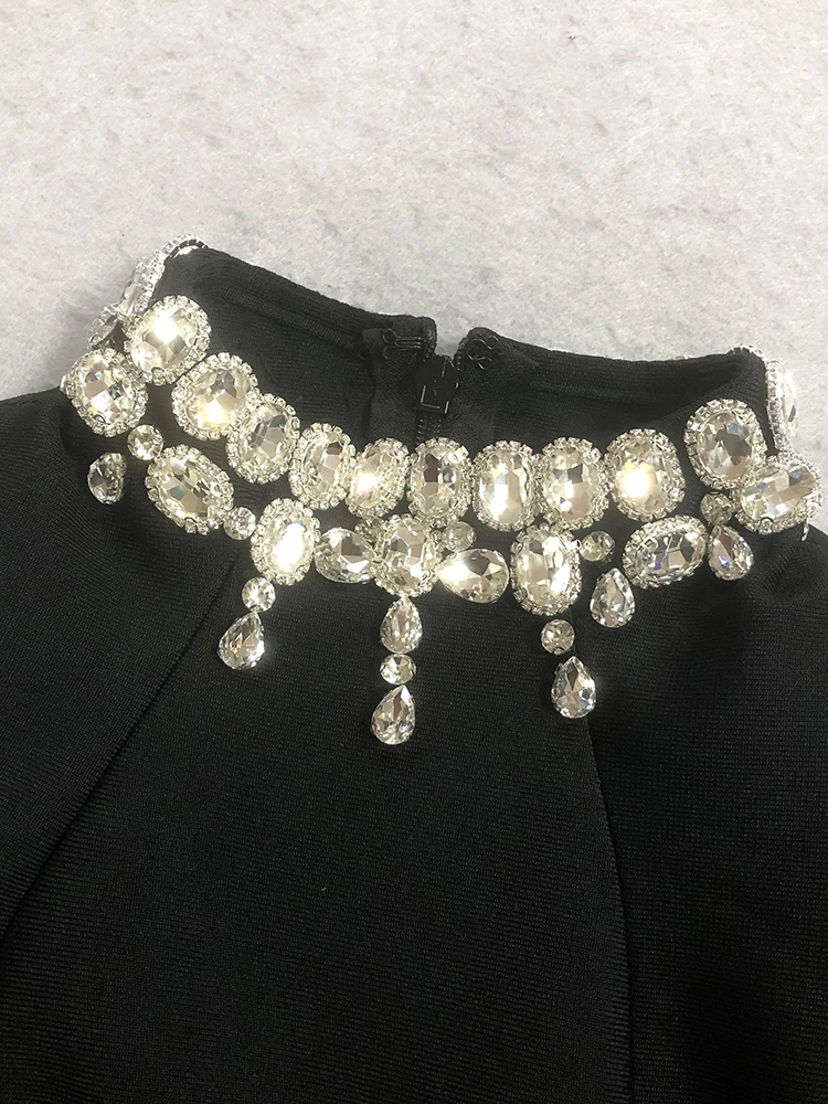 The highlight is the statement crystal-embellished collar, designed to mimic a couture necklace and eliminate the need for additional jewelry. Short sleeves add polished balance, making this dress perfect for cocktail events, evening dinners, holiday gatherings, and upscale celebrations where understated luxury takes center stage.