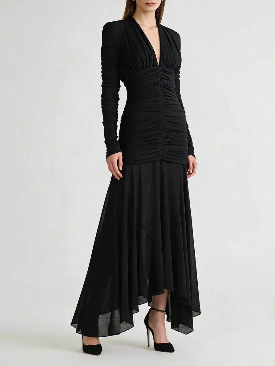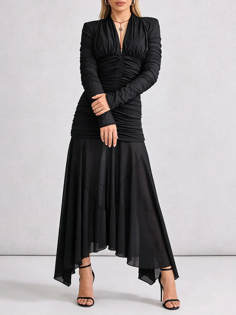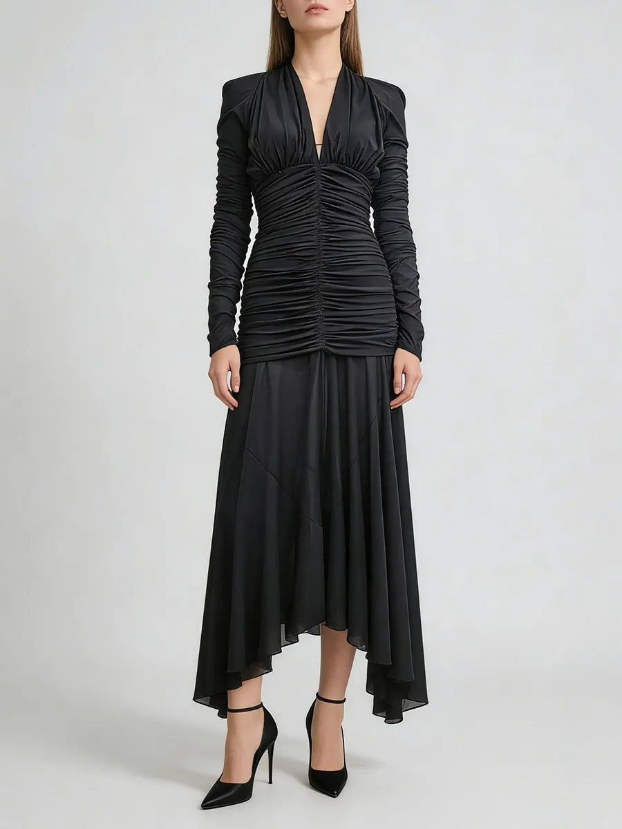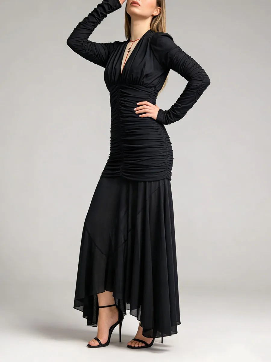 Refined and effortlessly dramatic, the Trend4us Elegant Ruched Long-Sleeve Asymmetrical Maxi Dress is designed to sculpt, flatter, and flow with every step. Featuring a deep V-neckline and expertly placed ruching throughout the bodice, this dress enhances the waistline while creating a smooth, elongated silhouette.