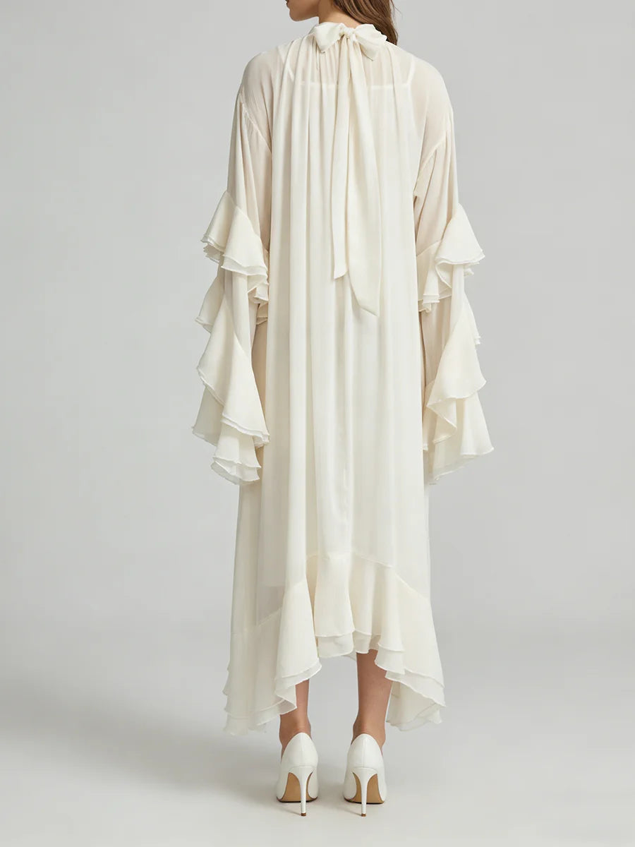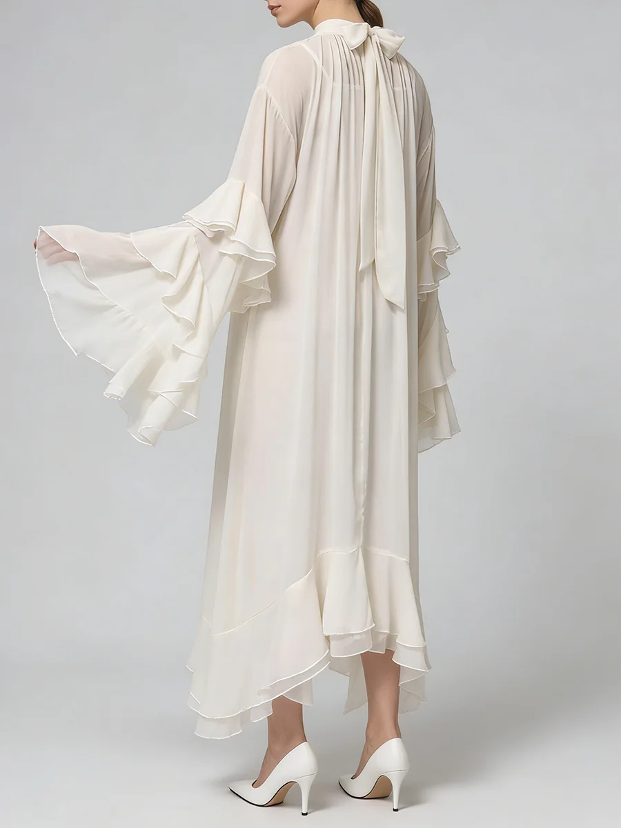 Graceful, airy, and effortlessly elegant, the Trend4us Elegant Ruffled Sleeve Tie-Neck Chiffon Dress is designed to flow with every movement. Crafted from lightweight chiffon, this dress features a refined high neckline with a soft tie-neck detail and cascading ruffled sleeves that add romantic volume. The relaxed silhouette drapes beautifully, while the layered hemline creates a delicate, floating finish ideal for special occasions or elevated everyday wear.