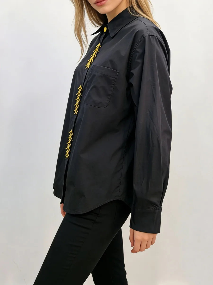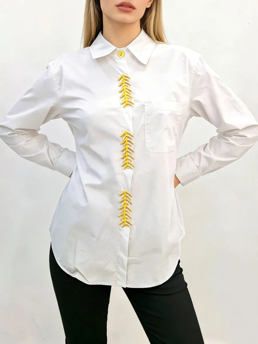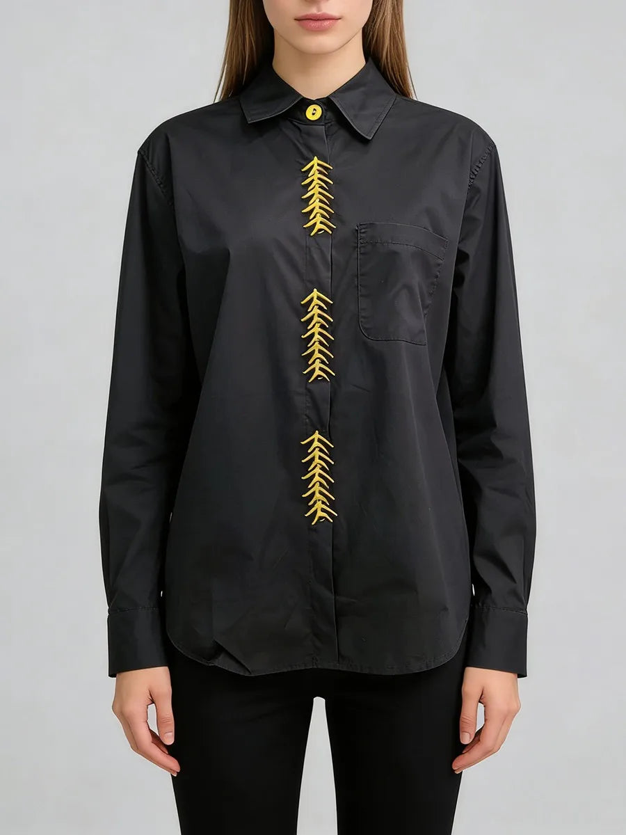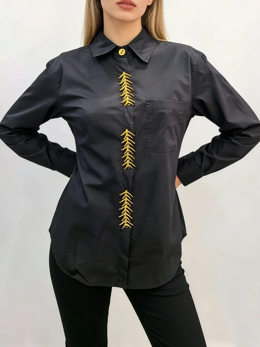 Clean, modern, and artfully detailed, the Trend4us Embellished Button-Front Long-Sleeve Shirt elevates a classic silhouette with refined statement accents. Designed with a crisp collared neckline and a smooth button-front closure, this shirt features distinctive vertical embellishment detailing that adds a subtle yet striking focal point. The relaxed tailored fit offers effortless structure, making it ideal for both professional styling and elevated casual looks.