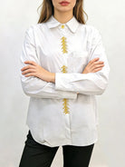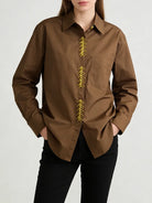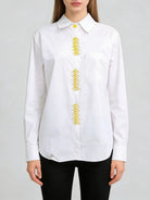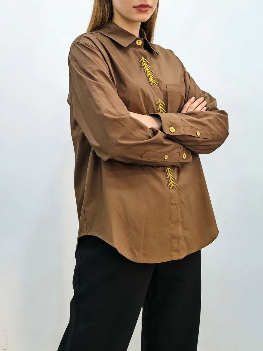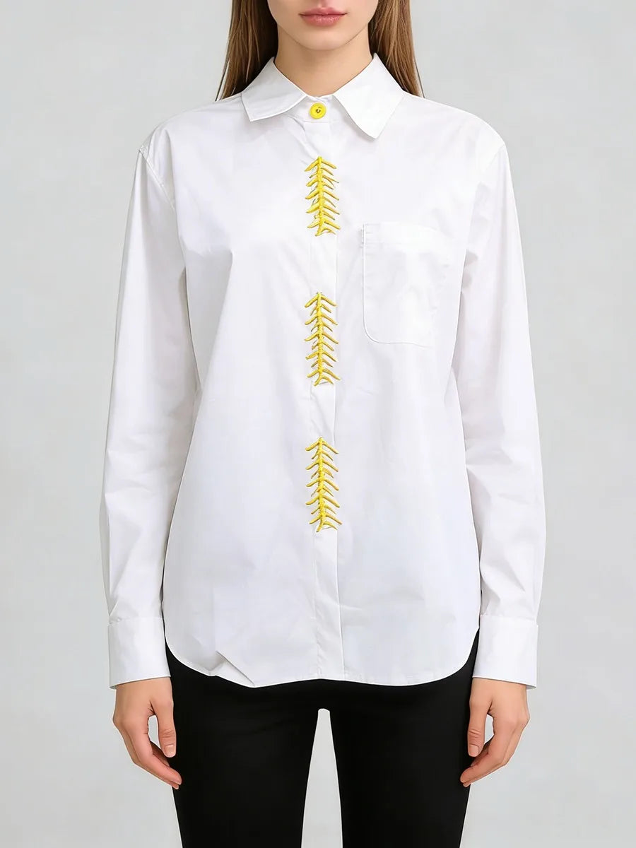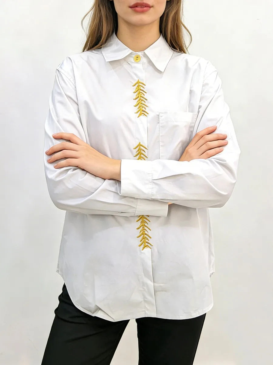 Clean, modern, and artfully detailed, the Trend4us Embellished Button-Front Long-Sleeve Shirt elevates a classic silhouette with refined statement accents. Designed with a crisp collared neckline and a smooth button-front closure, this shirt features distinctive vertical embellishment detailing that adds a subtle yet striking focal point. The relaxed tailored fit offers effortless structure, making it ideal for both professional styling and elevated casual looks.