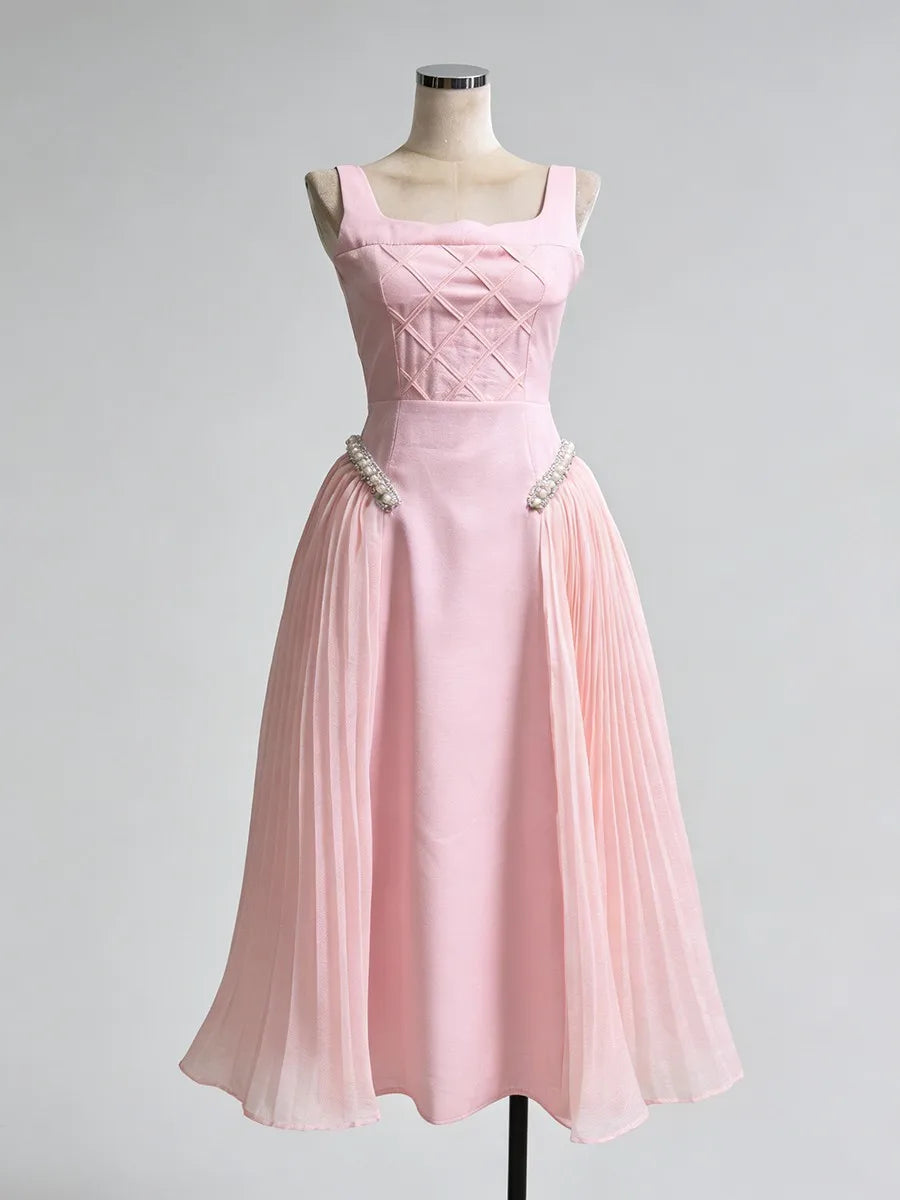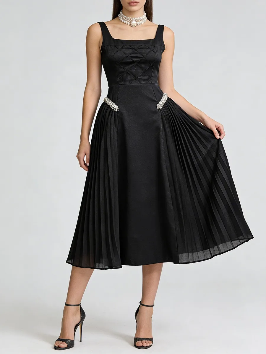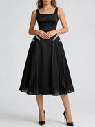 Refined glamour meets timeless elegance in the Trend4us Luxe Crystal-Accent Pleated Midi Dress. Designed for sophisticated evenings and elevated occasions, this black midi dress features a corset-inspired bodice with subtle contour stitching that sculpts and flatters the waist. The wide shoulder straps and structured neckline offer modern poise, while the flowing pleated skirt adds graceful movement with every step.
