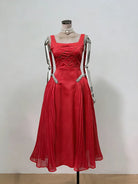 Crystal-embellished accents at the waist catch the light beautifully, adding a touch of couture sparkle without overpowering the silhouette. Finished in a classic midi length, this dress is effortlessly chic—perfect for cocktail events, formal dinners, holiday celebrations, and editorial moments where understated luxury speaks volumes.