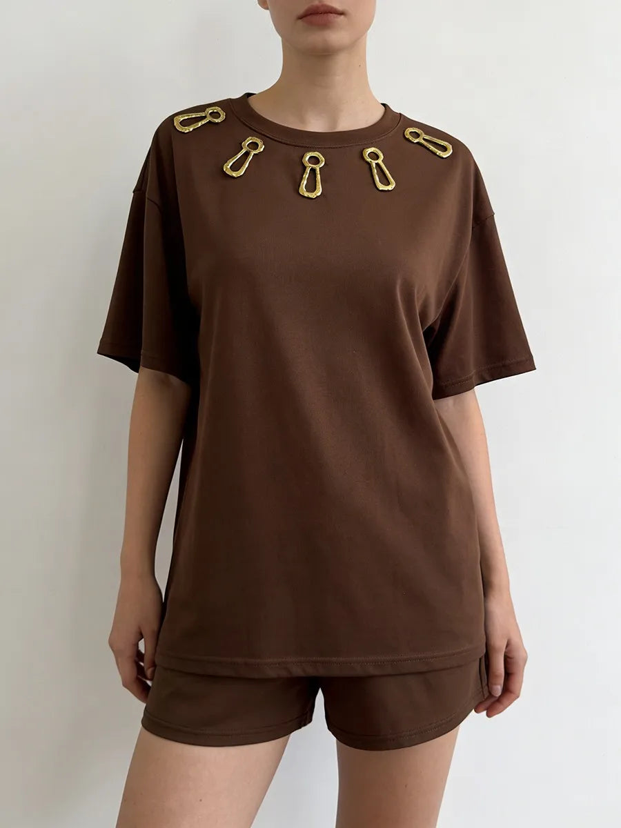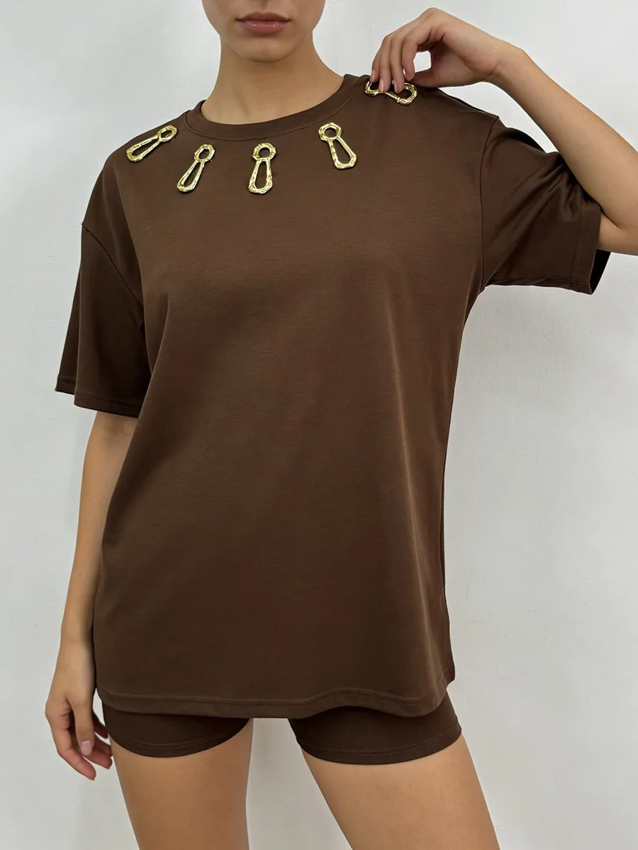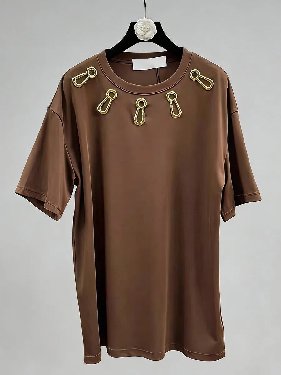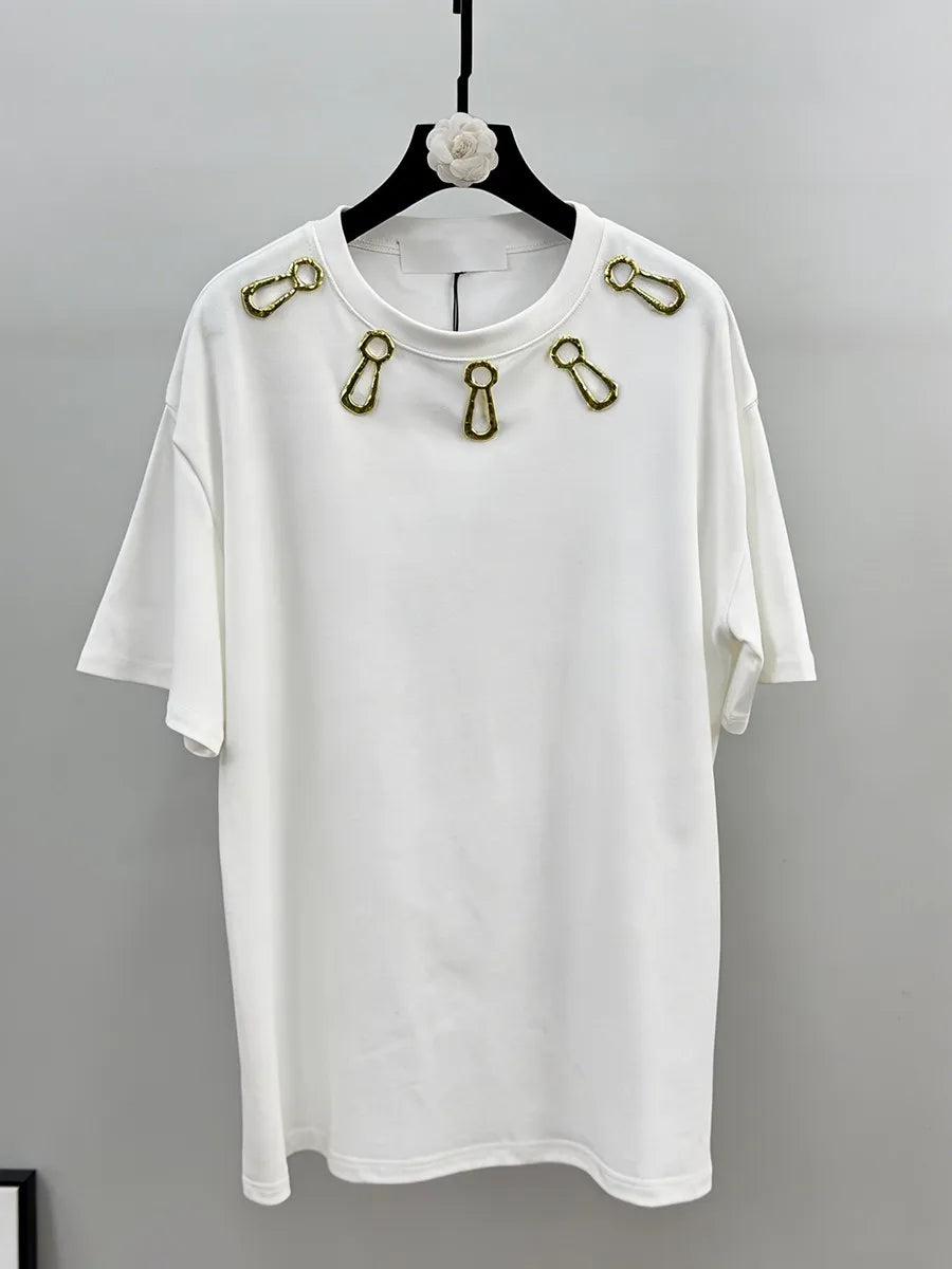 Casual luxury meets statement design in the Trend4us Luxe Gold Charm Embellished Oversized Tee. Crafted in a relaxed, oversized silhouette, this elevated T-shirt features striking gold-tone charm embellishments along the neckline, inspired by jewelry detailing for a bold yet refined finish. The smooth, soft-touch fabric drapes effortlessly on the body, offering all-day comfort while maintaining a polished, fashion-forward aesthetic.