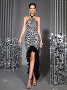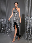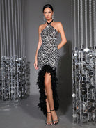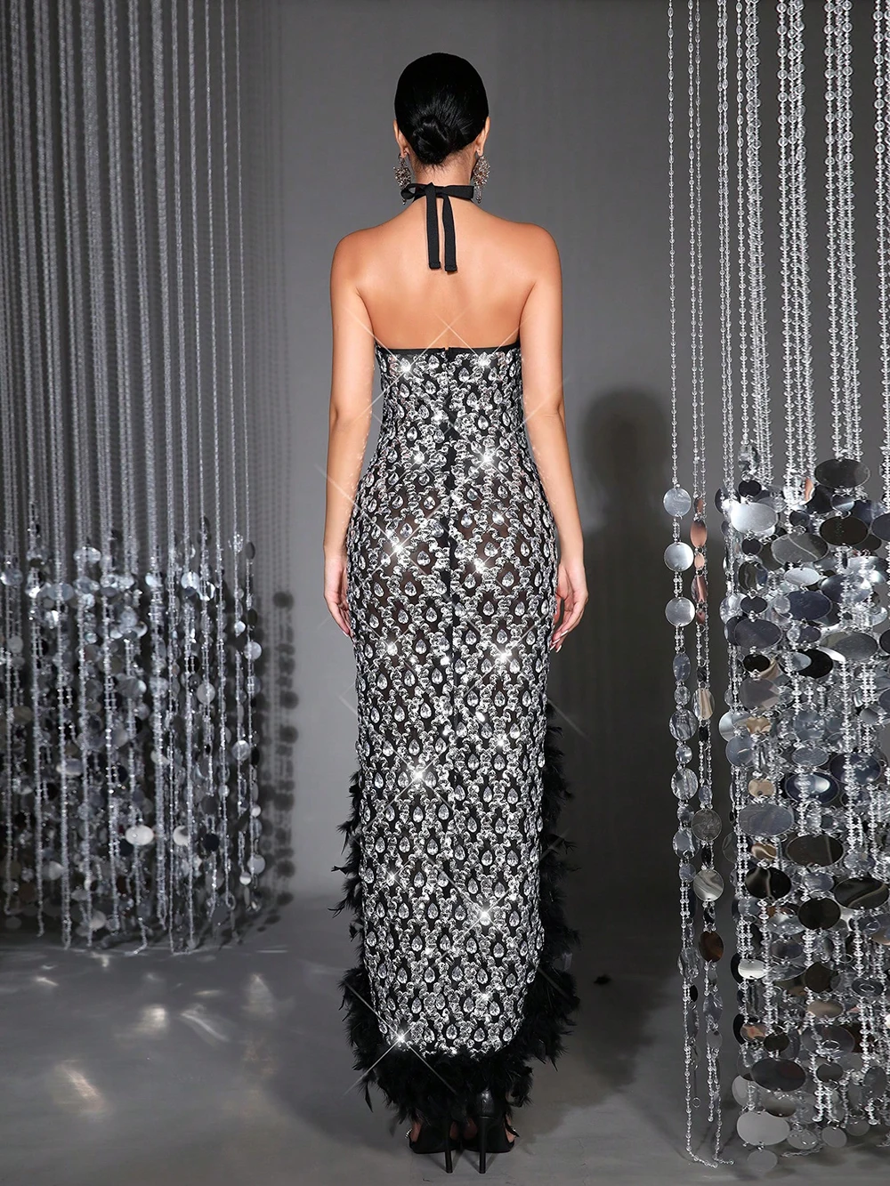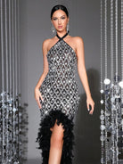 Step into the spotlight with the Trend4us Luxe Modern Crystal Halter Feather Evening Gown, a striking blend of contemporary glamour and couture elegance. Designed to captivate, this gown features a sleek halter neckline that frames the shoulders beautifully, paired with an all-over crystal-embellished pattern that reflects light with every movement.