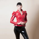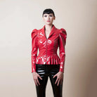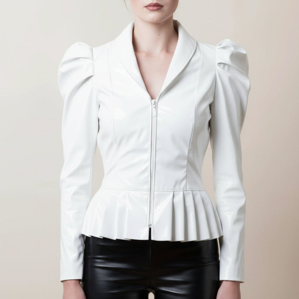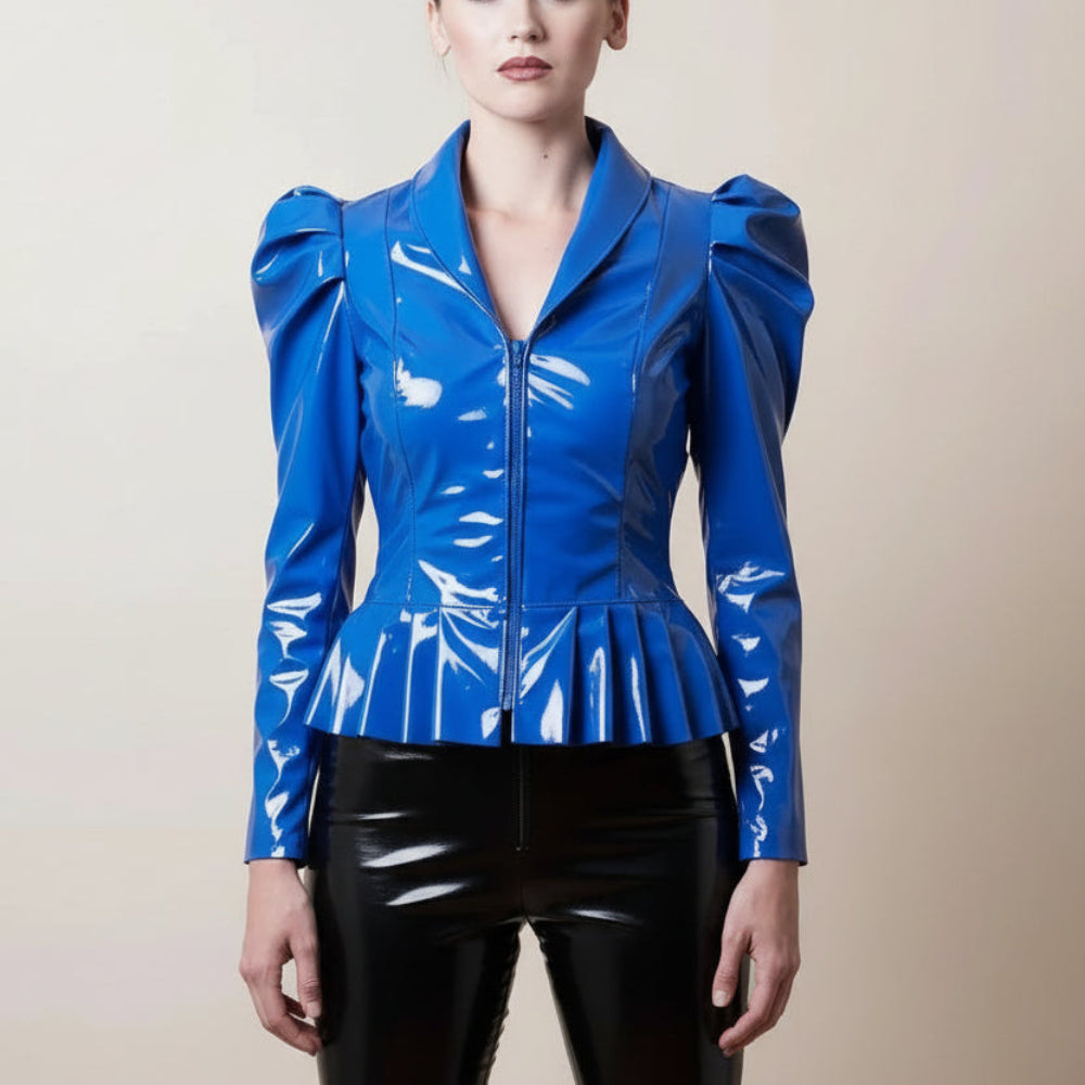 Make a fearless statement with the Trend4us Luxe Patent Faux Leather Puff-Sleeve Peplum Jacket, a striking fusion of high-gloss attitude and sculpted elegance. Crafted from sleek patent faux leather, this jacket is designed to command attention with its sharp tailoring, dramatic puff sleeves, and waist-defining peplum hem.