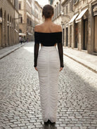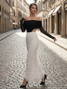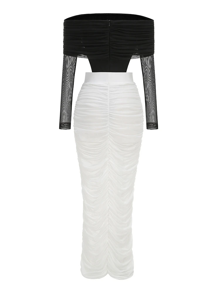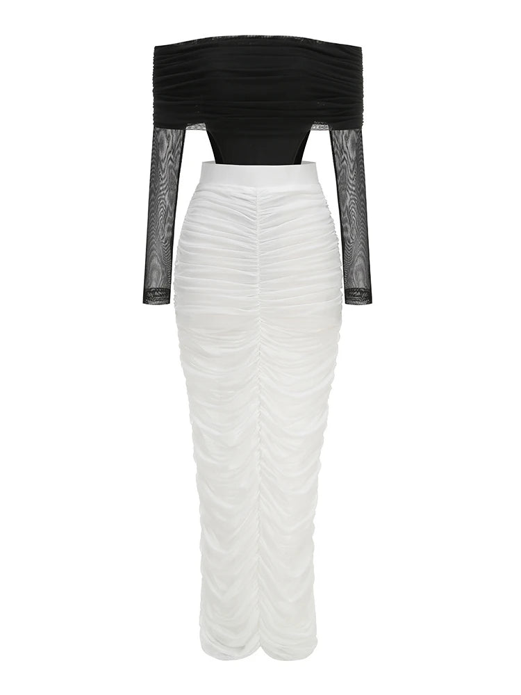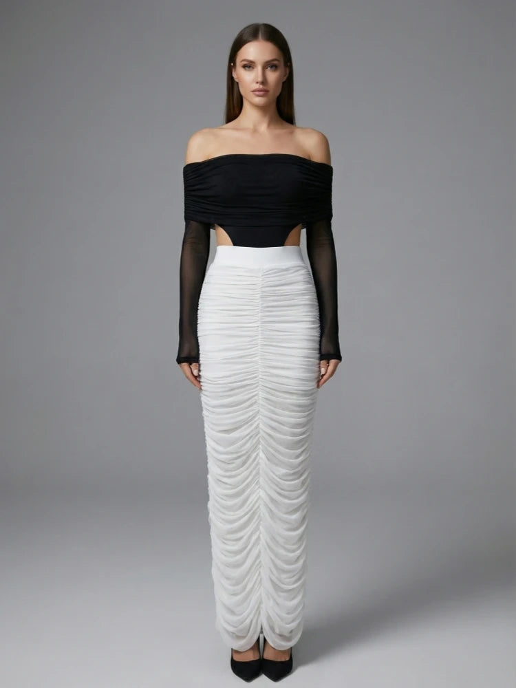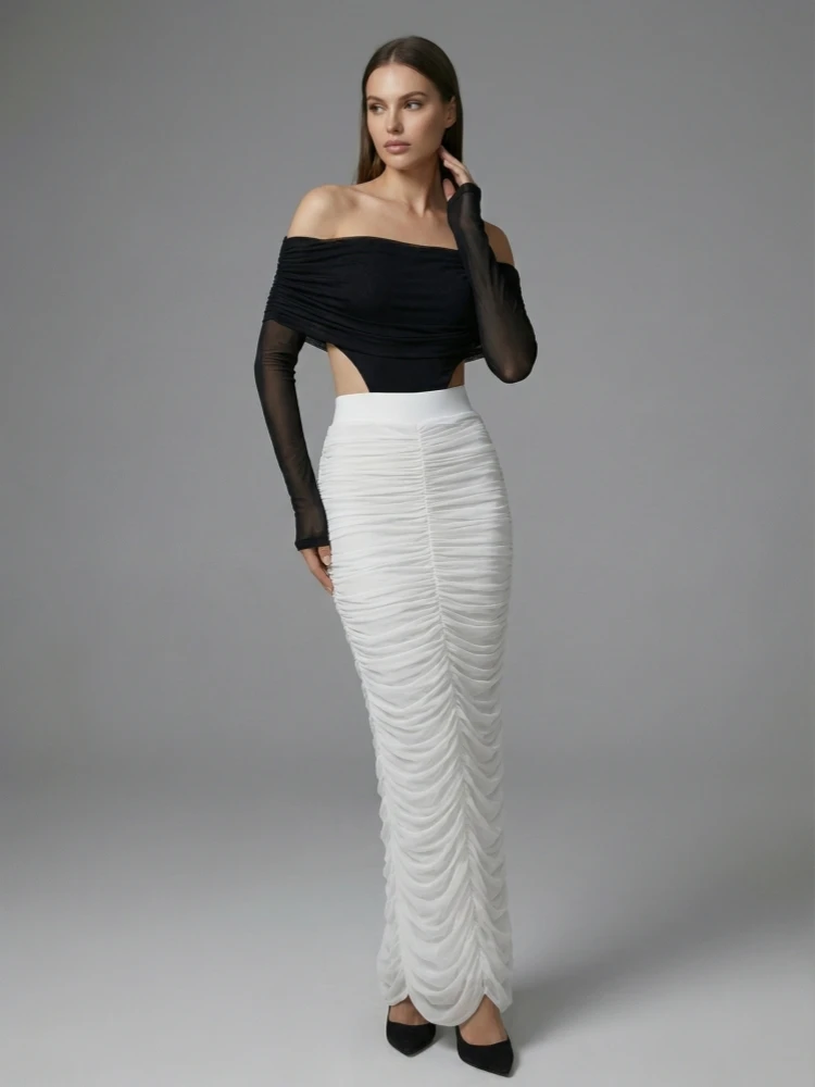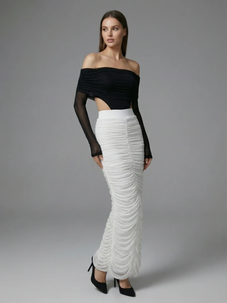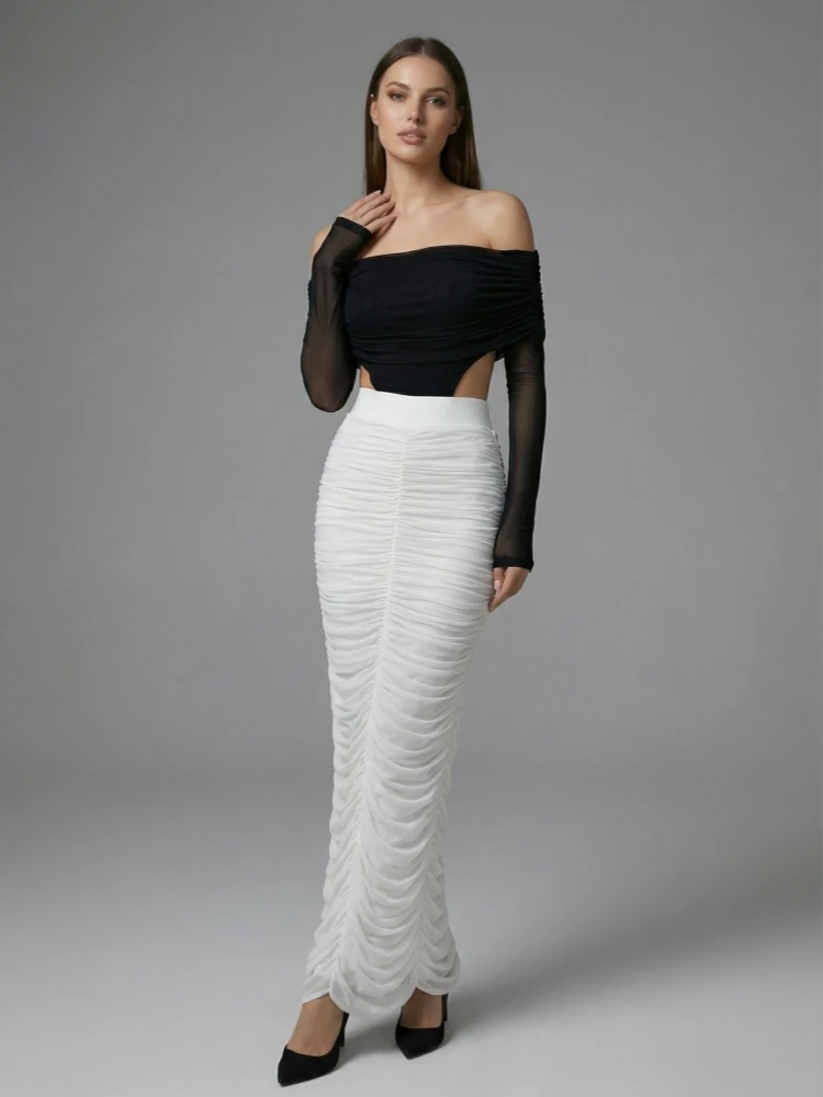 Elevate evening glamour with sculpted sensuality. The Trend4us Luxe Ruched Mesh Two-Piece Maxi Skirt Set pairs a dramatic off-shoulder sheer mesh top with a figure-contouring ruched maxi skirt for an unmistakably refined statement. Designed to drape and sculpt, the soft mesh layers create elegant texture while the high-waisted skirt elongates the silhouette with a fluid, column finish.