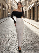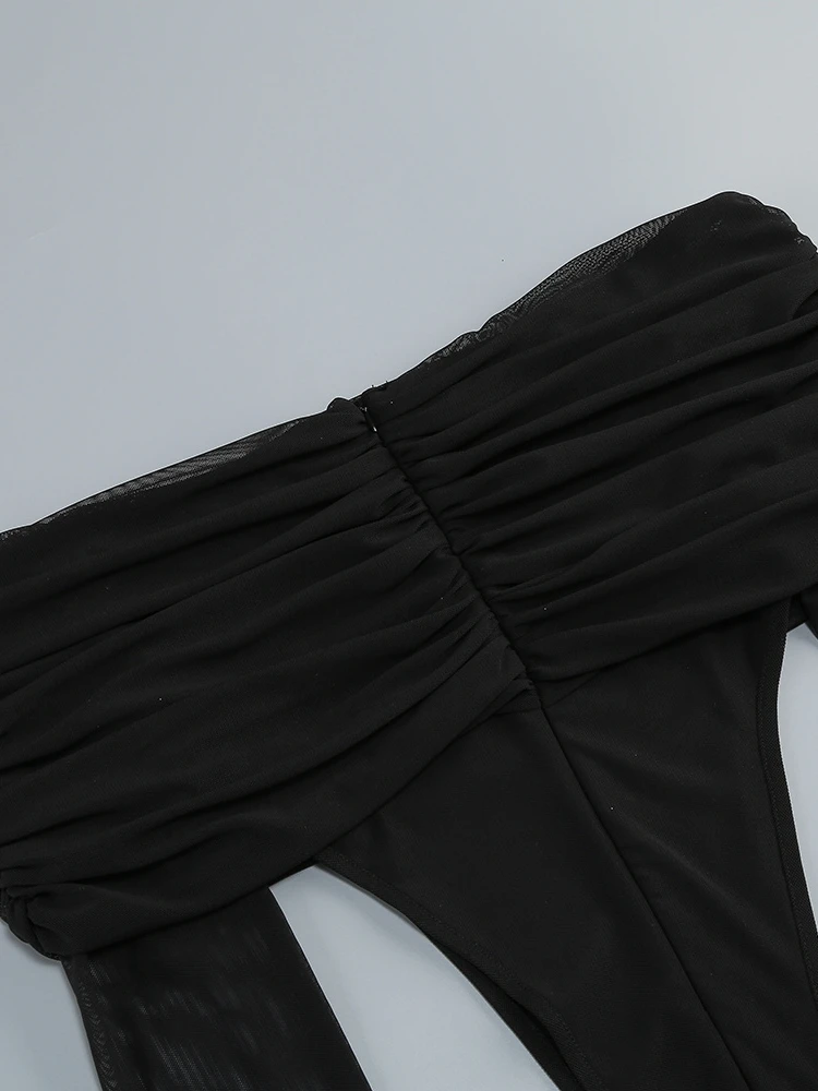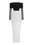 The off-shoulder neckline highlights the collarbone, while semi-sheer long sleeves add a couture touch. Precision ruching through the skirt enhances curves without bulk, delivering a polished, editorial look that transitions seamlessly from cocktail hour to candlelit evenings. Sophisticated yet alluring, this set is your go-to for elevated celebrations and romantic moments.
