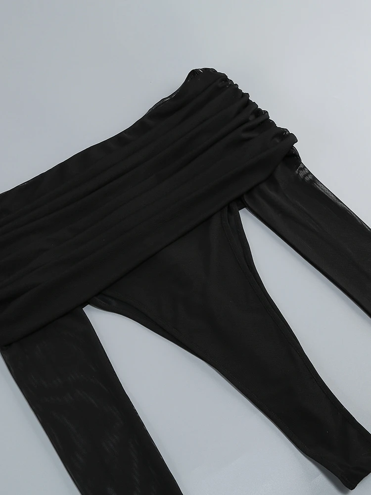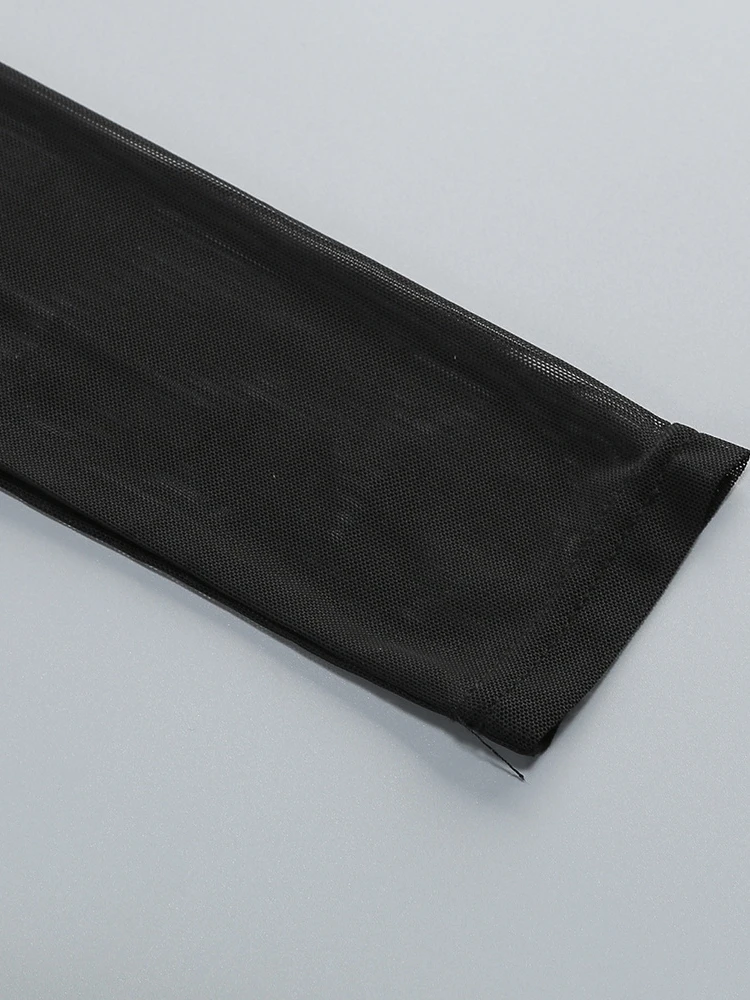 Top: Off-shoulder mesh, long sleeve, semi-sheer