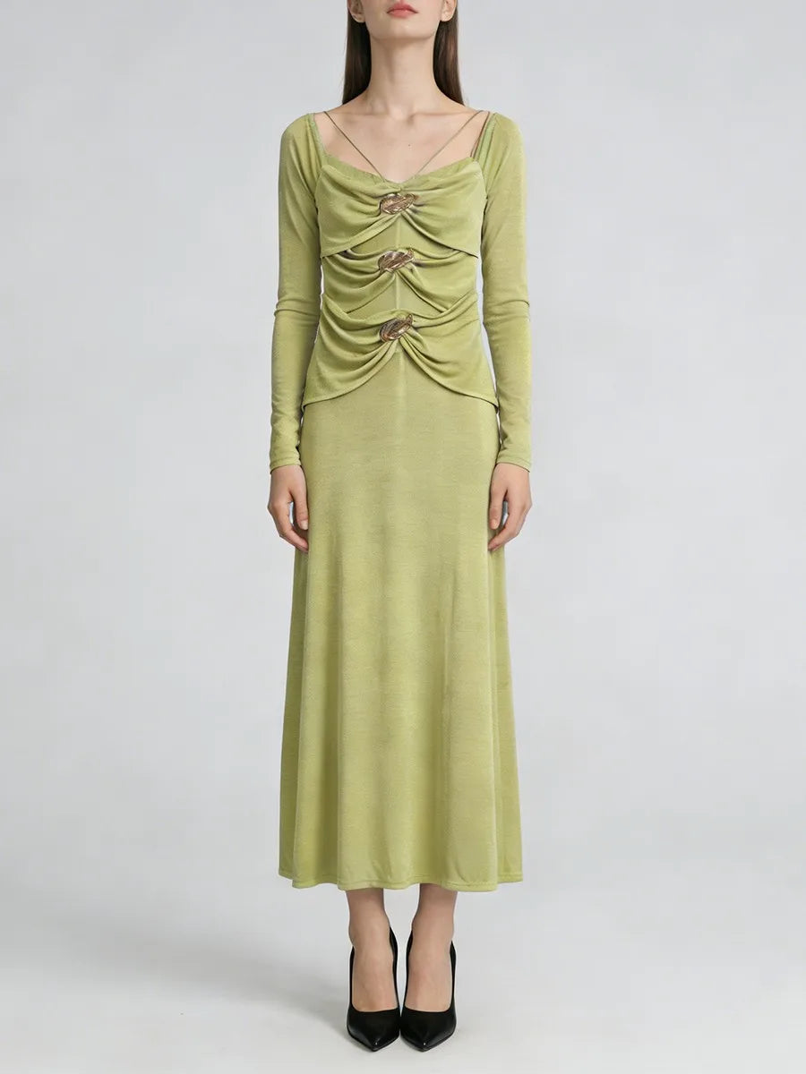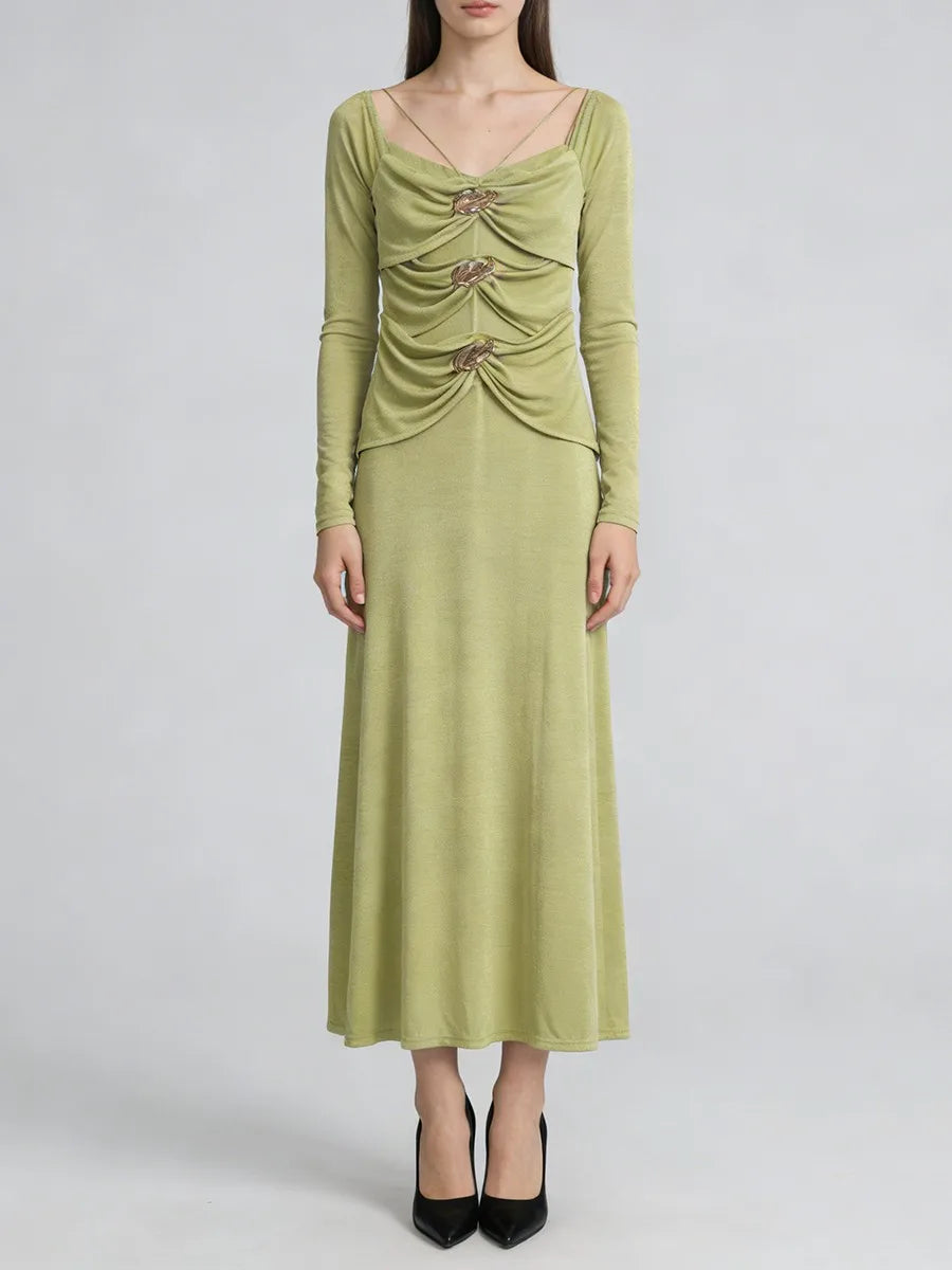 Crafted from a smooth, stretch fabric, the long sleeves and flowing maxi skirt balance structure with effortless movement—perfect for evening occasions where sophistication meets modern glamour.