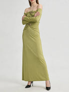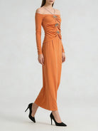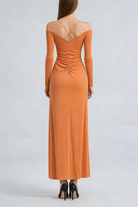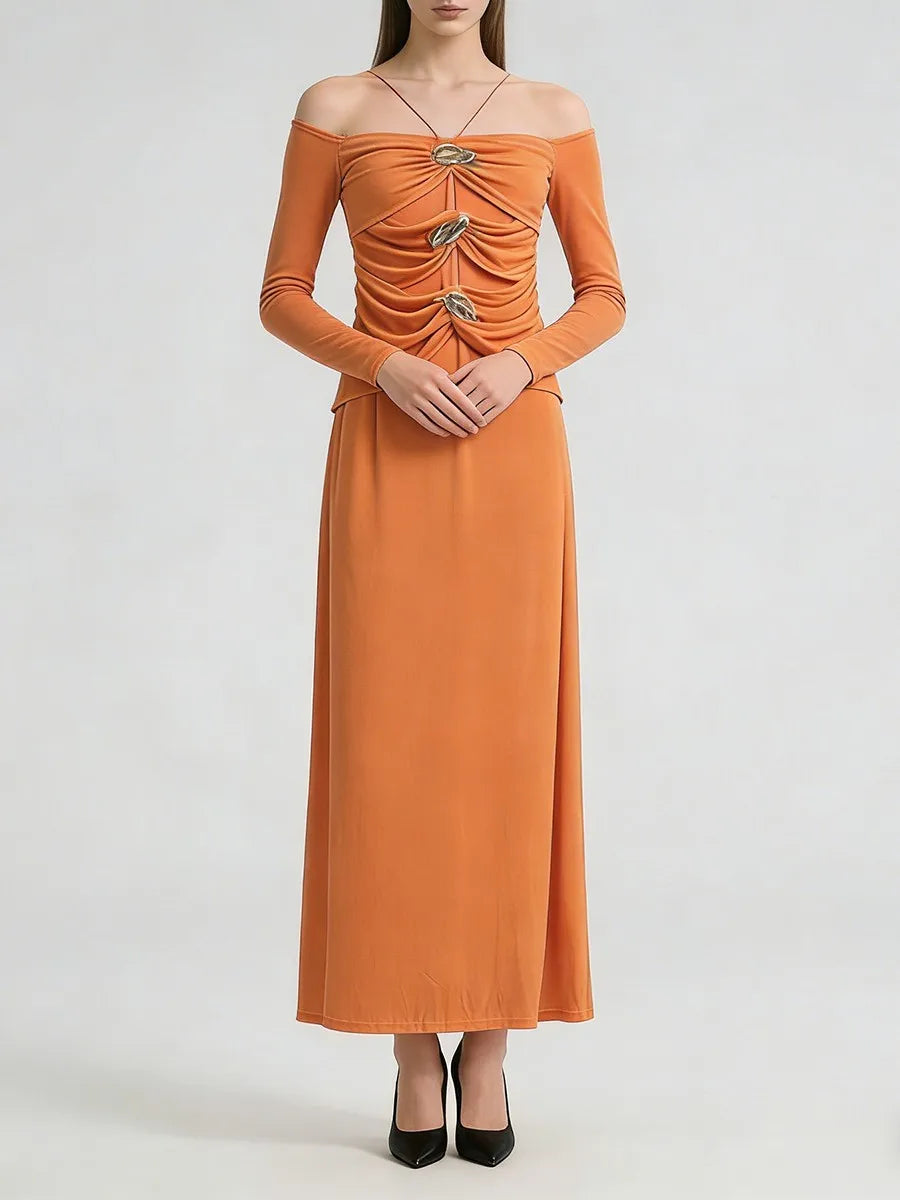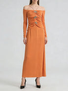 Designed to sculpt and elongate, the Trend4us Luxe Ruched Metal Accent Off-Shoulder Maxi Dress is a statement of refined elegance. Featuring a soft off-shoulder neckline with delicate straps, this dress highlights the collarbone while offering subtle support. The ruched bodice is enhanced with sculptural metal accents, creating a flattering draped effect that cinches the waist and elevates the silhouette.