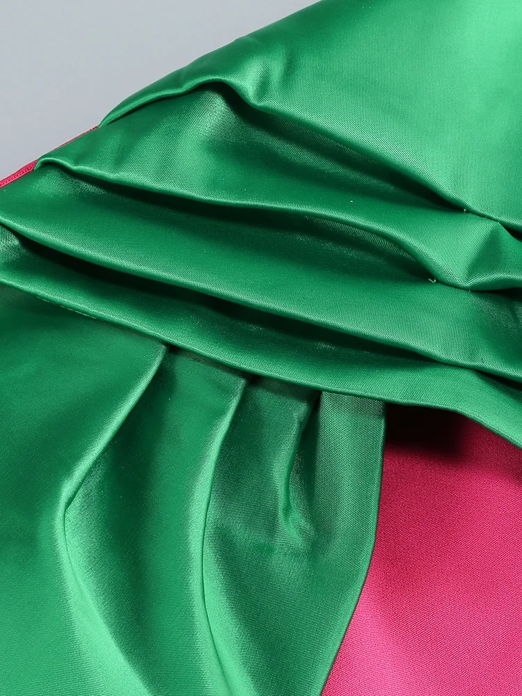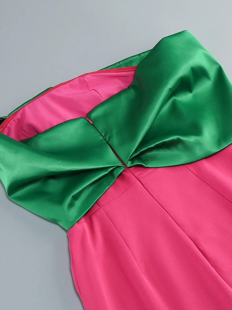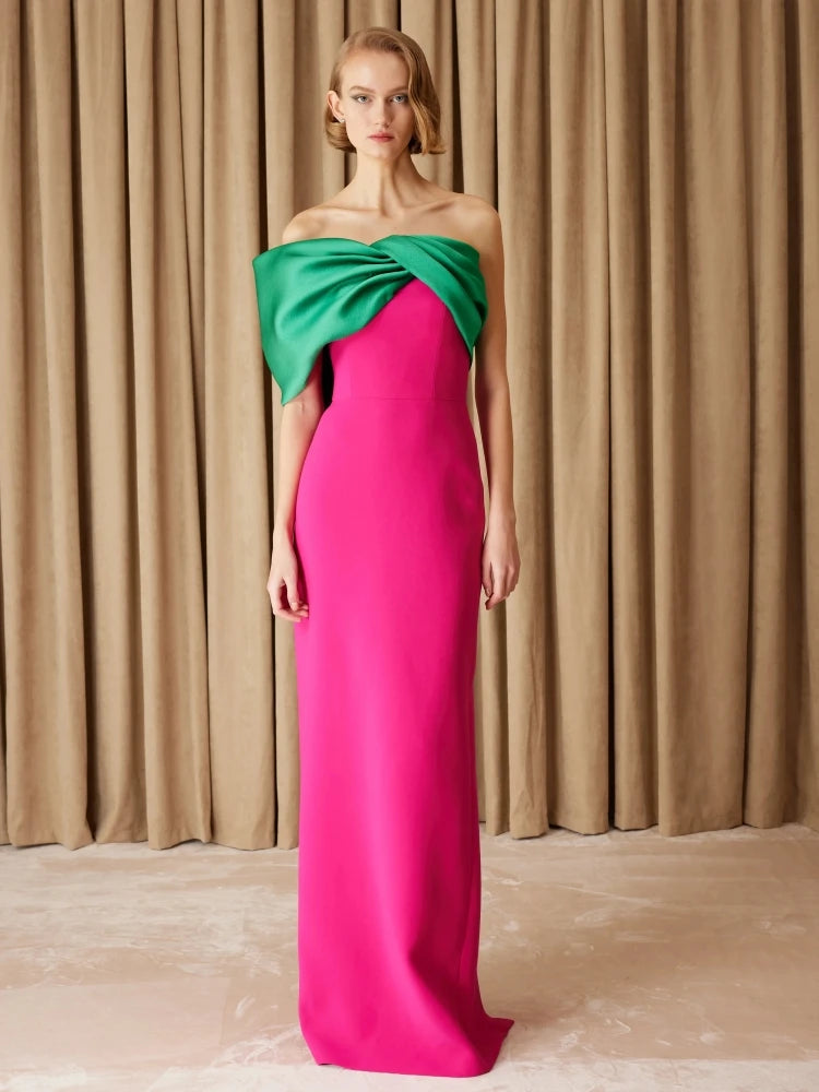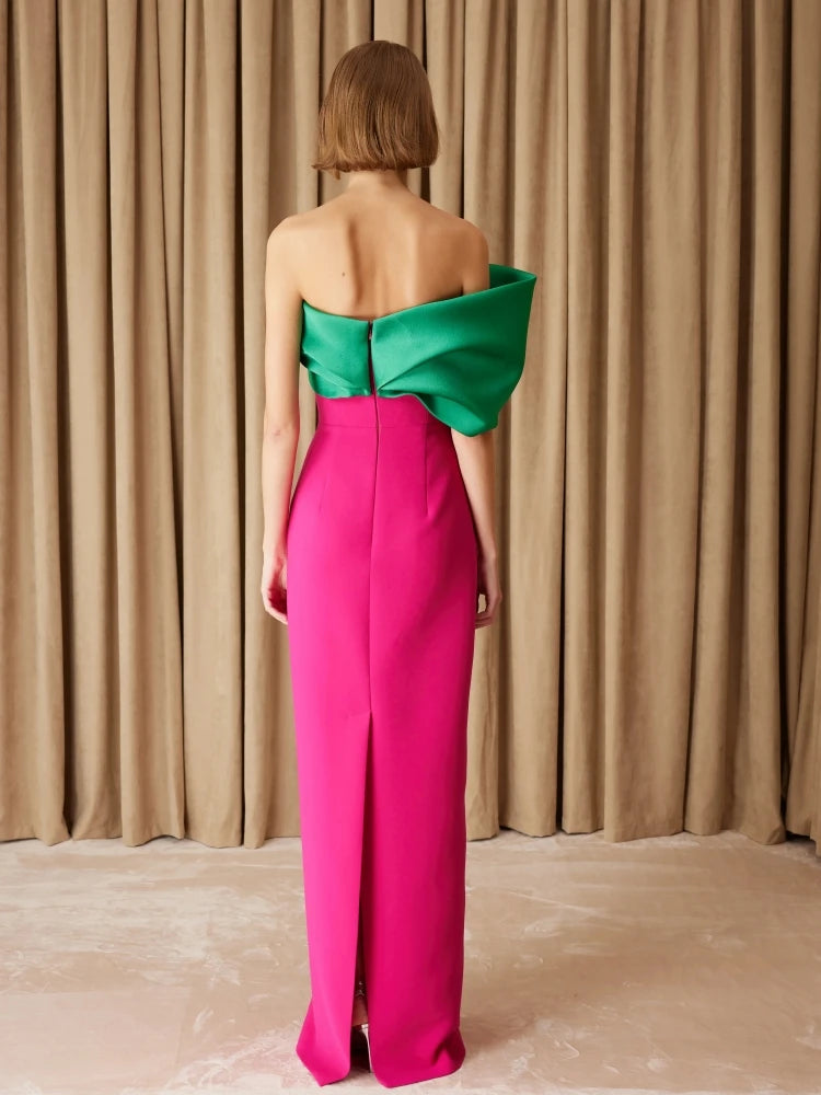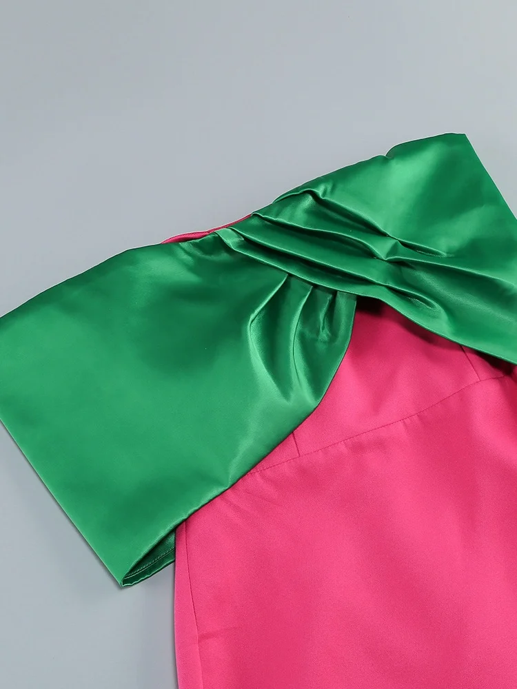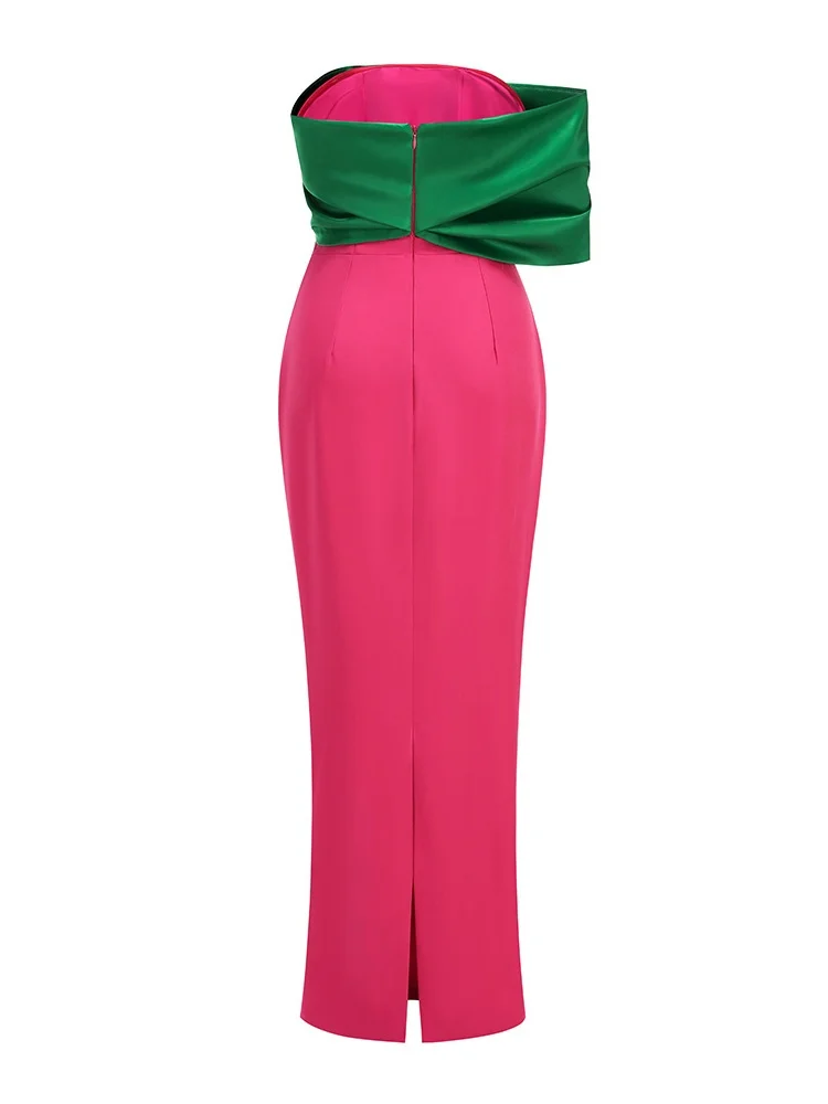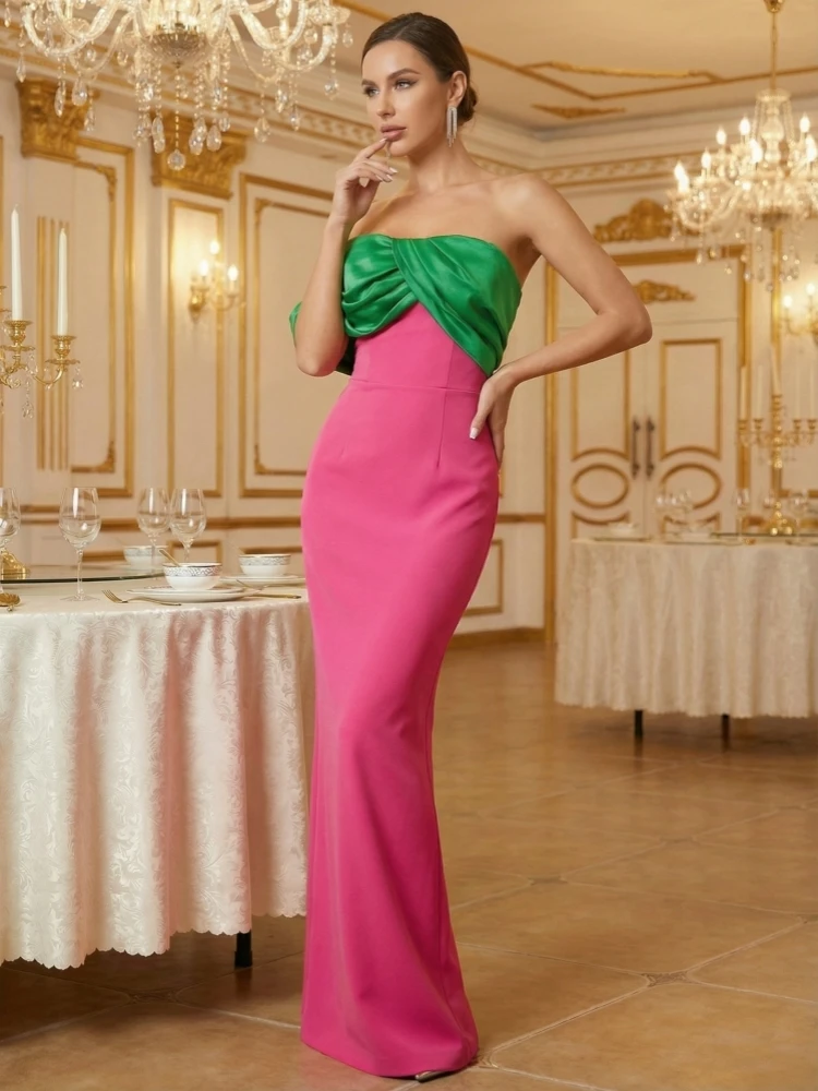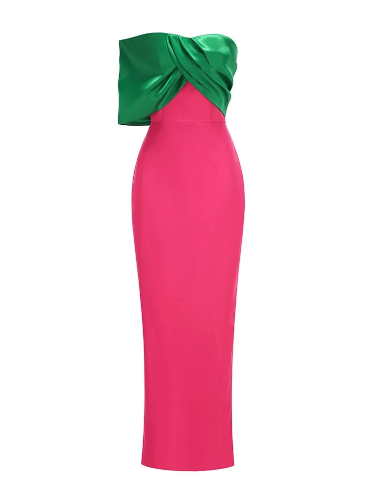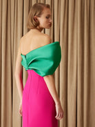 Make an unforgettable entrance in the Trend4us Luxe Sculptural Off-Shoulder Colorblock Maxi Gown, a statement silhouette designed for elevated evenings and editorial moments. This floor-length gown features a sleek, figure-skimming base in a bold pink hue, contrasted by an architectural off-shoulder sculptural overlay in vibrant green.