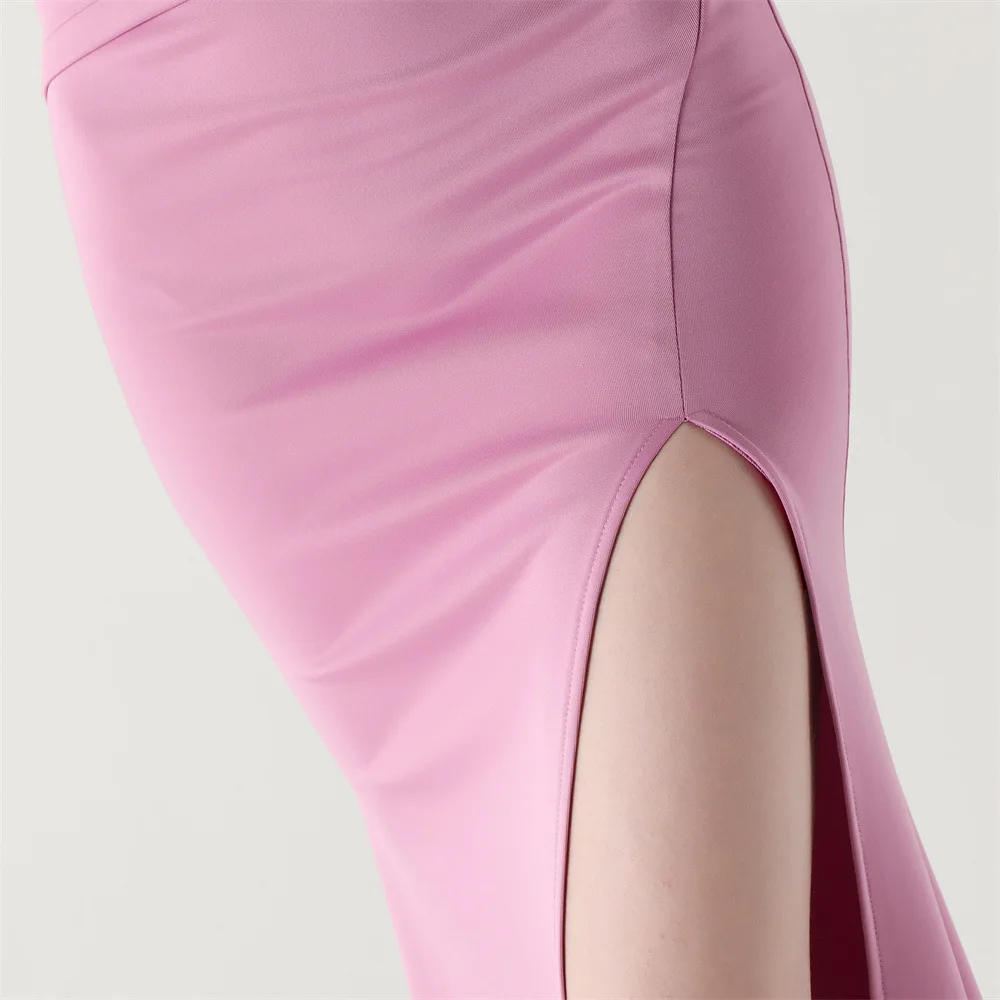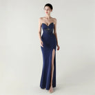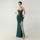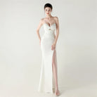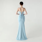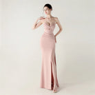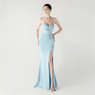 Soft pleated draping flows seamlessly from the waist, while a lace-up back detail allows for an adjustable, custom-fit finish. Completed with a graceful floor-length skirt and subtle slit for fluid movement, this gown is perfect for galas, formal evenings, and statement occasions where refined glamour is essential.