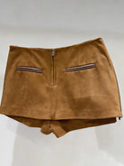 Elevate your wardrobe with the Trend4us Luxe Suede Zip-Slit Mini Skort, a statement piece that blends the sleek look of a mini skirt with the comfort and confidence of built-in shorts. Crafted from soft faux suede, this skort features a chic side zip-slit detail that adds subtle edge while enhancing movement. The clean waistline and tailored fit flatter your silhouette, making it perfect for nights out, brunch dates, or elevated casual looks. Style it with heels, boots, or a fitted top for effortless modern glam.