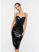 The body-hugging midi length creates a sleek, elongated look, perfect for nights out, parties, clubwear, or fashion-forward events. Adjustable spaghetti straps ensure a customized fit, while the smooth stretch material contours comfortably to the body without restricting movement. This dress is made for those who love elevated minimalism with maximum impact.