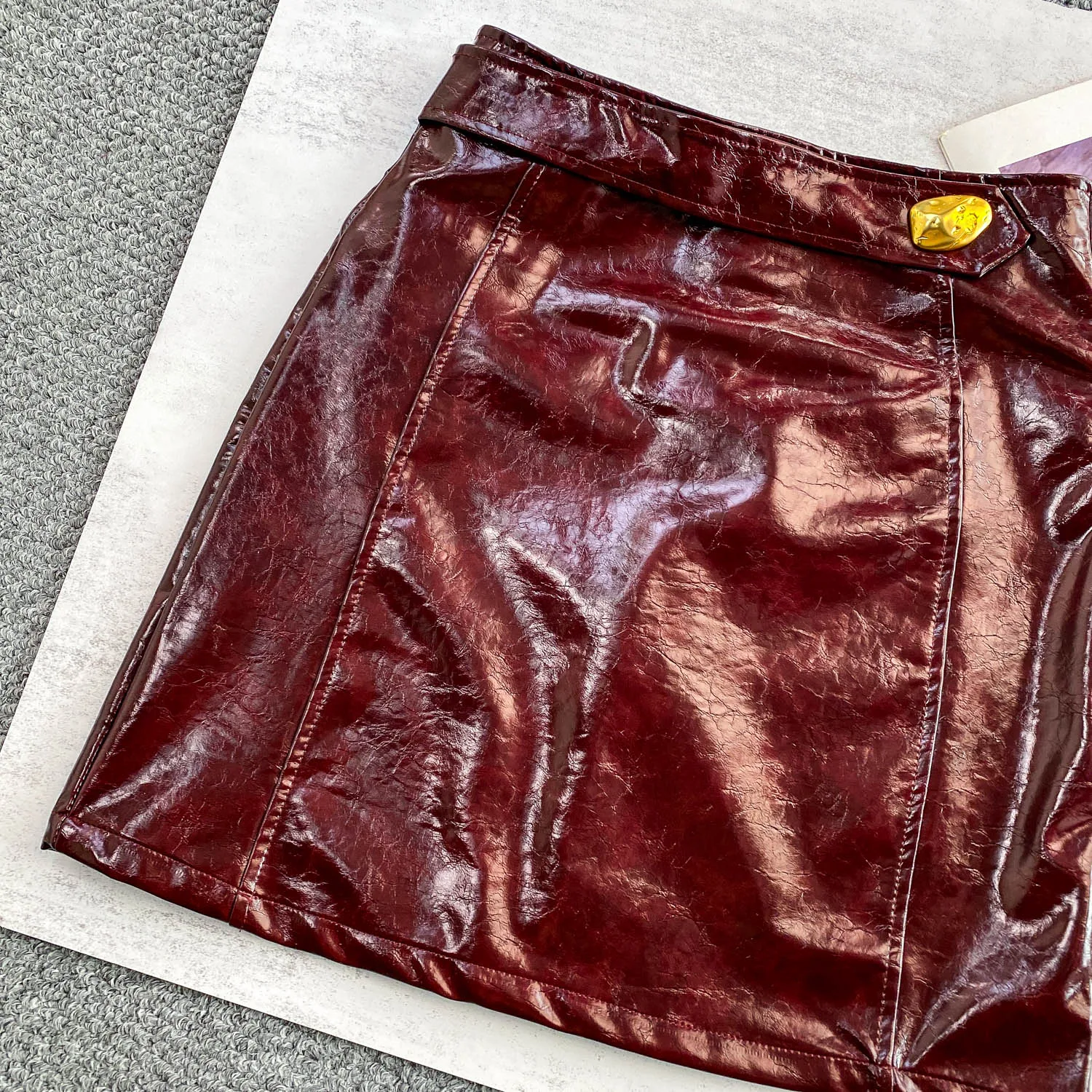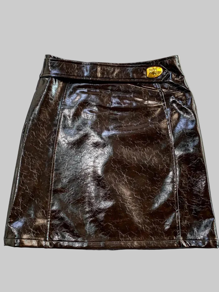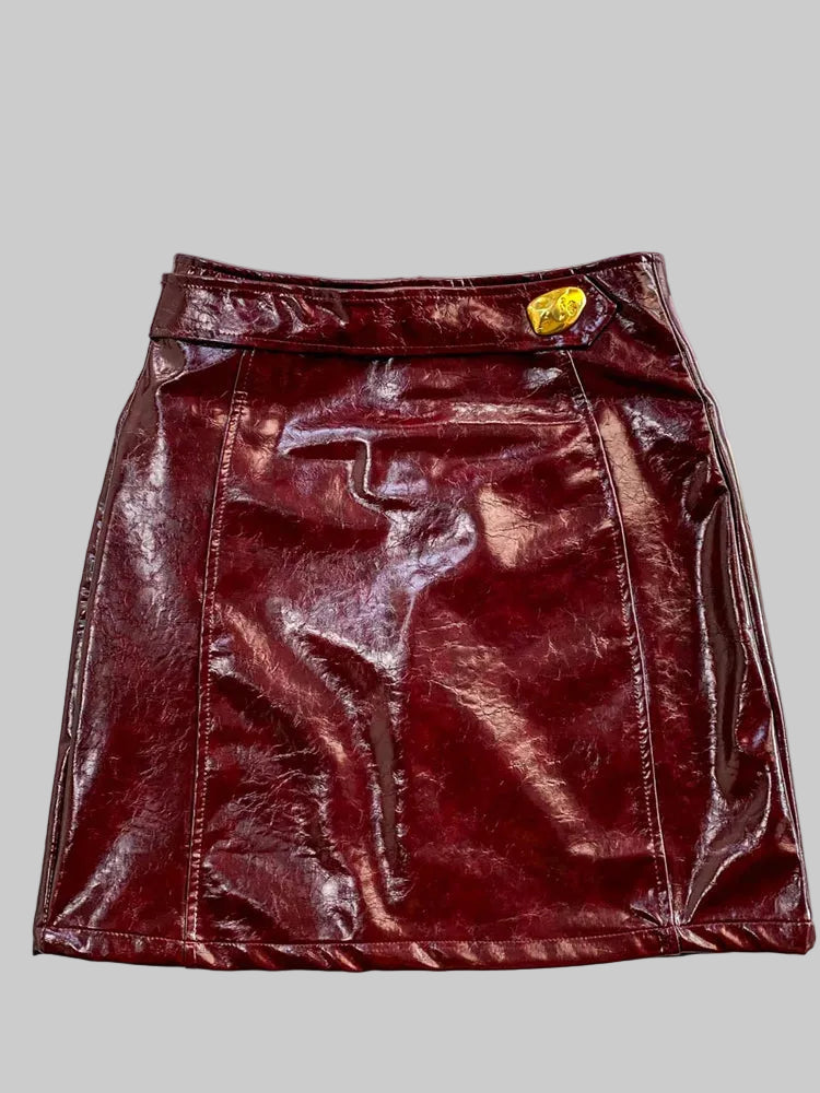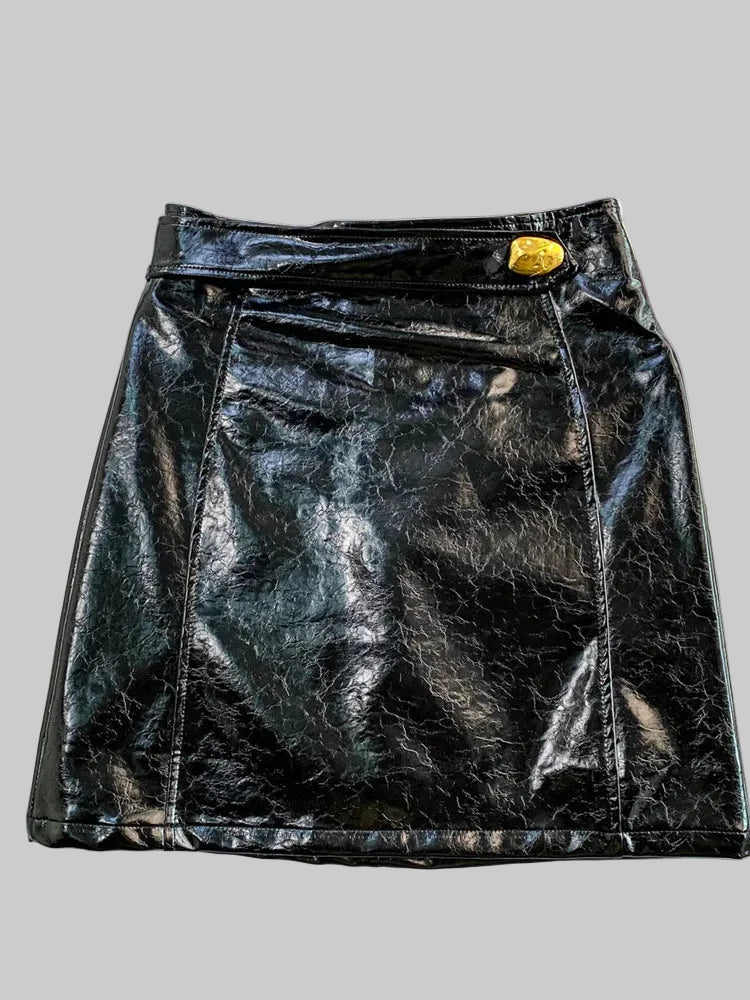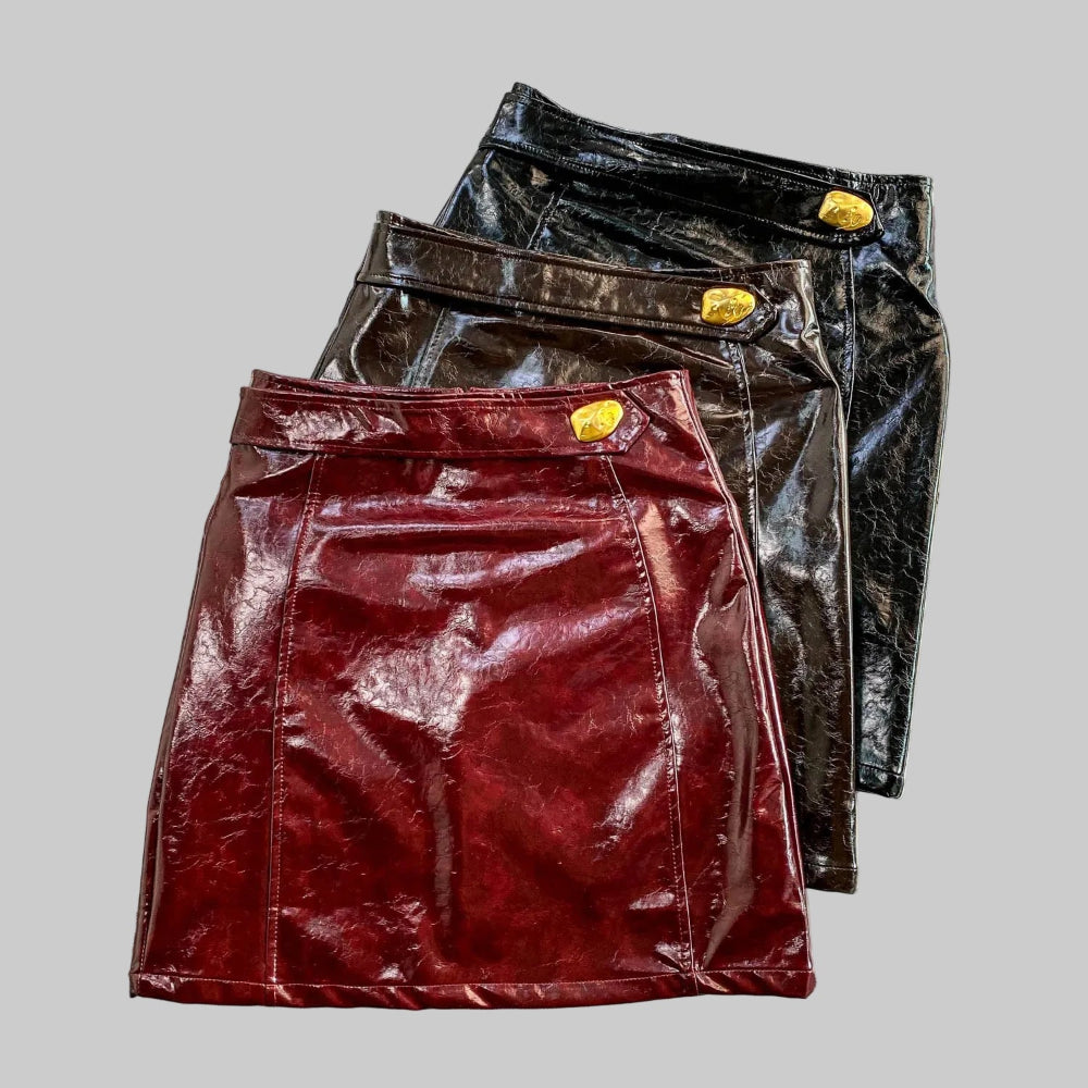 Elevate your wardrobe with the Trend4us Vintage Luxe Glossy Faux Leather Button Mini Skirt, a timeless statement piece infused with modern edge. Designed with a high-waisted silhouette and a rich high-shine faux leather finish, this skirt delivers structured elegance with a bold, fashion-forward attitude.