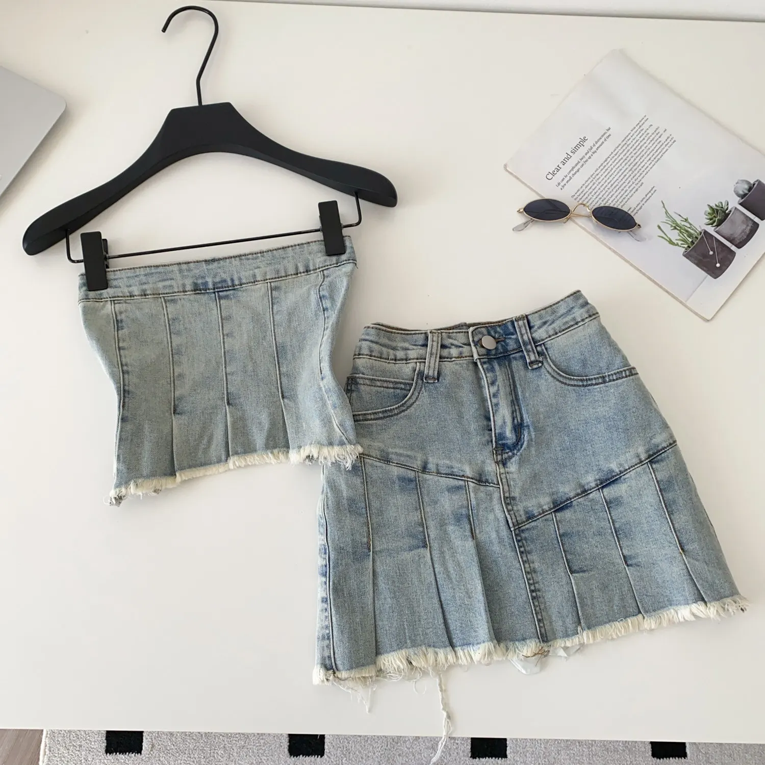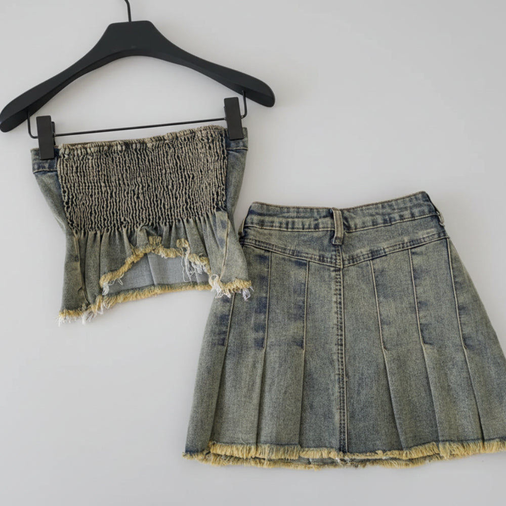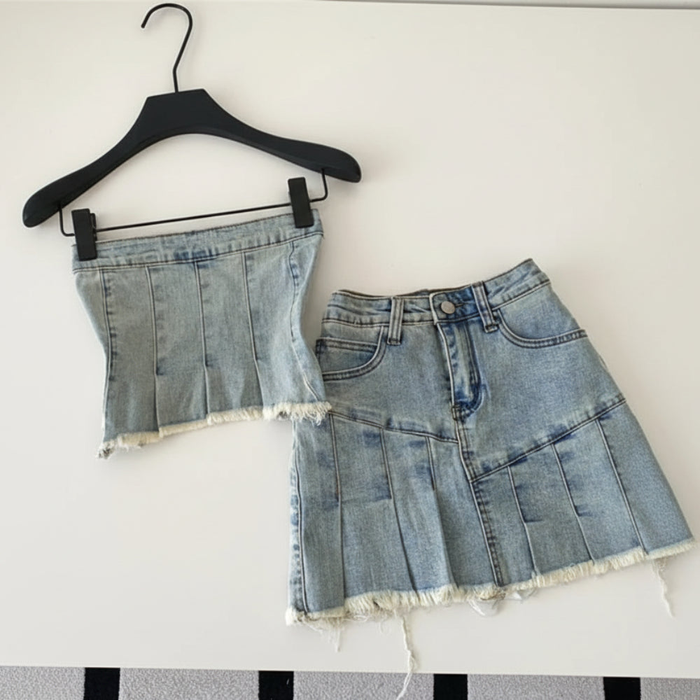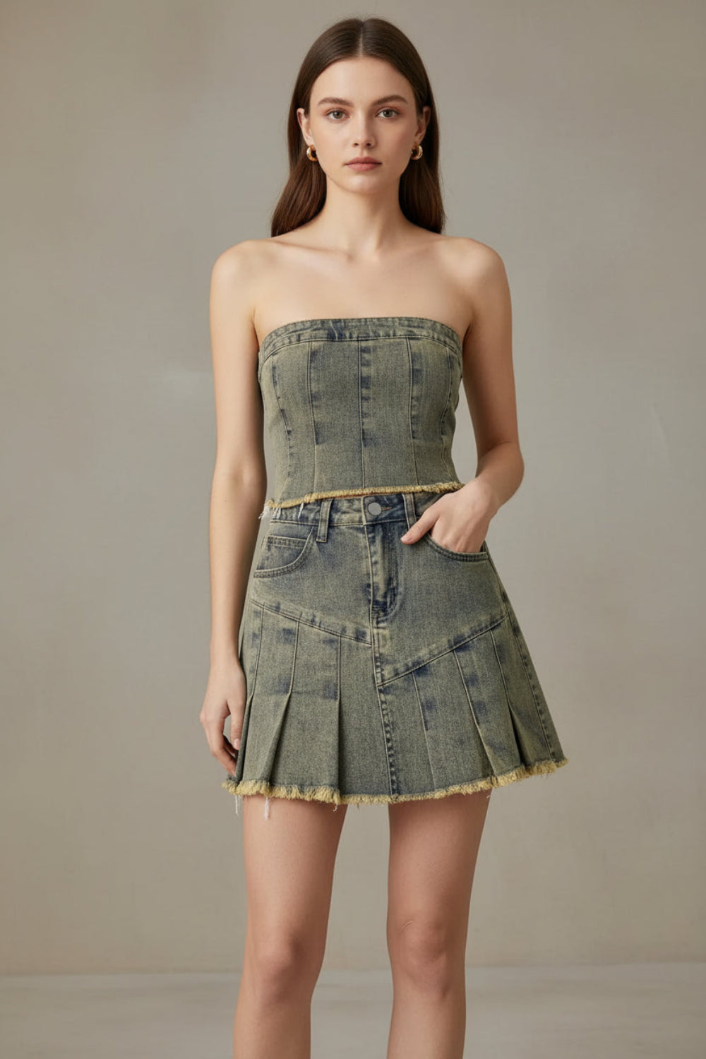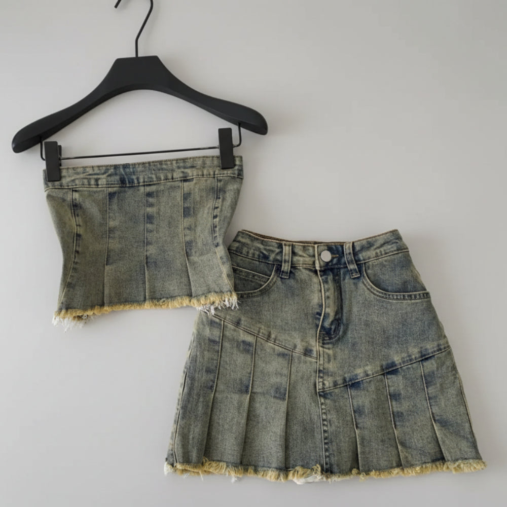 Trend4us Y2K Strapless Denim Tube Top & Pleated Mini Skirt Set