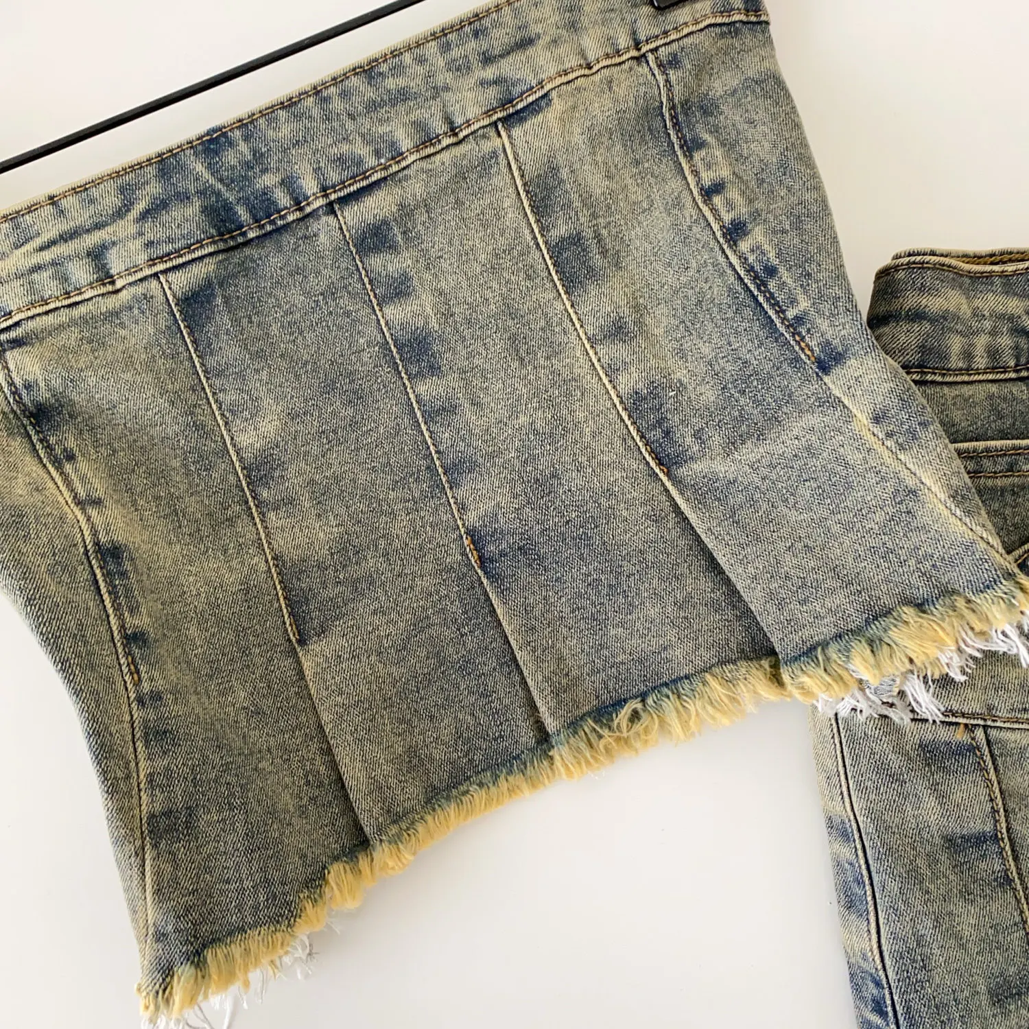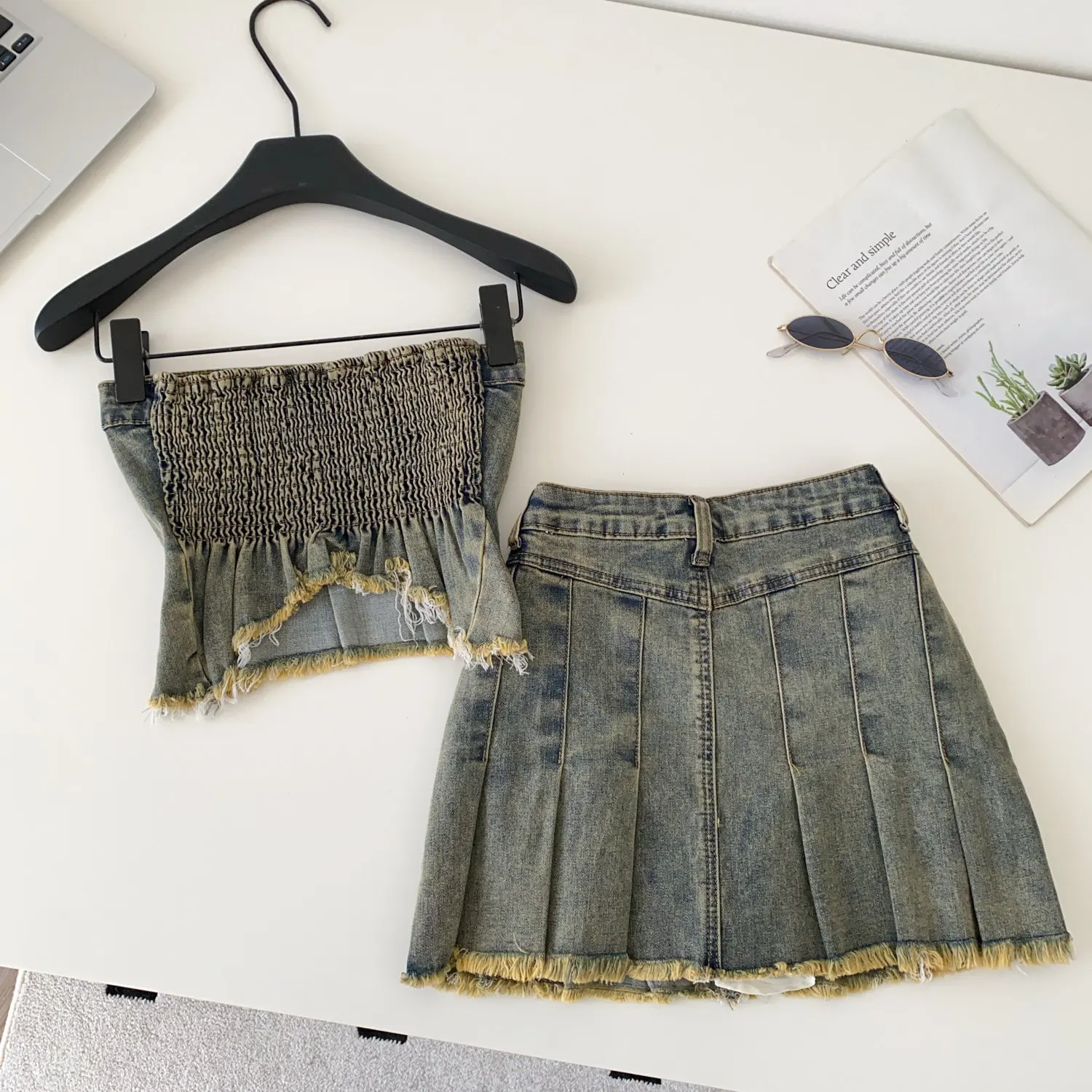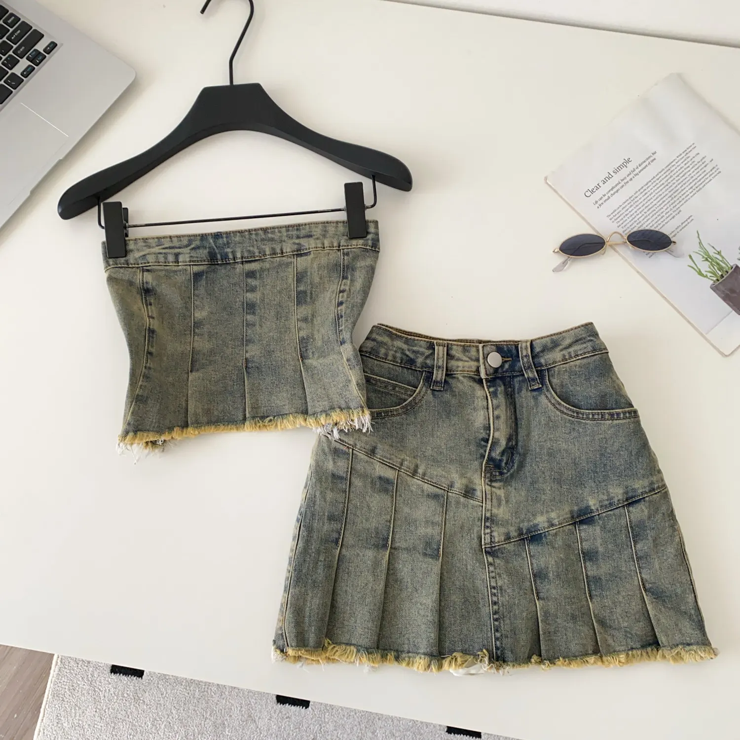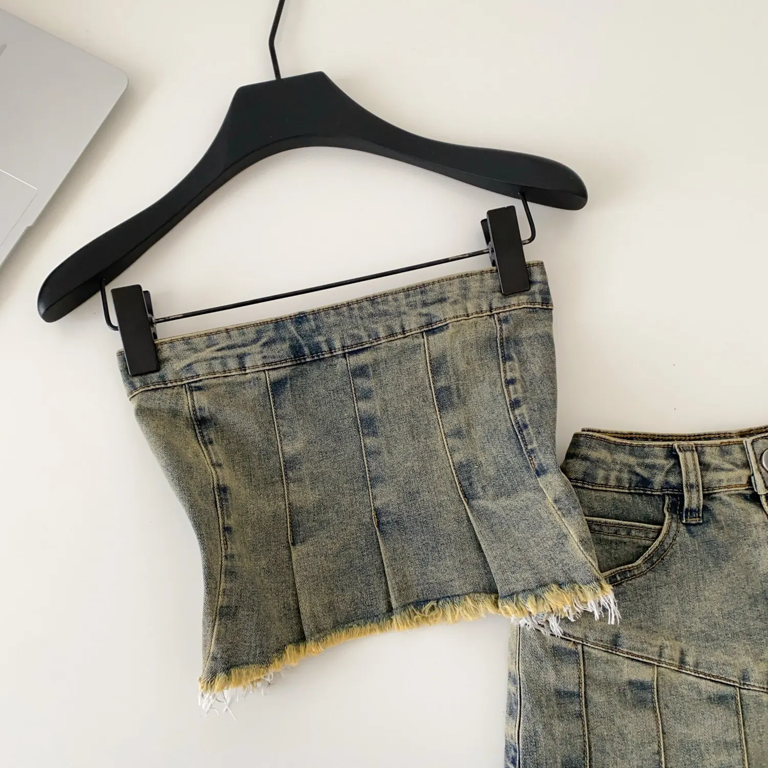 Trend4us Y2K Strapless Denim Tube Top & Pleated Mini Skirt Set