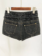Bottoms: High-waisted denim shorts with multiple zipper pockets and frayed edges