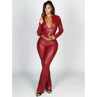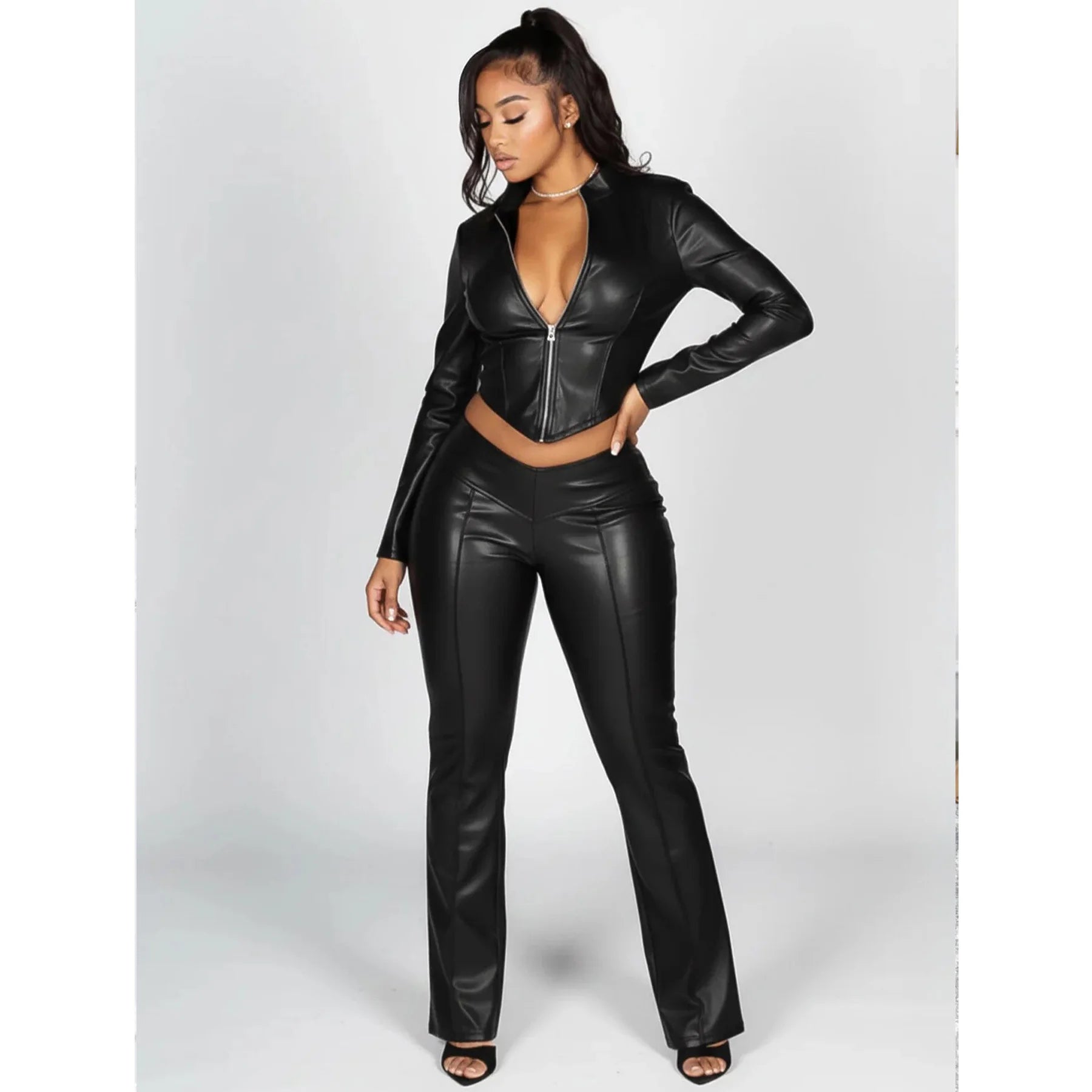 The cropped zip-up jacket features a plunging neckline that exudes allure, balanced by long fitted sleeves for a refined silhouette. The matching high-waisted pants elongate the legs with a flattering flare fit, ensuring a seamless, curve-hugging look from every angle.