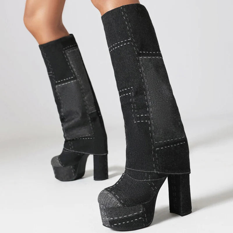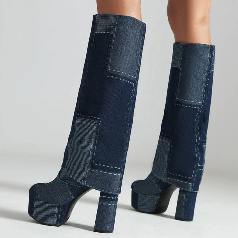 Trend4us Retro Patchwork Denim Platform Boots