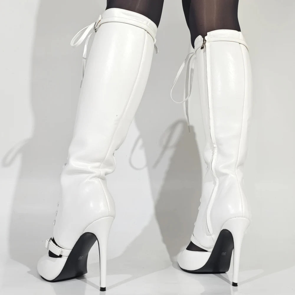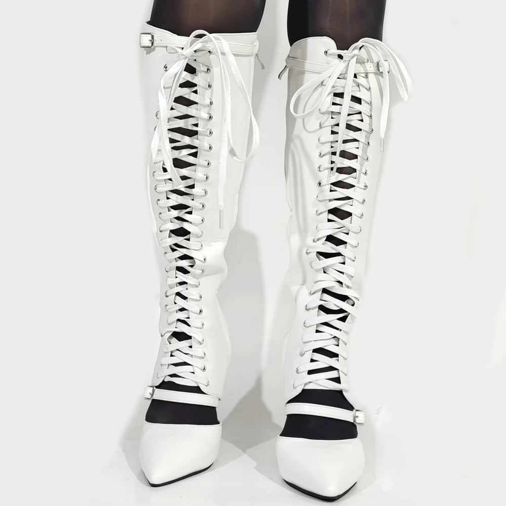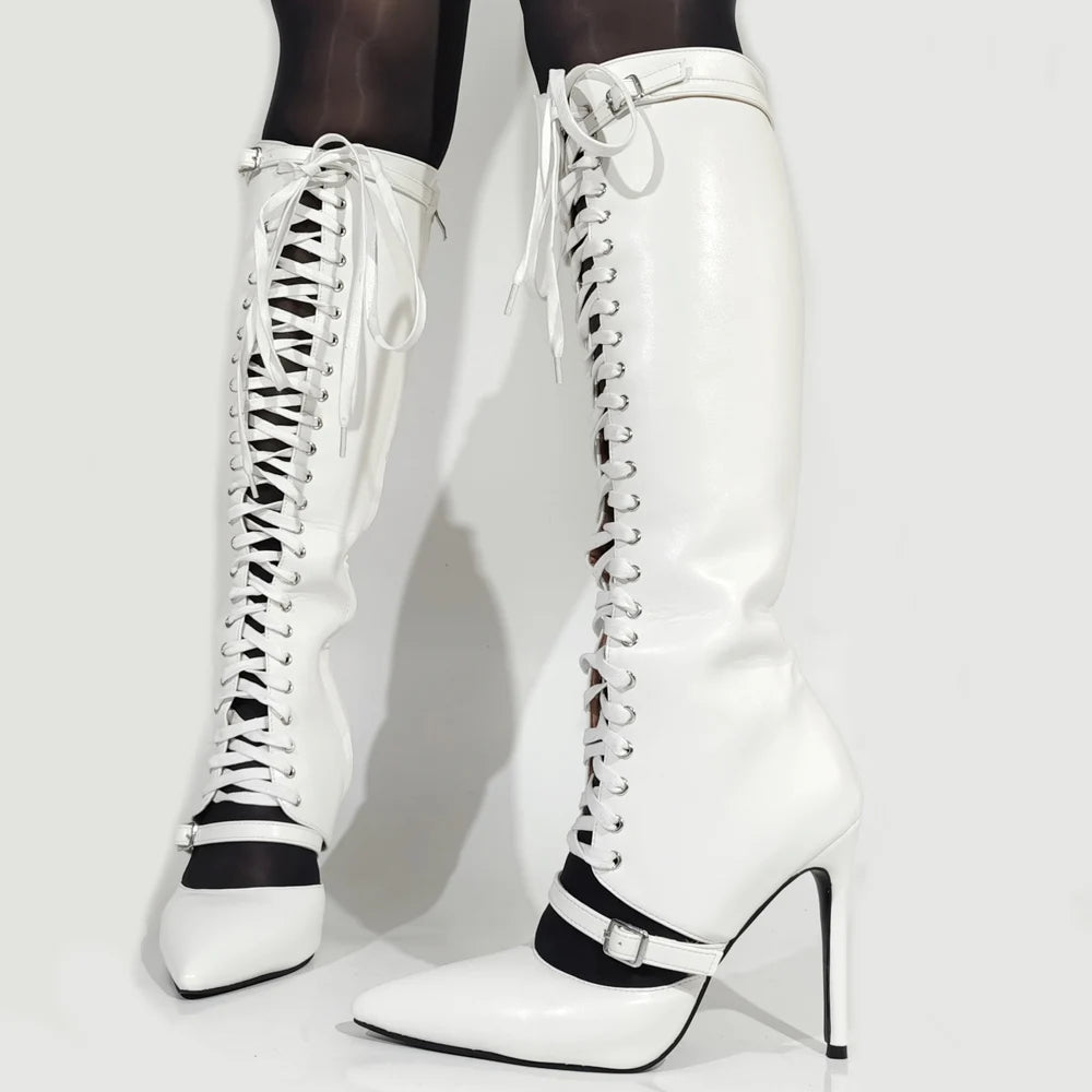 Trend4us Luxe Lace-Up Pointed-Toe Stiletto Knee-High Boots