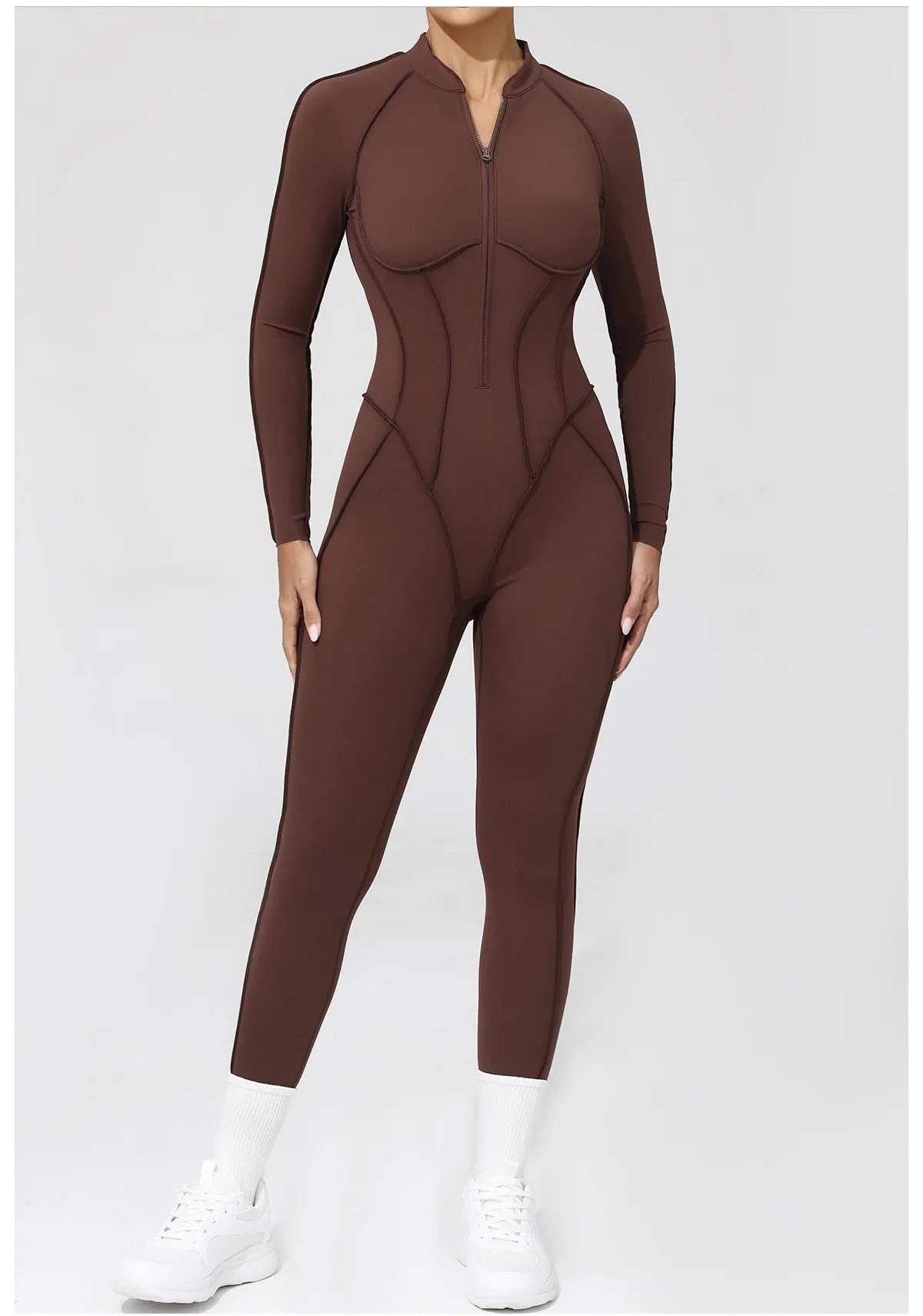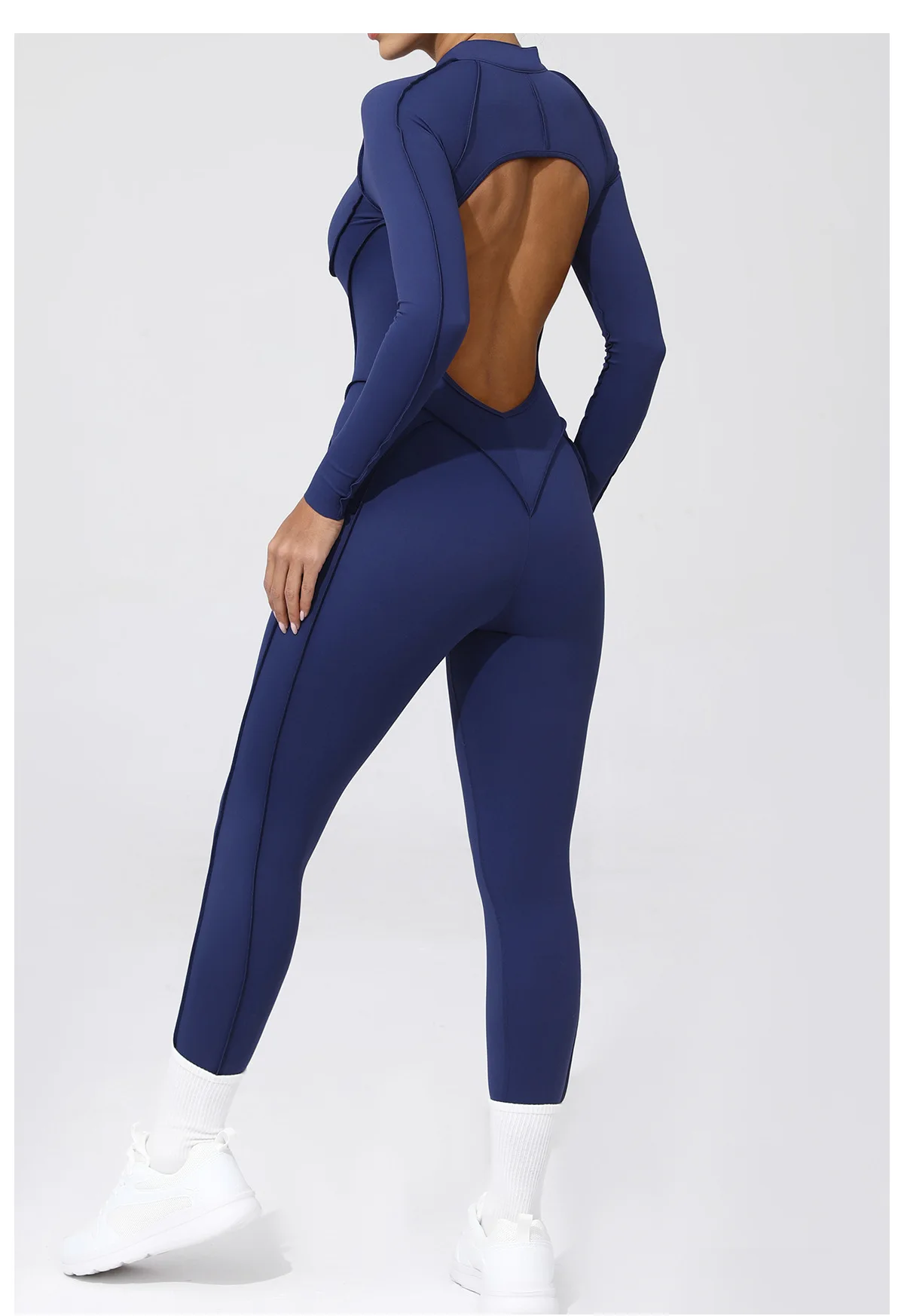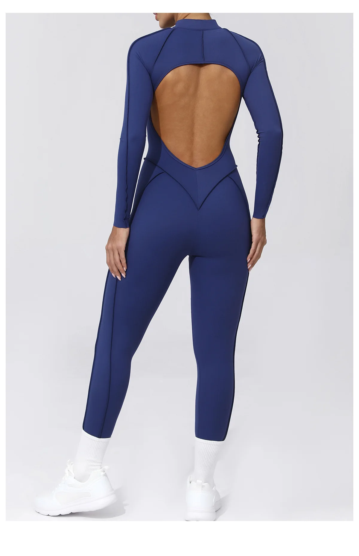 Turn heads while you train with the Trend4us Backless Long-Sleeve Zip-Up Activewear Jumpsuit. This sleek, form-fitting one-piece combines high-performance design with statement style, featuring a front zip closure for adjustable coverage and a bold open-back cutout for breathability. Crafted from a premium four-way stretch, moisture-wicking fabric, it offers sculpting support and complete freedom of movement, perfect for workouts, yoga, dance, or streetwear-inspired athleisure looks.