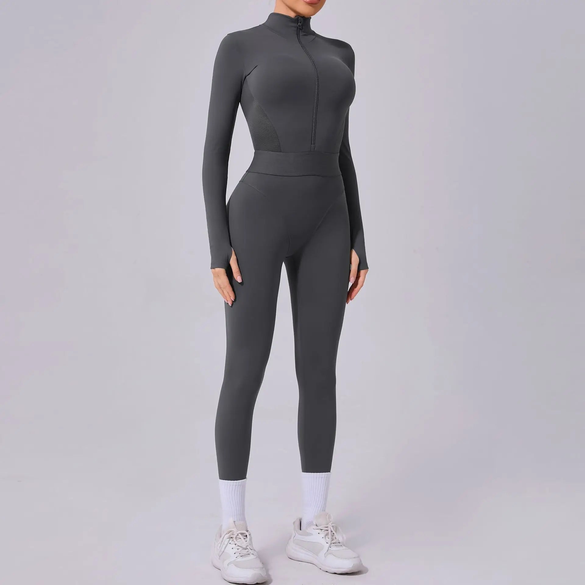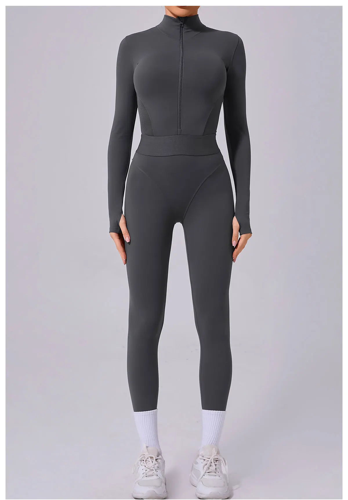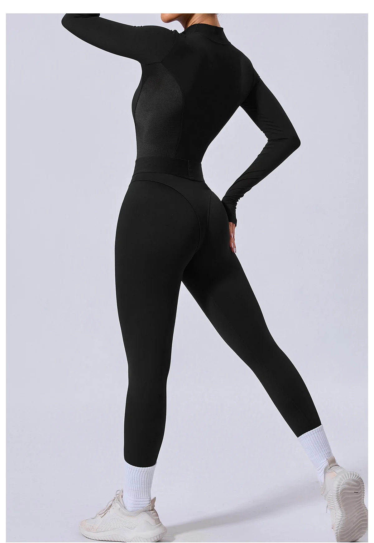 Design: Long sleeves with thumbholes, seamless body contouring, front zipper closure, high waistband