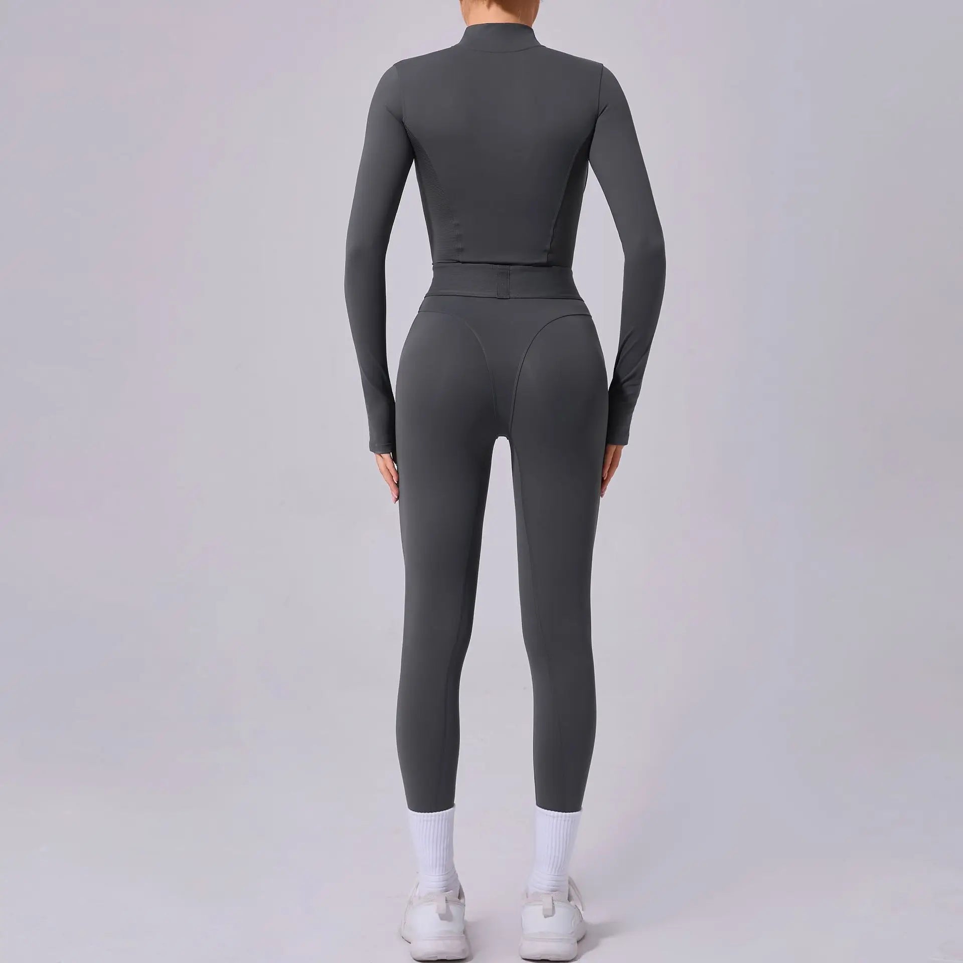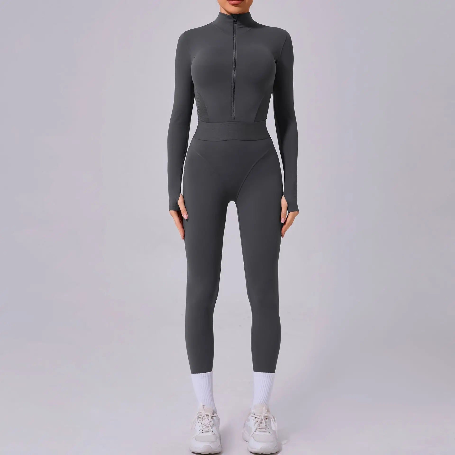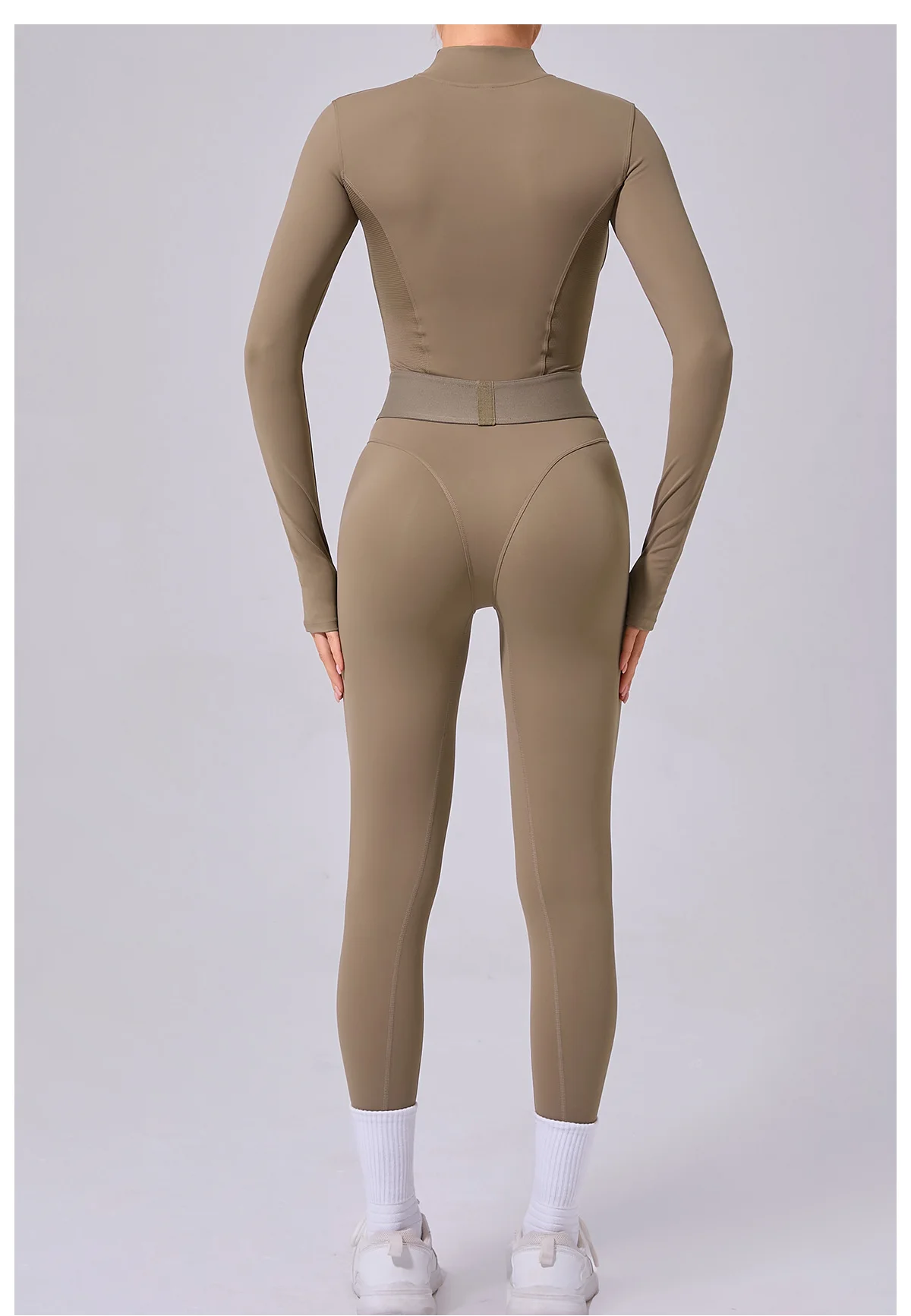 Design: Long sleeves with thumbholes, seamless body contouring, front zipper closure, high waistband