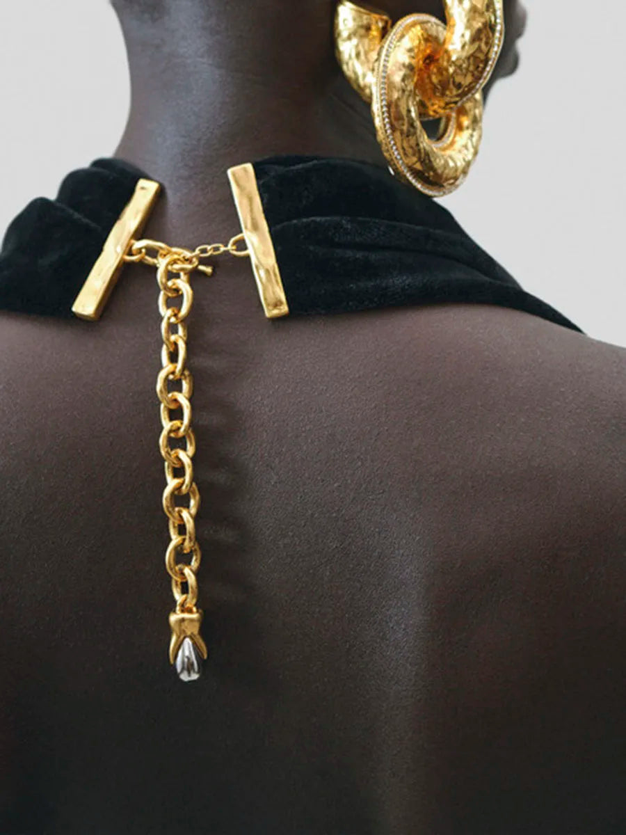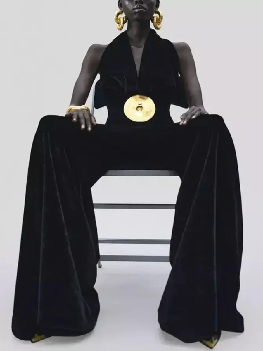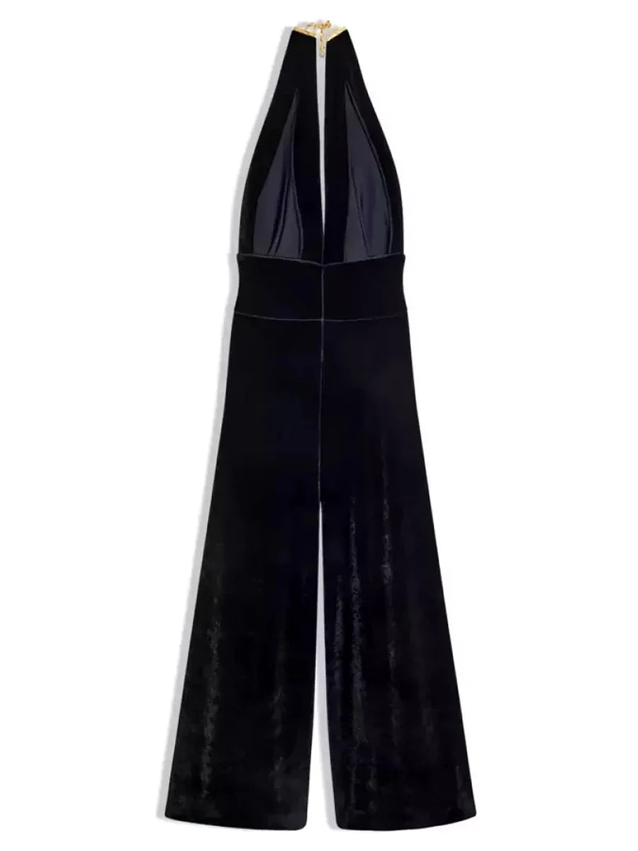 Command attention with the Trend4us Luxe Backless Halter Wide-Leg Jumpsuit — a striking blend of sophistication and modern glamour. Crafted from plush velvet, this statement jumpsuit features a daring halter neckline with a secure gold chain closure, a dramatic open-back design, and a sculpted waistband adorned with a bold gold medallion accent. The elongated wide-leg silhouette creates an effortlessly powerful and elegant look, perfect for red carpet events, galas, or upscale evening affairs.