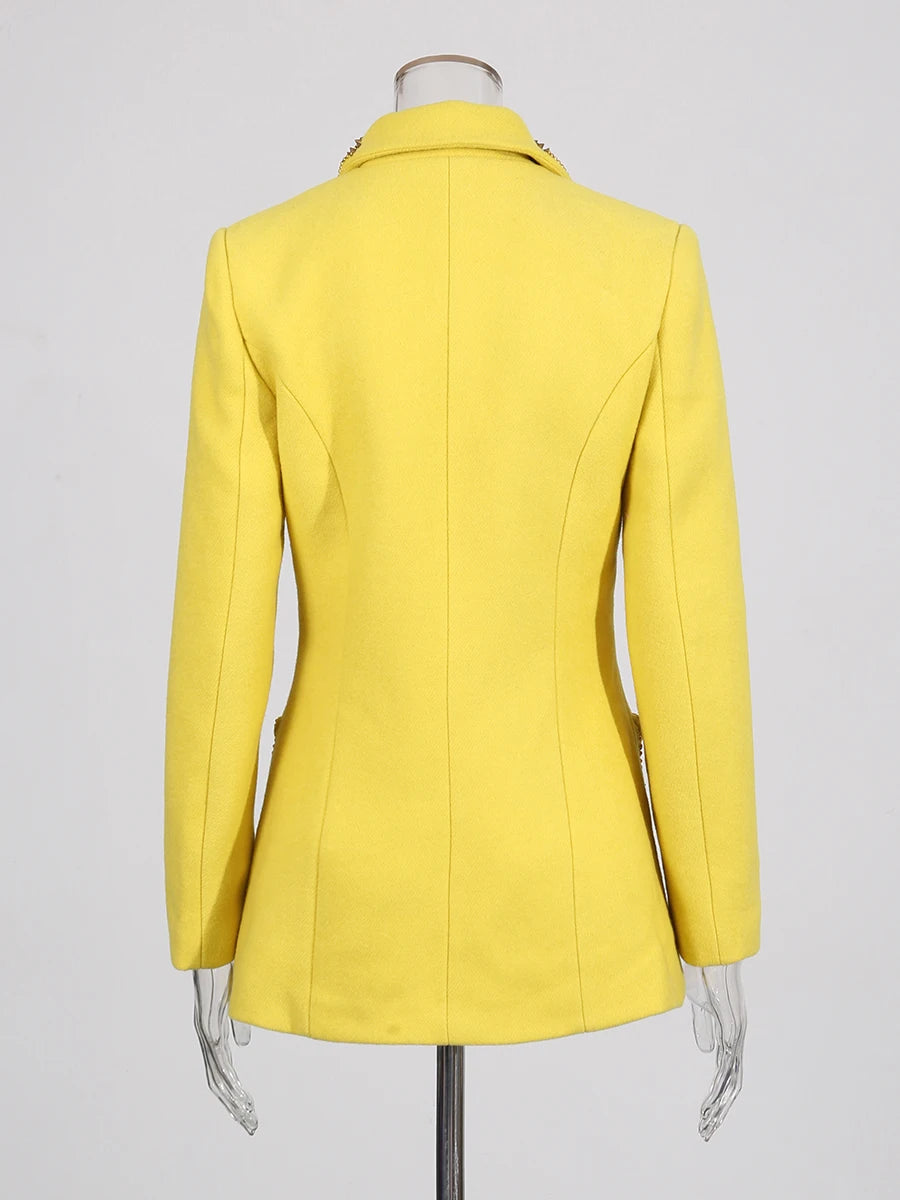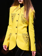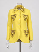 Command attention with the Trend4us Luxe Embellished Yellow Blazer, a radiant statement piece designed for bold sophistication. Crafted in a vibrant yellow hue, this tailored blazer features intricate beaded embellishments along the collar and pockets, adding an elevated touch of glamour. The structured silhouette with gold button closure exudes confidence and modern luxury, making it perfect for high-fashion moments, parties, or upscale events. Pair it with sleek trousers, skirts, or wear it as a standalone standout piece.