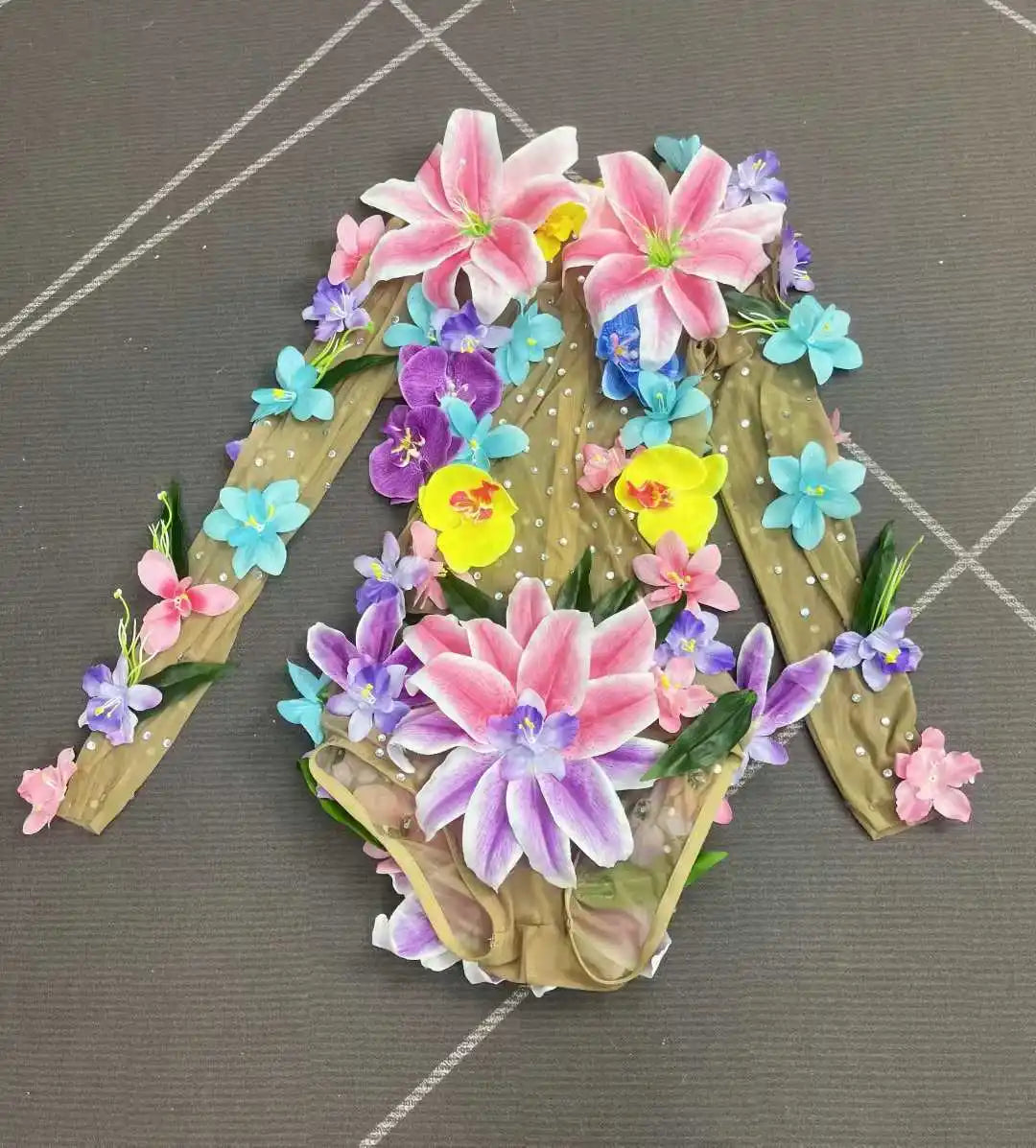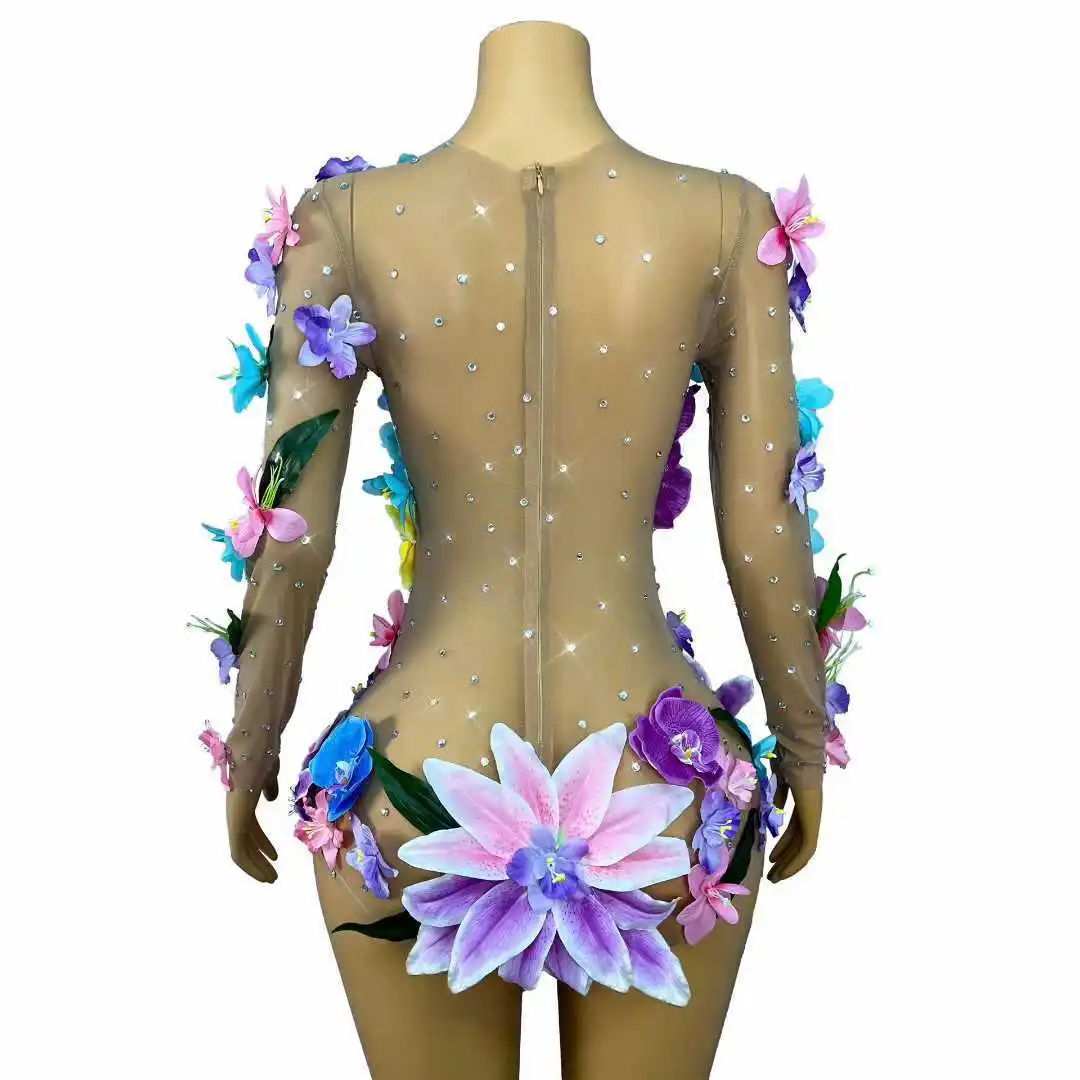 Every flower is meticulously positioned to accentuate curves while maintaining elegance and coverage. The long-sleeve transparent design brings a balance of sensuality and sophistication, while the hidden back zipper ensures a seamless, secure fit. Perfect for stage performances, fashion shoots, or avant-garde evenings — this piece is a statement of confidence, creativity, and luxury.