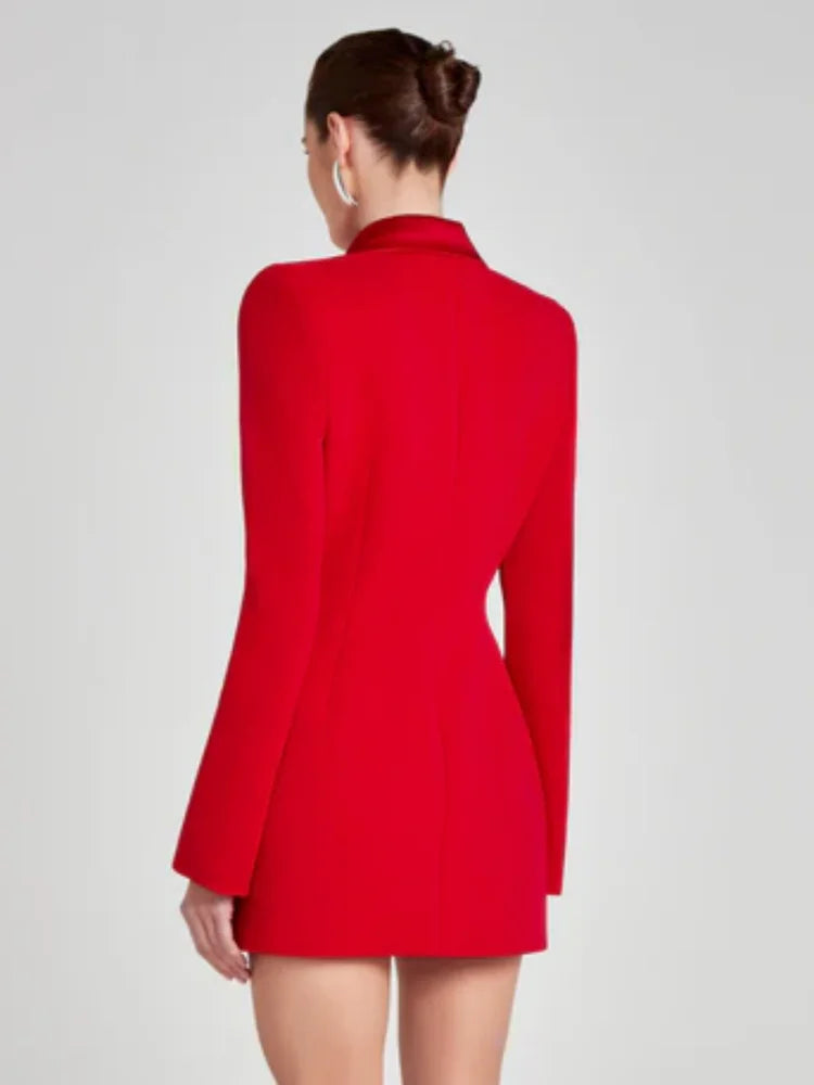 Expertly tailored to flatter, this striking mini blazer dress features a sharp double-breasted silhouette with tonal satin lapels and buttons for a luxurious finish. The structured shoulders and slim fit sculpt a confident, feminine shape that embodies both elegance and authority.